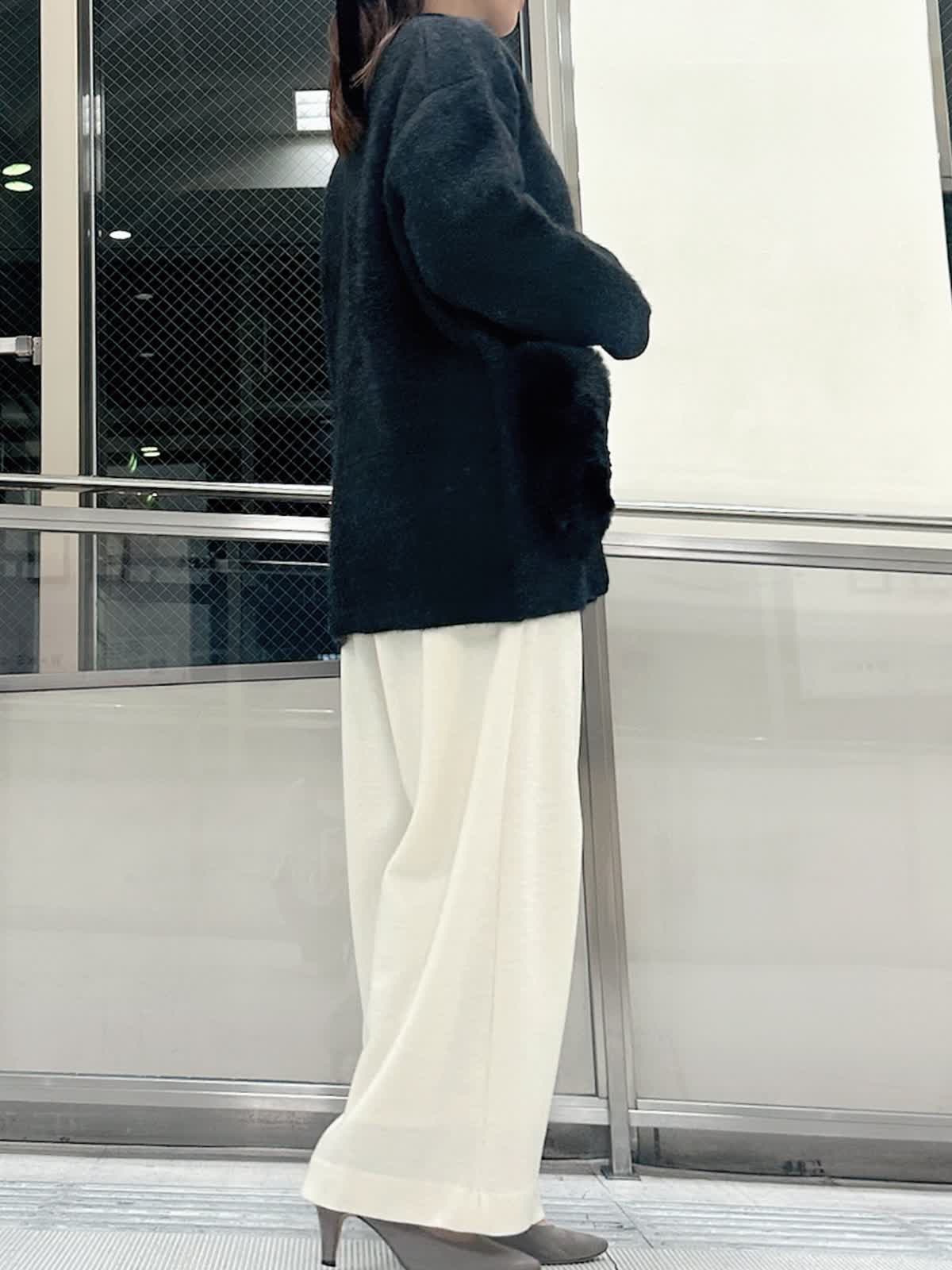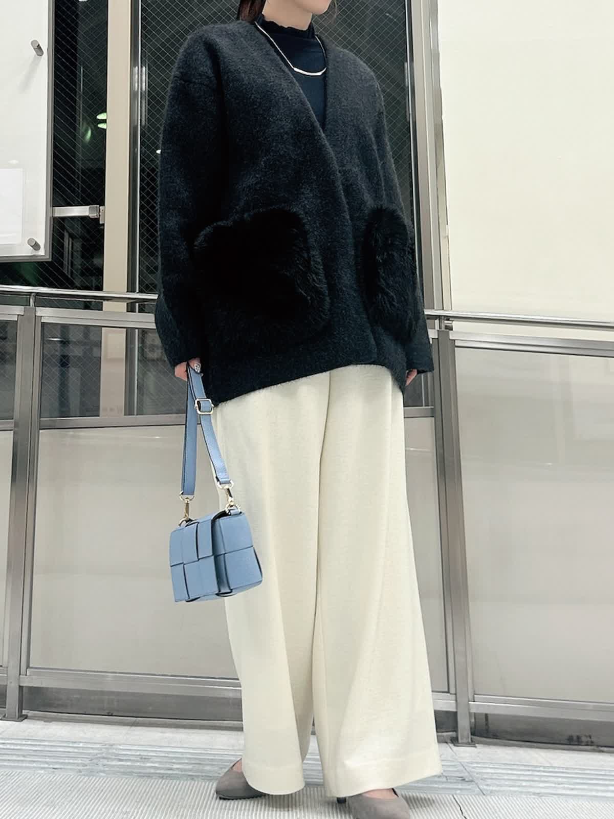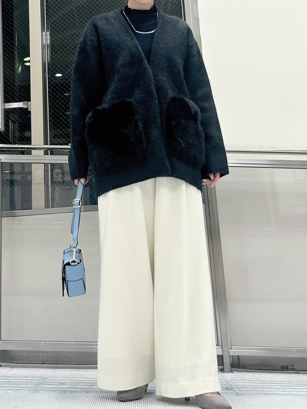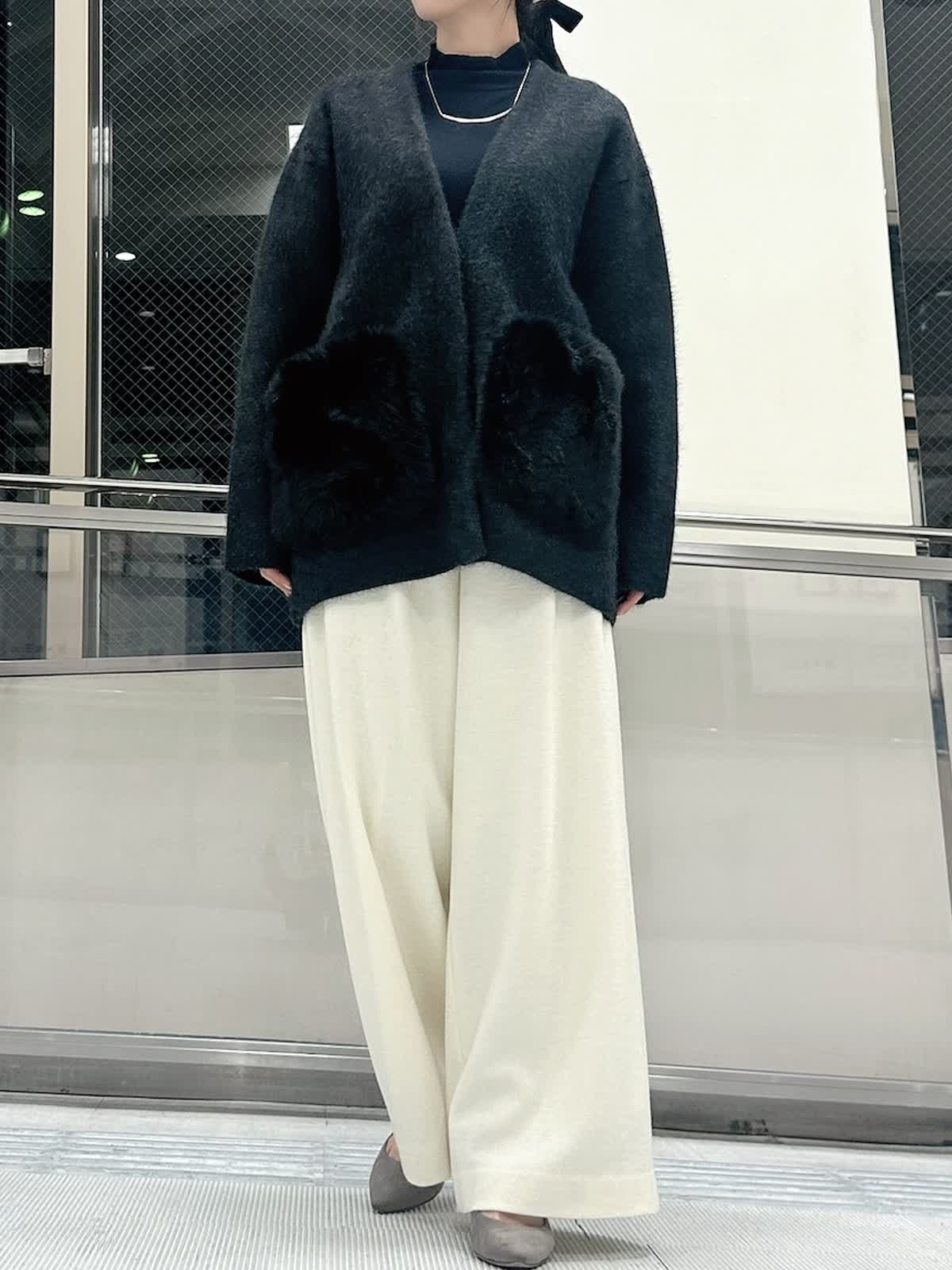 【着用サイズ/カラー】 ニットジャケット:フリー/チャコールグレー ニット:フリー/ネイビー パンツ:9号/オフホワイト 着回し力の高いチャコールグレーのニットジャケットは、ミドル丈でパンツと合わせてもヒップまで隠してくれる安心の1枚。コートよりも気負わず着られるのでデイリー使いに重宝します。 定番シルエットもふわふわのファーポケットで、羽織るだけで大人かわいいコーデが完成します。