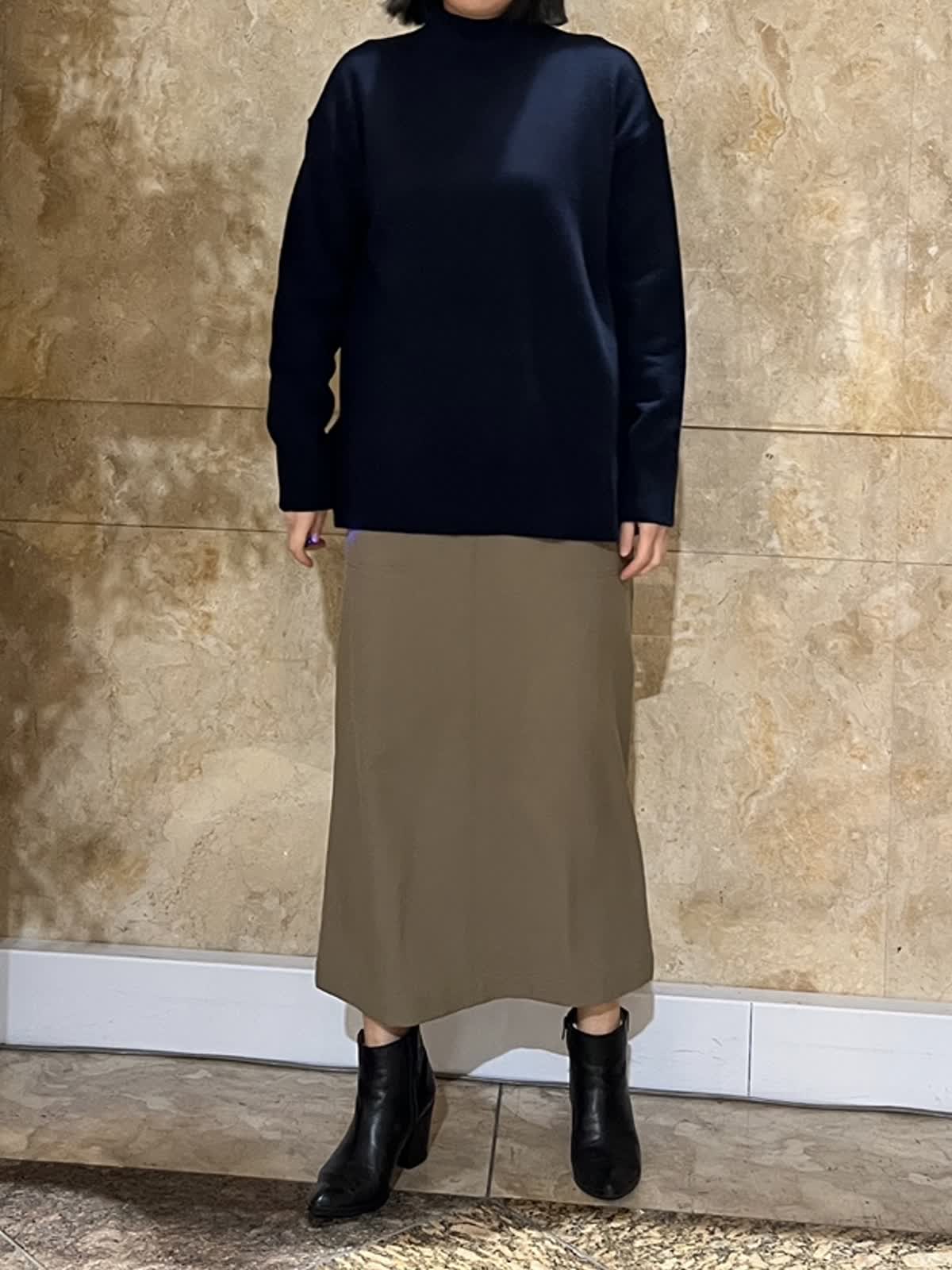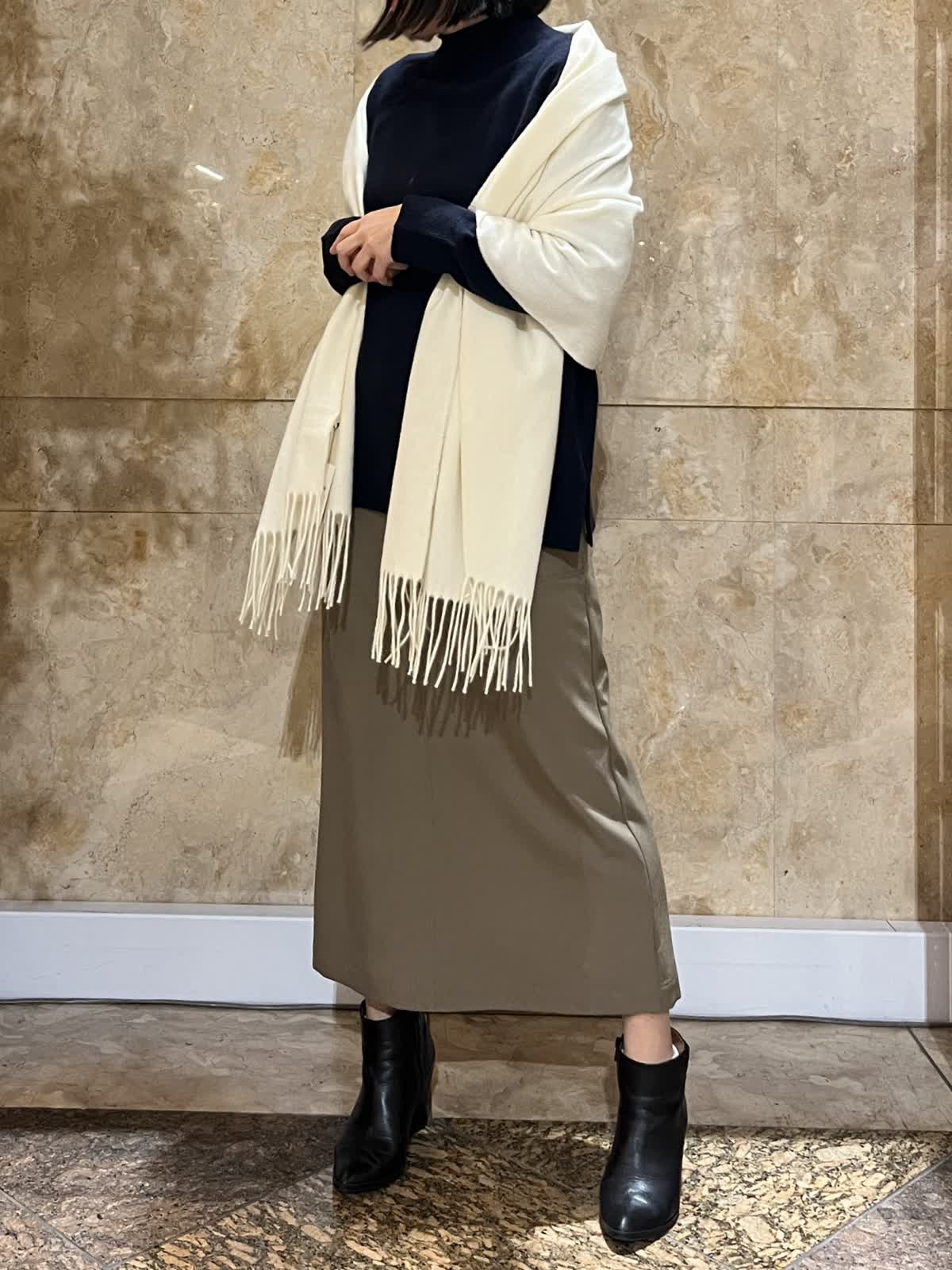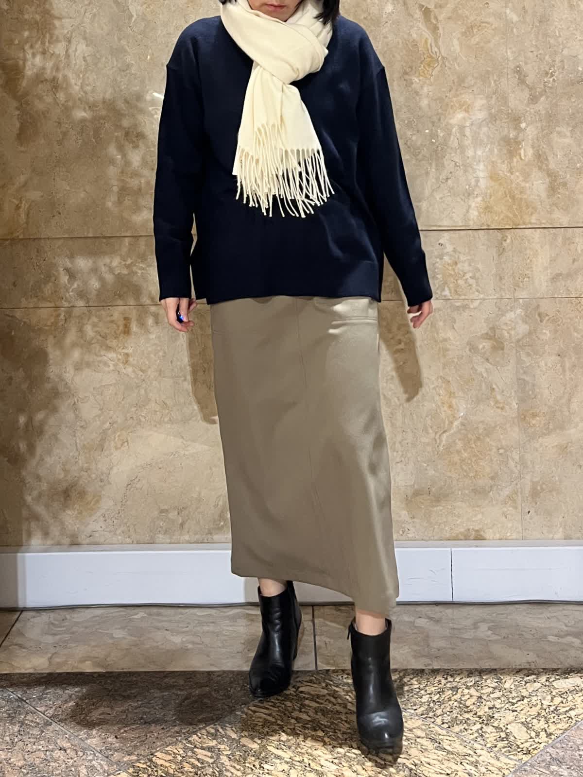 【着用サイズ/カラー】ニット:フリーサイズ/ネイビー スカート:9号/モカチャ ストール/ホワイト お尻周りもカバーできて万能セーターはカラーバリエーション豊富。シンプルなセーターにシンプルなスカートを合わせストールでポイントをつけました。 スカートはポリエステル100%で静電気が起こりやすいので静電気防止スプレーがあると安心です。