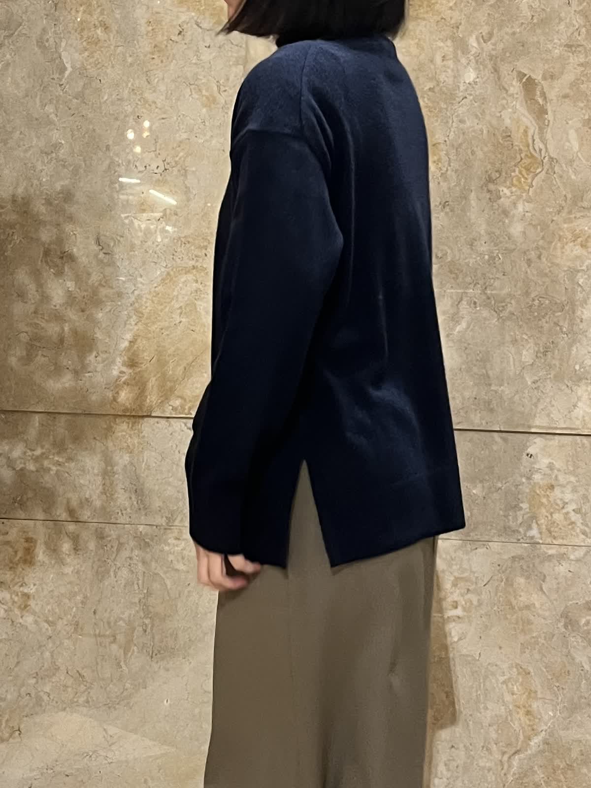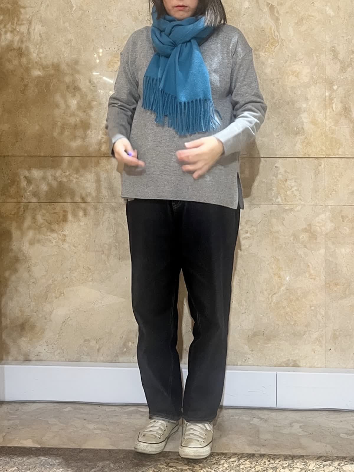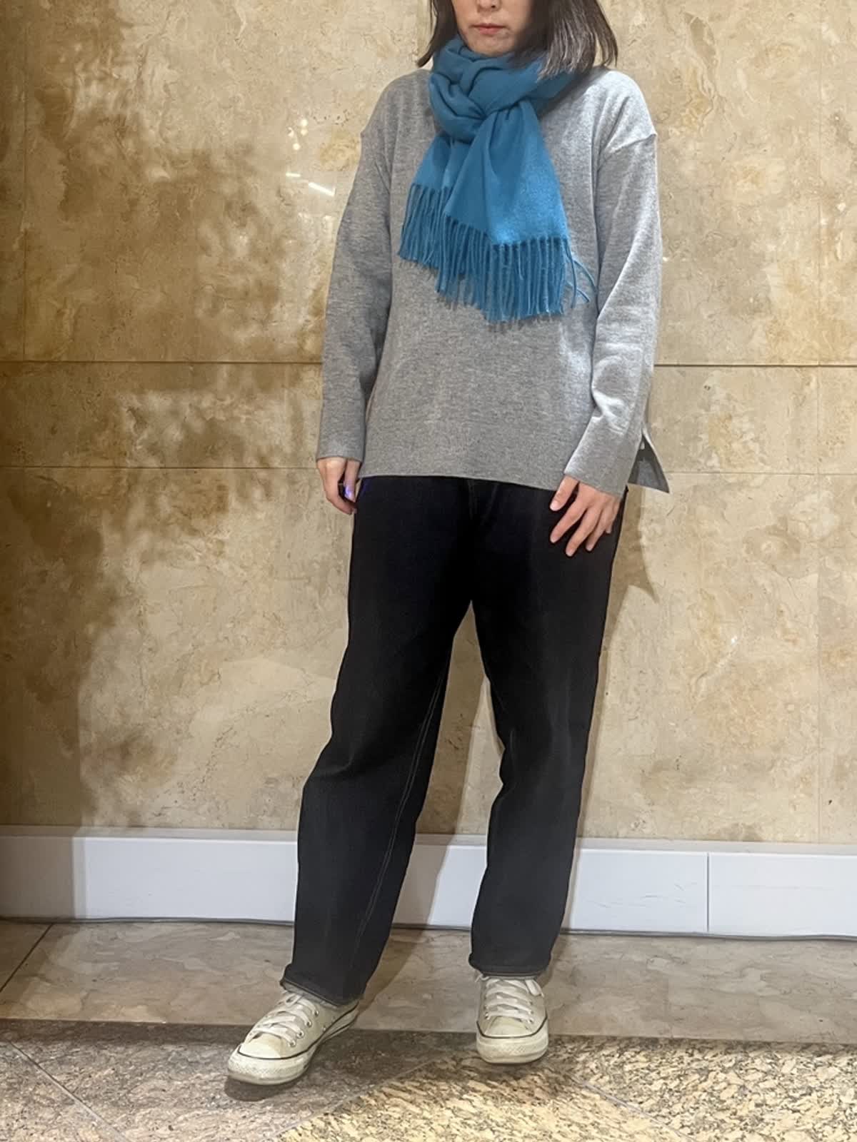 【着用サイズ/カラー】ニット:フリーサイズ/ネイビー スカート:9号/モカチャ ストール/ホワイト お尻周りもカバーできて万能セーターはカラーバリエーション豊富。シンプルなセーターにシンプルなスカートを合わせストールでポイントをつけました。 スカートはポリエステル100%で静電気が起こりやすいので静電気防止スプレーがあると安心です。