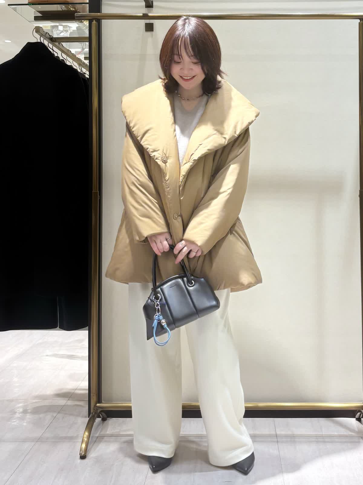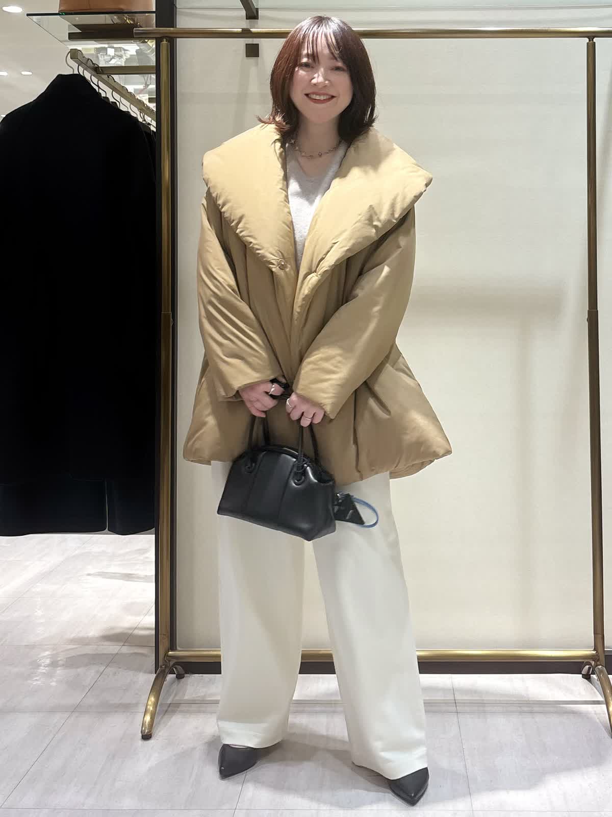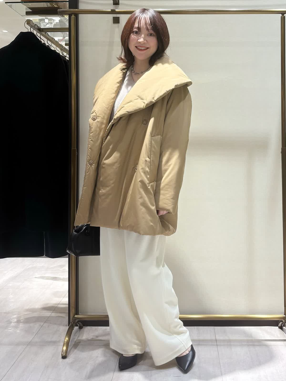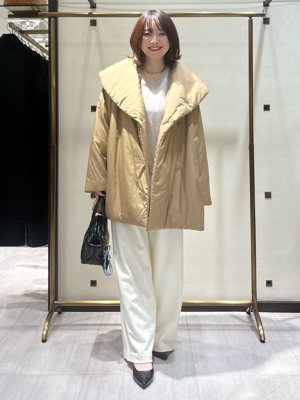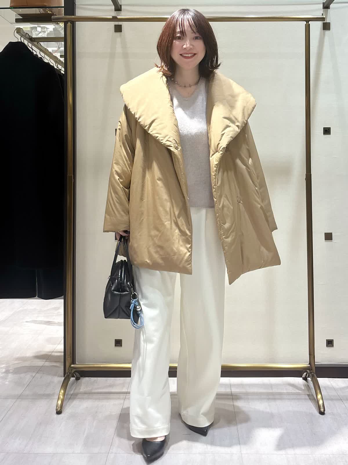 【着用カラー】 コート:キャメル ニット:グレーベージュ パンツ:アイボリー 【着用サイズ】 全て9号 包み込むようなショールカラーが印象的な中綿コートを主役にした、上品カジュアルスタイル。 インナーには、ふんわりとした毛足と上質な風合いが魅力のチャイニーズラクーンニットを合わせ、見た目にも着心地にもあたたかさをプラス。 ホワイトパンツで軽さを出すことで、冬の淡色コーデも重たくならず、洗練された大人の抜け感を演出します。