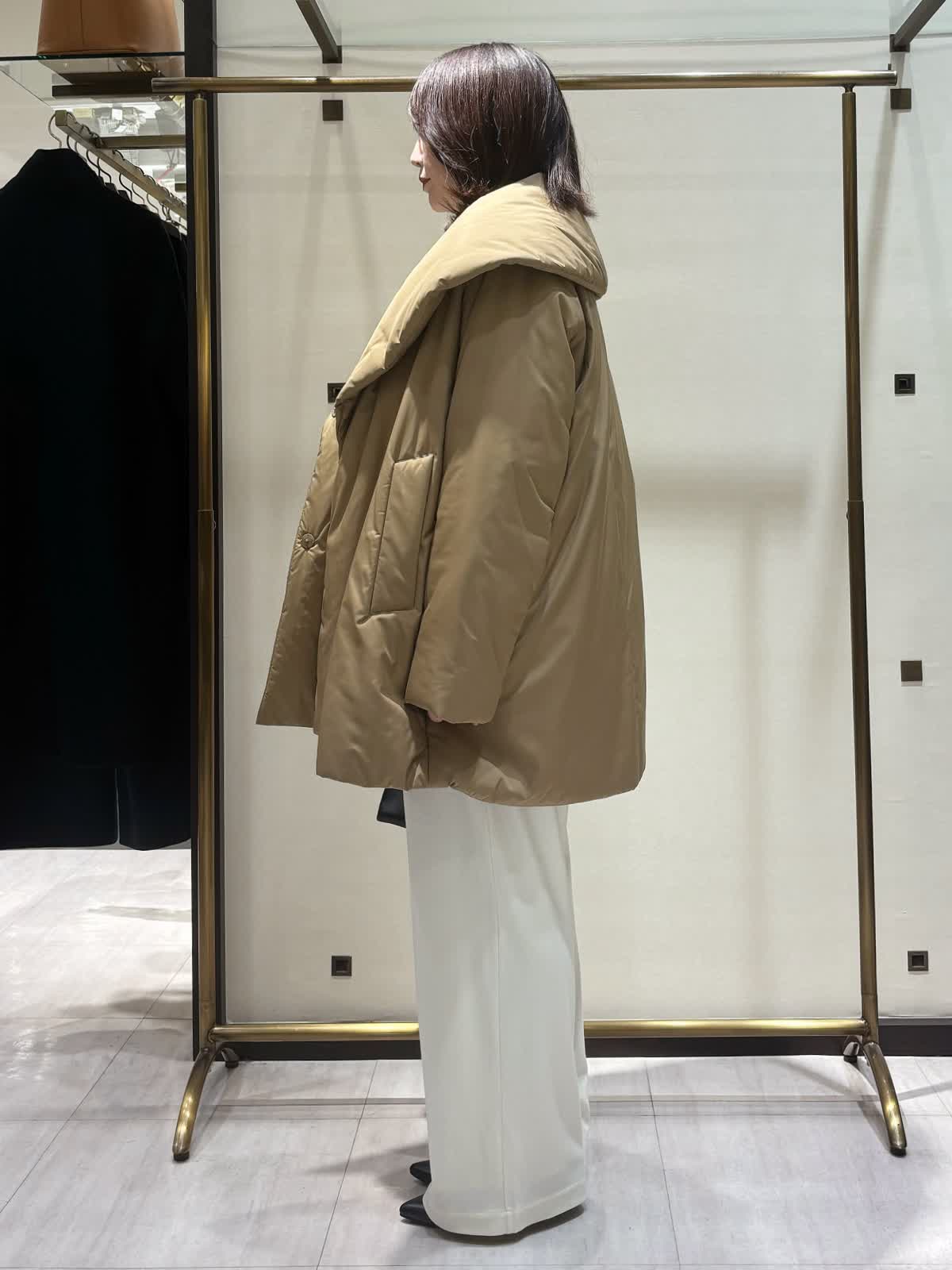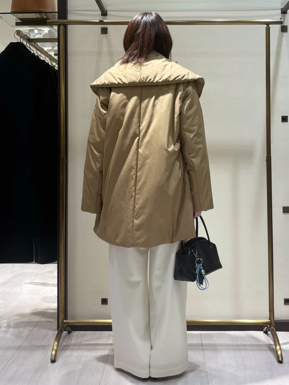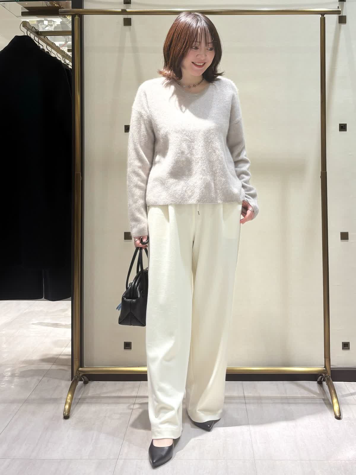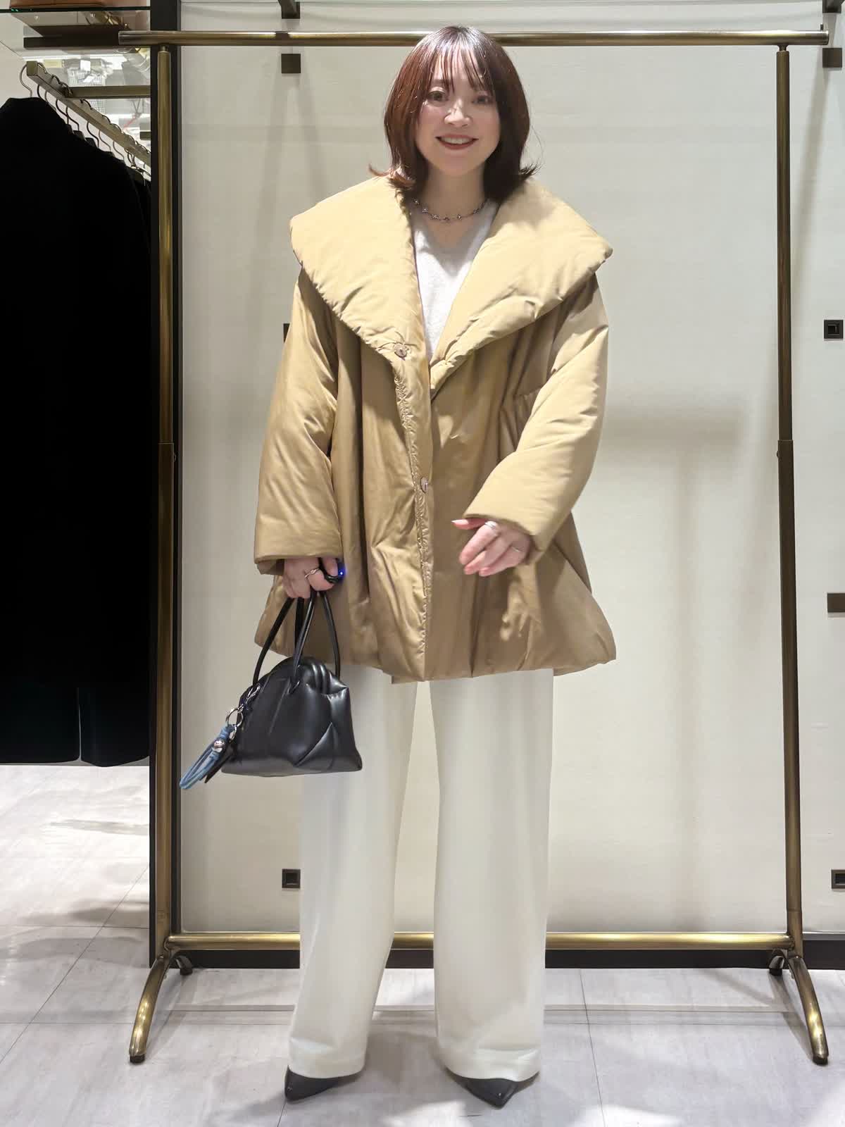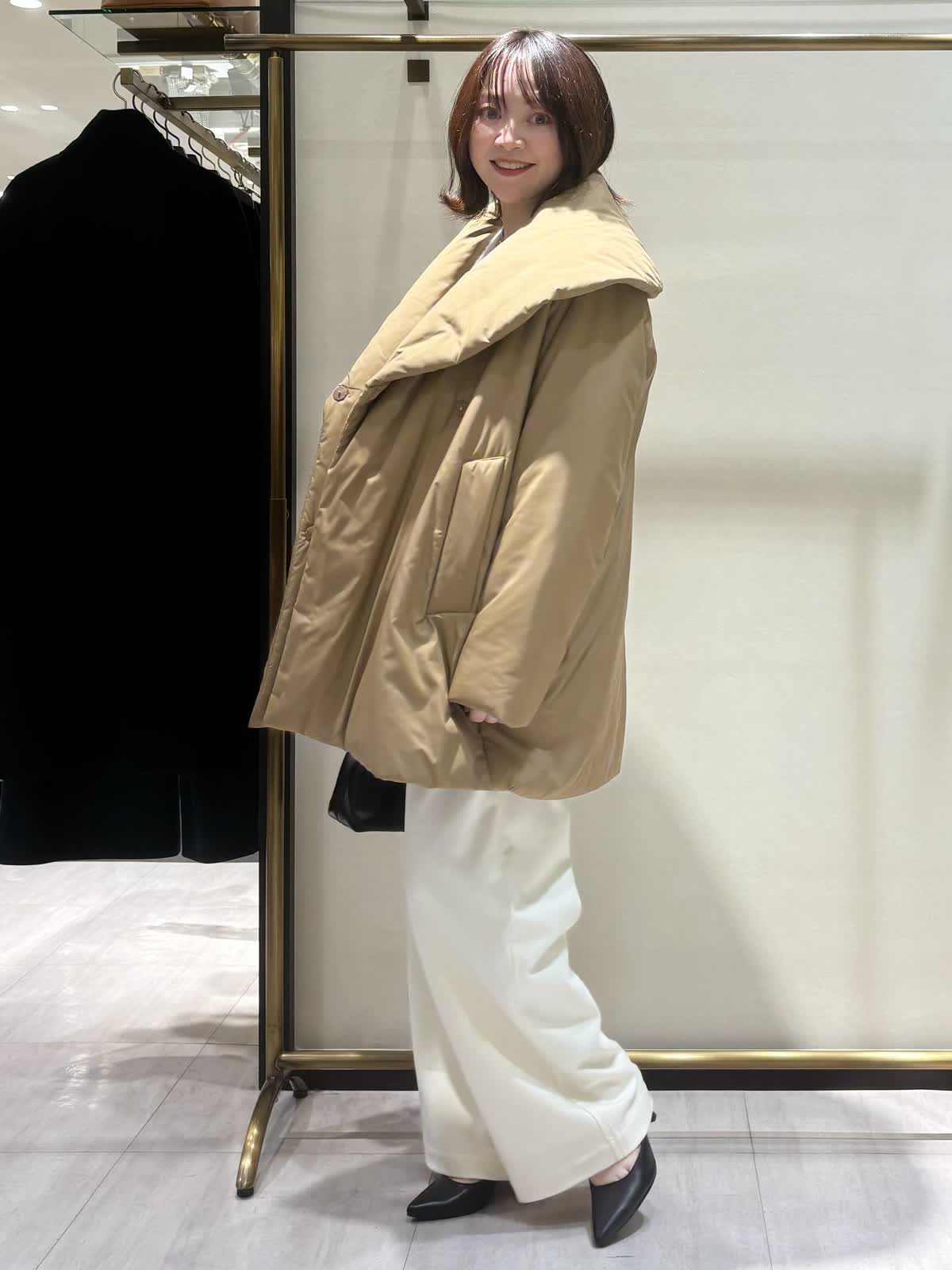 【着用カラー】 コート:キャメル ニット:グレーベージュ パンツ:アイボリー 【着用サイズ】 全て9号 包み込むようなショールカラーが印象的な中綿コートを主役にした、上品カジュアルスタイル。 インナーには、ふんわりとした毛足と上質な風合いが魅力のチャイニーズラクーンニットを合わせ、見た目にも着心地にもあたたかさをプラス。 ホワイトパンツで軽さを出すことで、冬の淡色コーデも重たくならず、洗練された大人の抜け感を演出します。