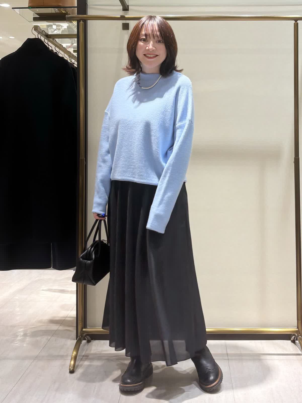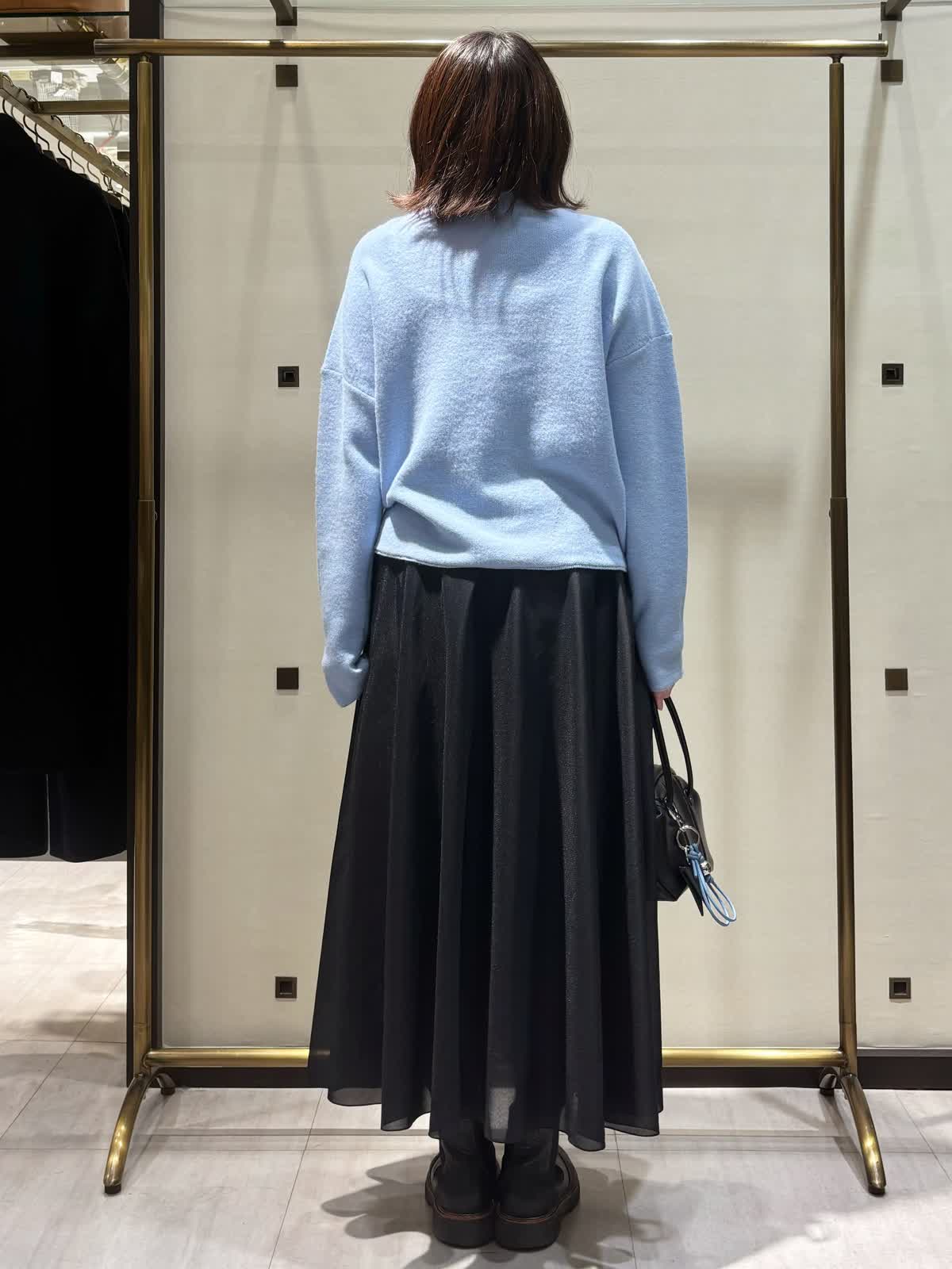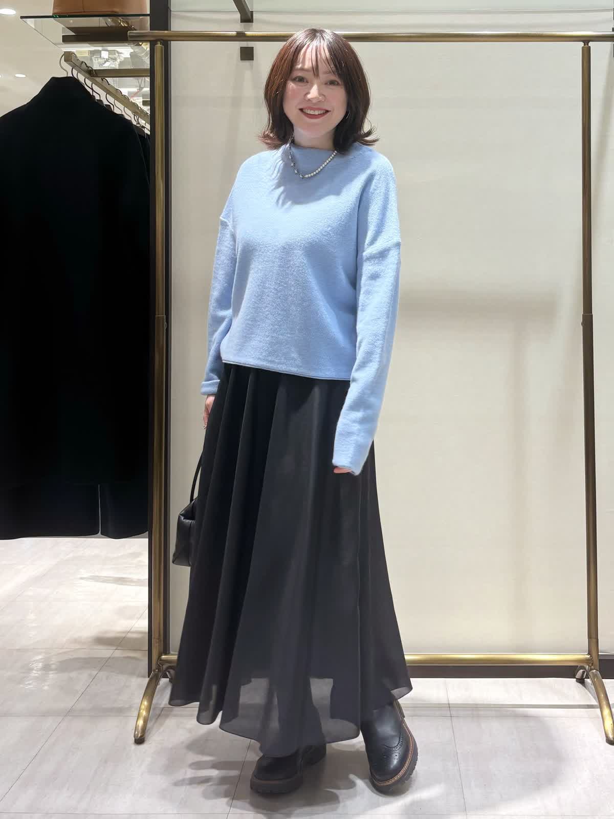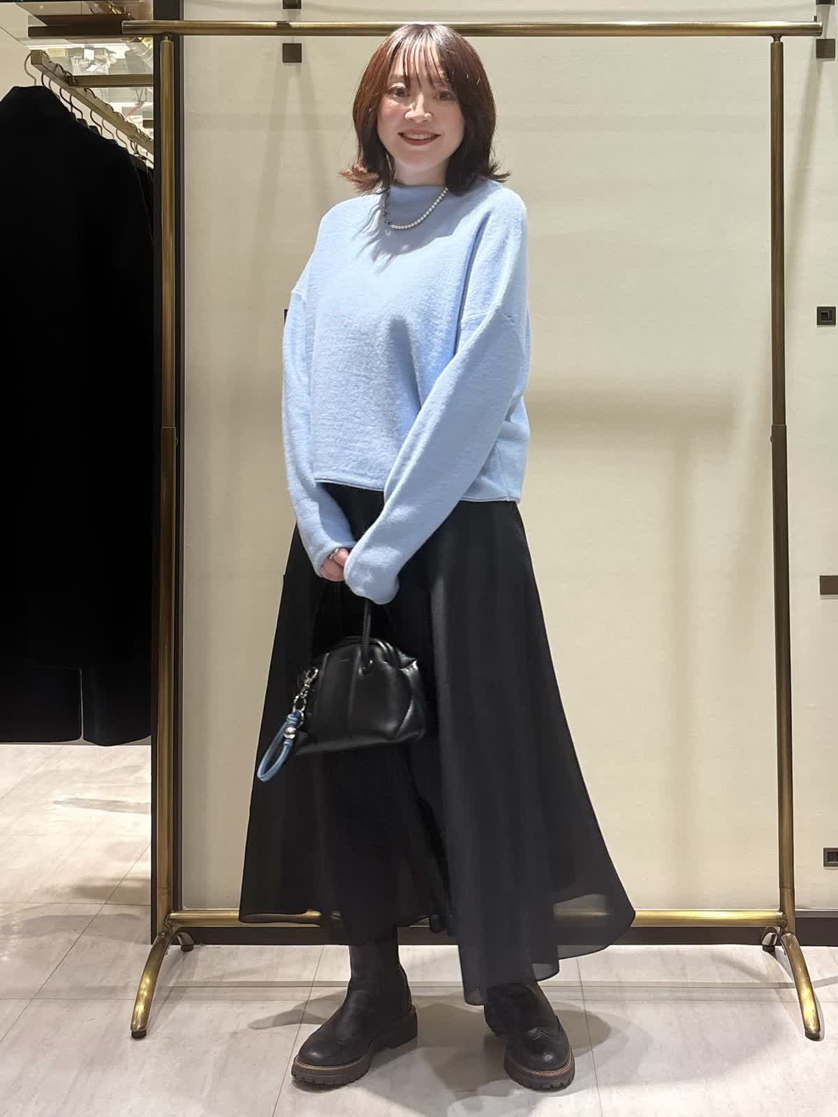 【着用カラー】 ニット:サックス スカート:ブラック 【着用サイズ】 全て9号 やわらかなブルーが映えるニットを主役にした、上品で女性らしいスタイリング。 軽やかな落ち感のあるブラックスカートを合わせることで、甘さを抑えつつ大人のバランスに仕上げました。 シンプルながらも配色で季節感を楽しめる、通勤からお出かけまで幅広く活躍するコーディネートです。
