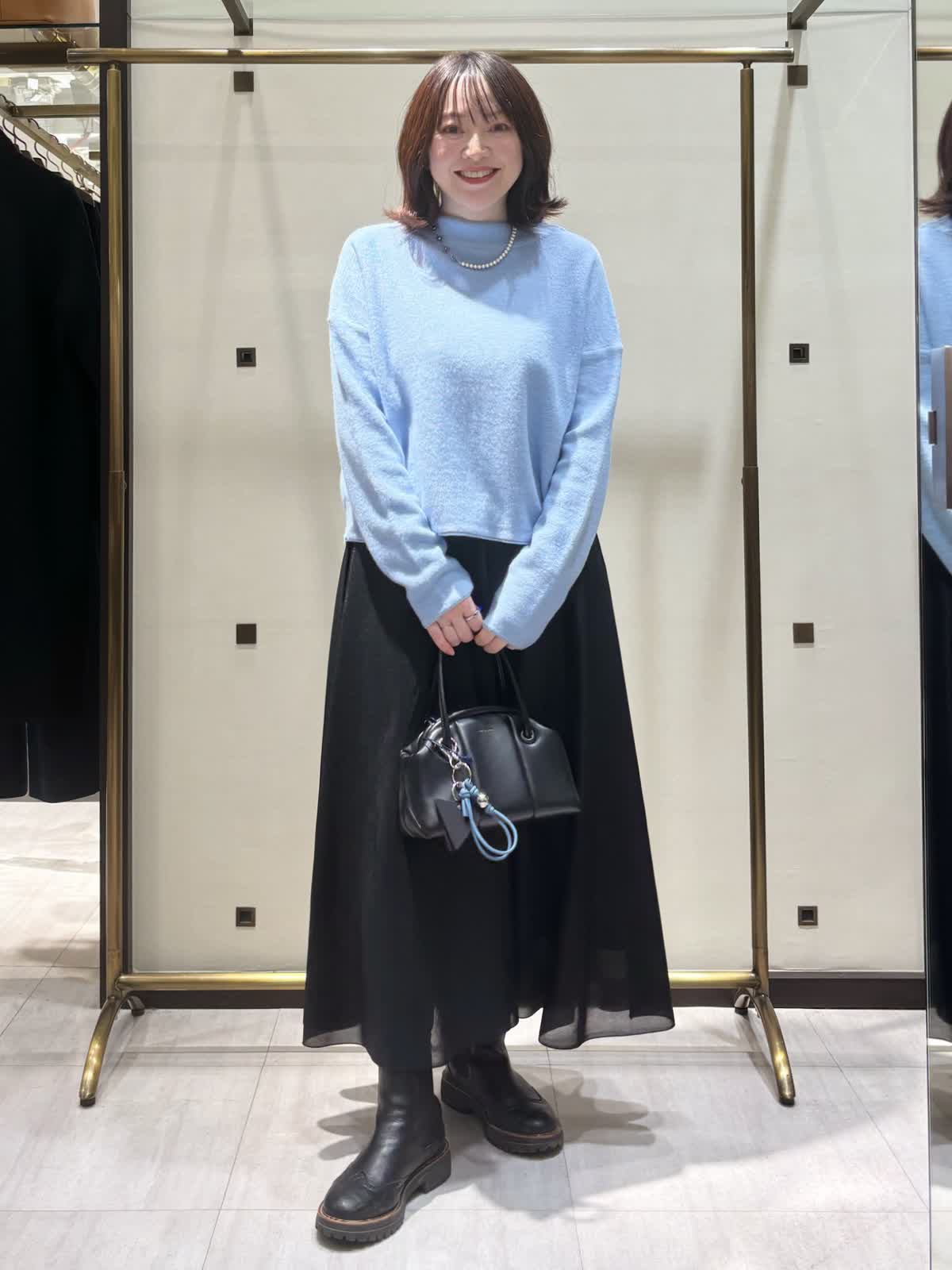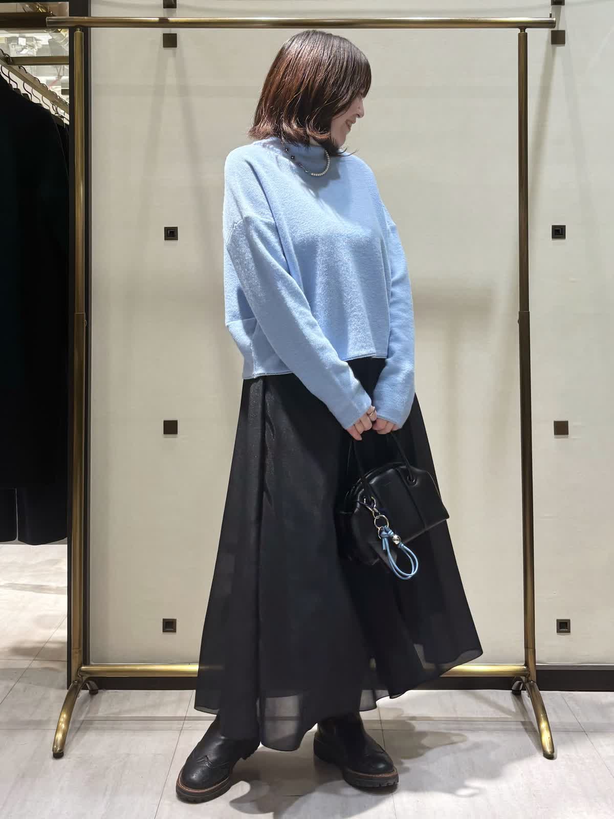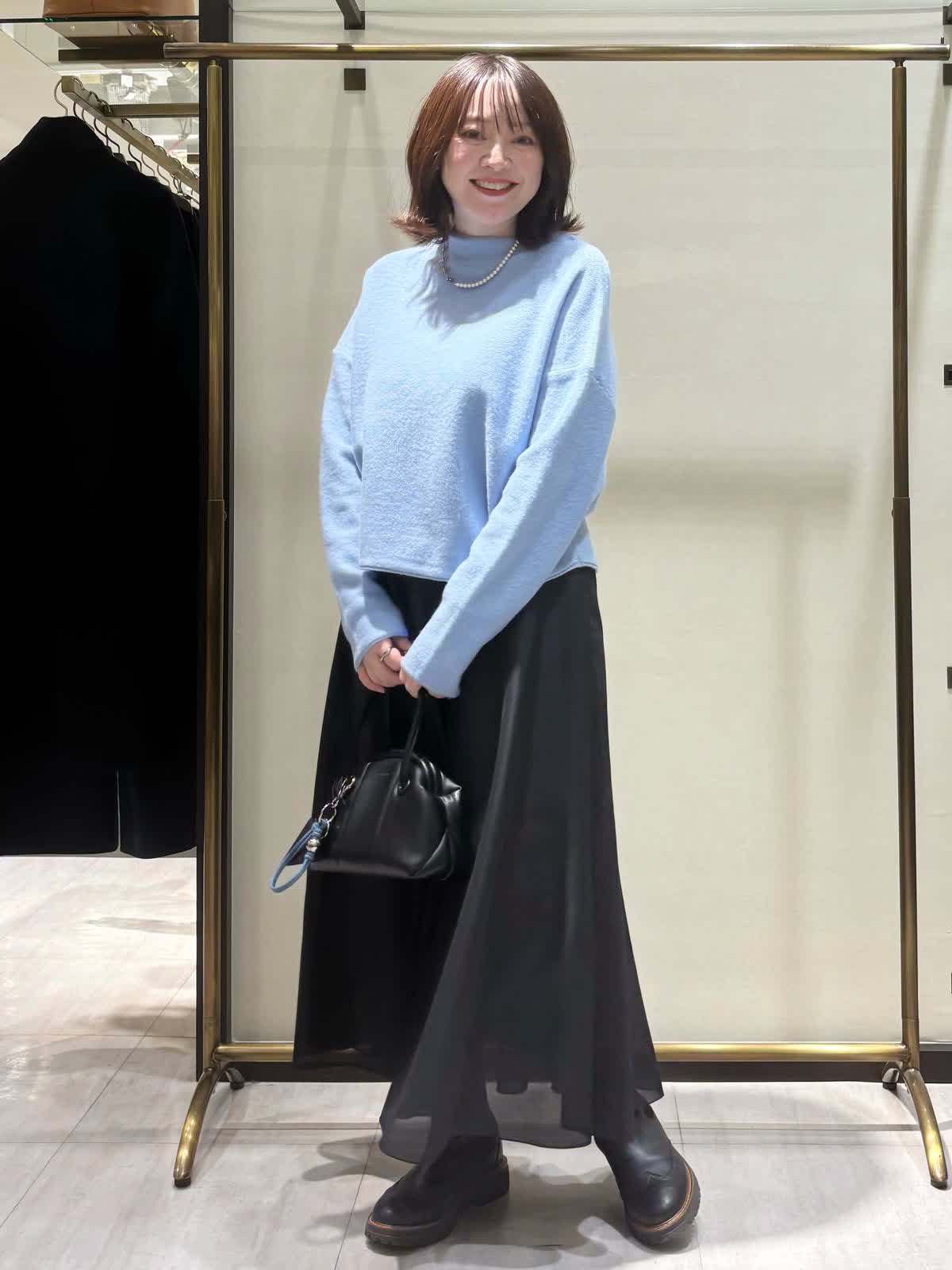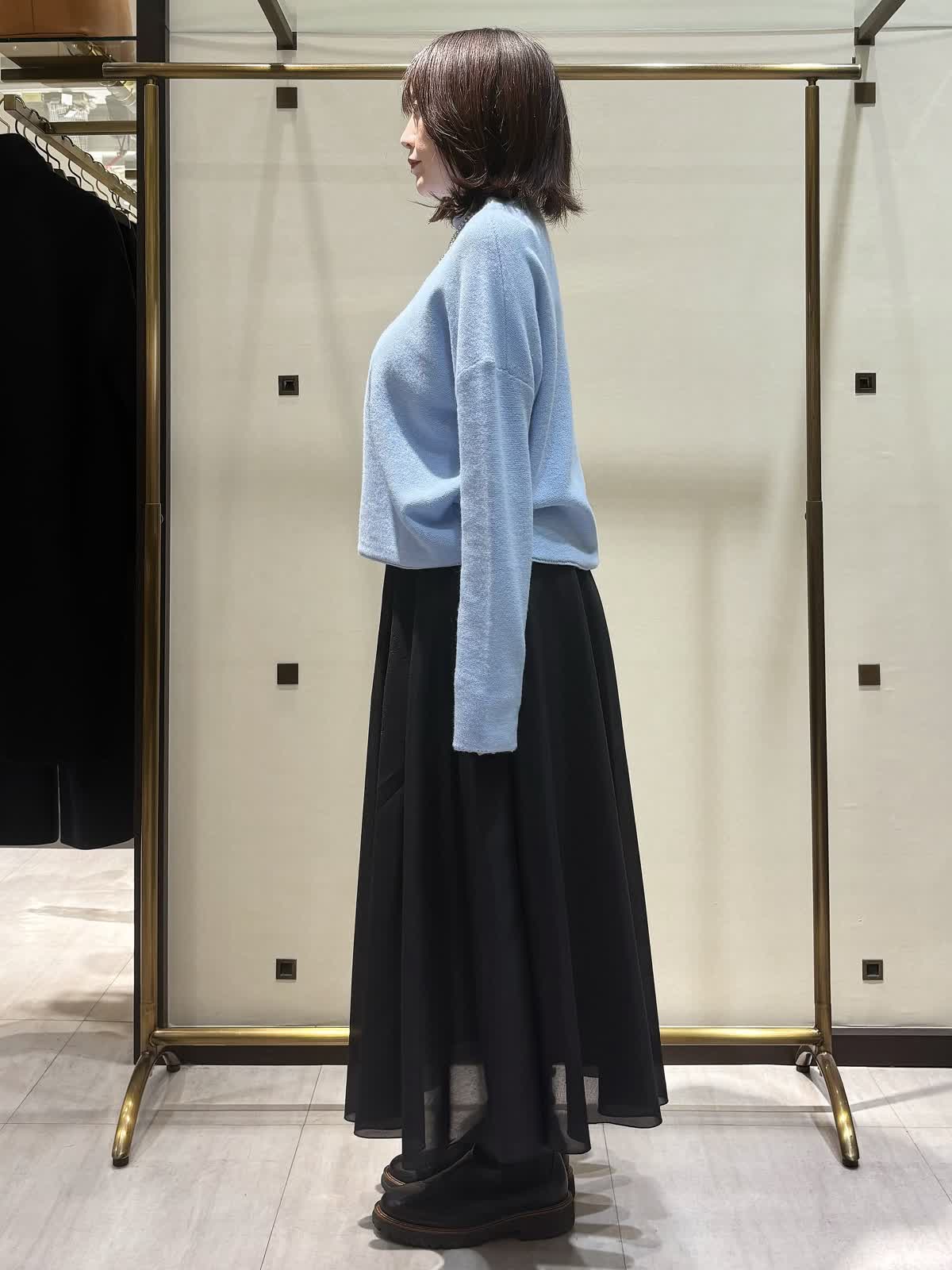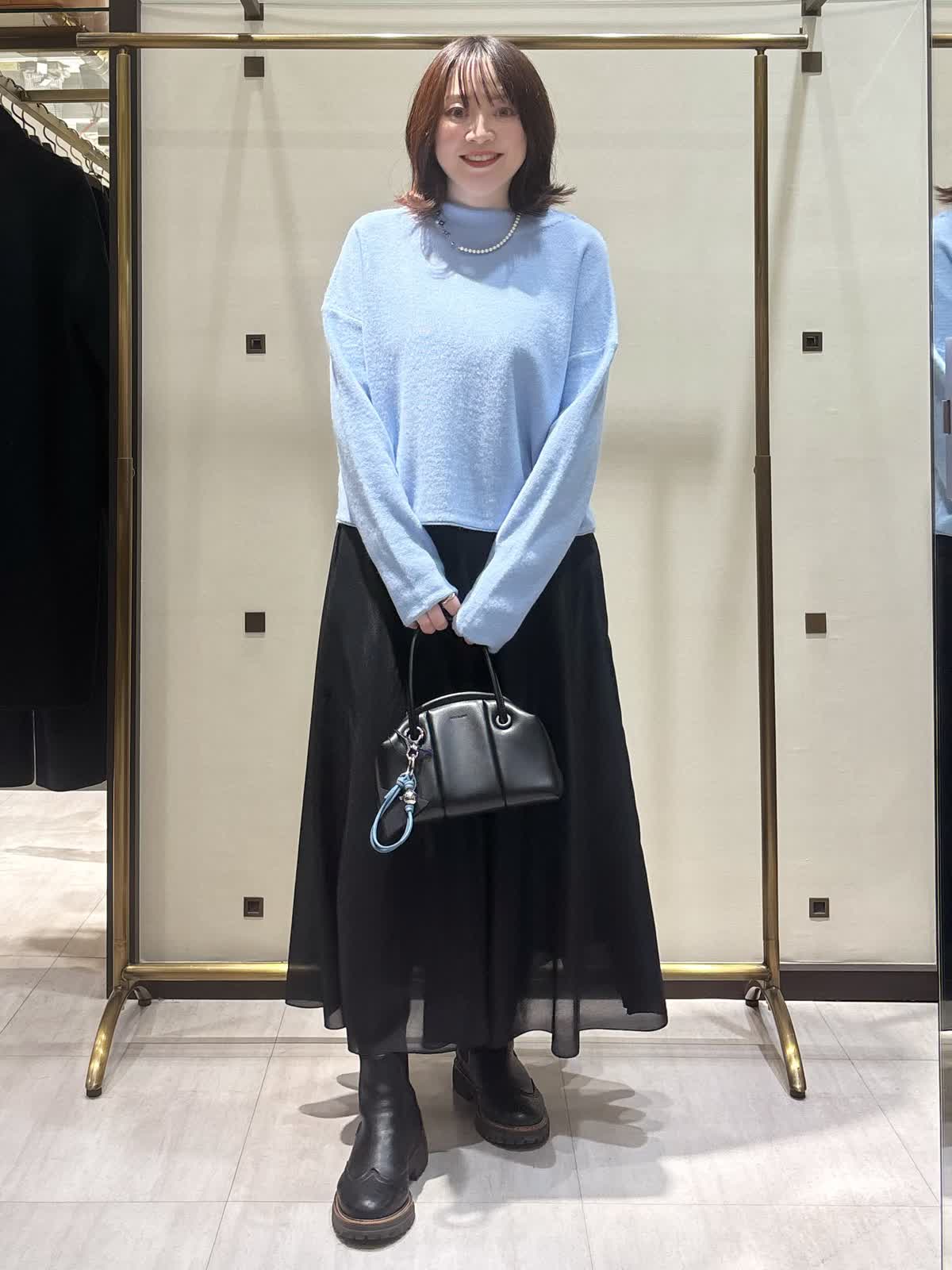 【着用カラー】 ニット:サックス スカート:ブラック 【着用サイズ】 全て9号 やわらかなブルーが映えるニットを主役にした、上品で女性らしいスタイリング。 軽やかな落ち感のあるブラックスカートを合わせることで、甘さを抑えつつ大人のバランスに仕上げました。 シンプルながらも配色で季節感を楽しめる、通勤からお出かけまで幅広く活躍するコーディネートです。
