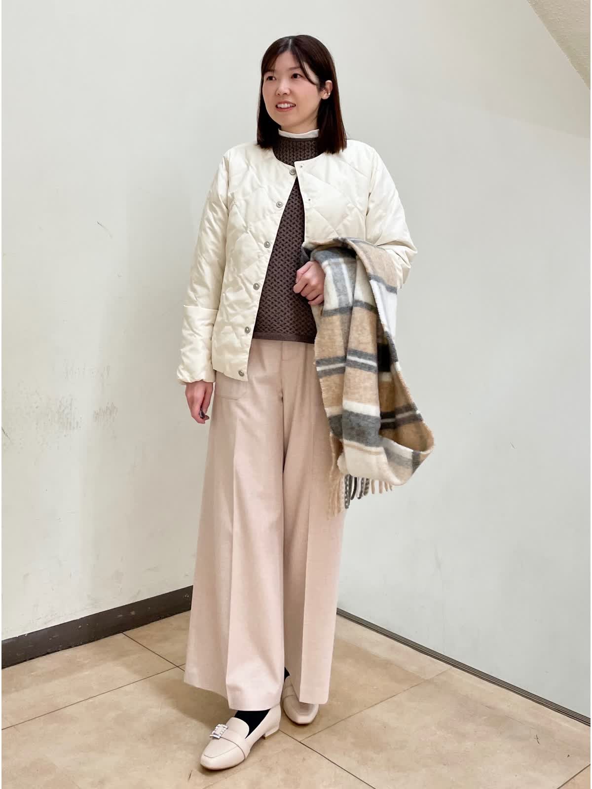 【着用サイズ】ダウン:9号 ニット:フリー カットソー:9号 パンツ:11号 TAIONとコラボレーションしたダウンジャケット。シンプルで軽いので使いやすいです。インナーダウンとしてもおすすめです。