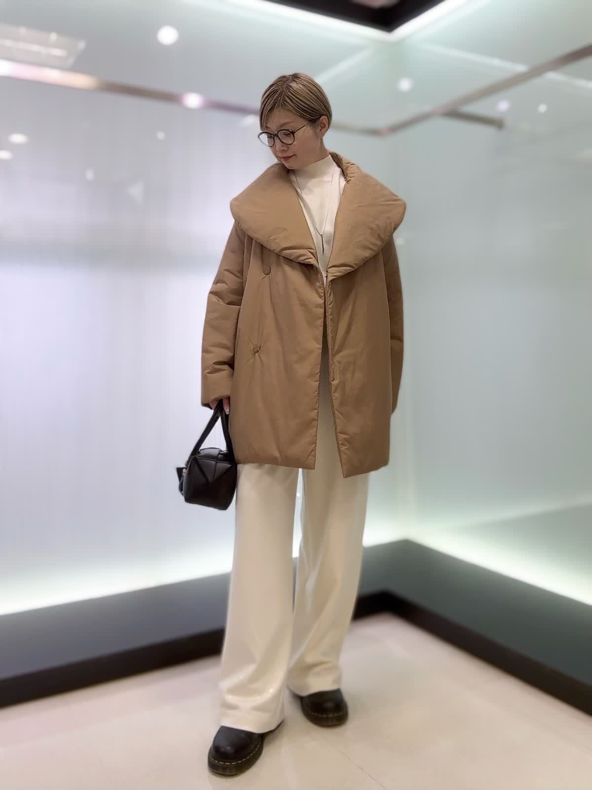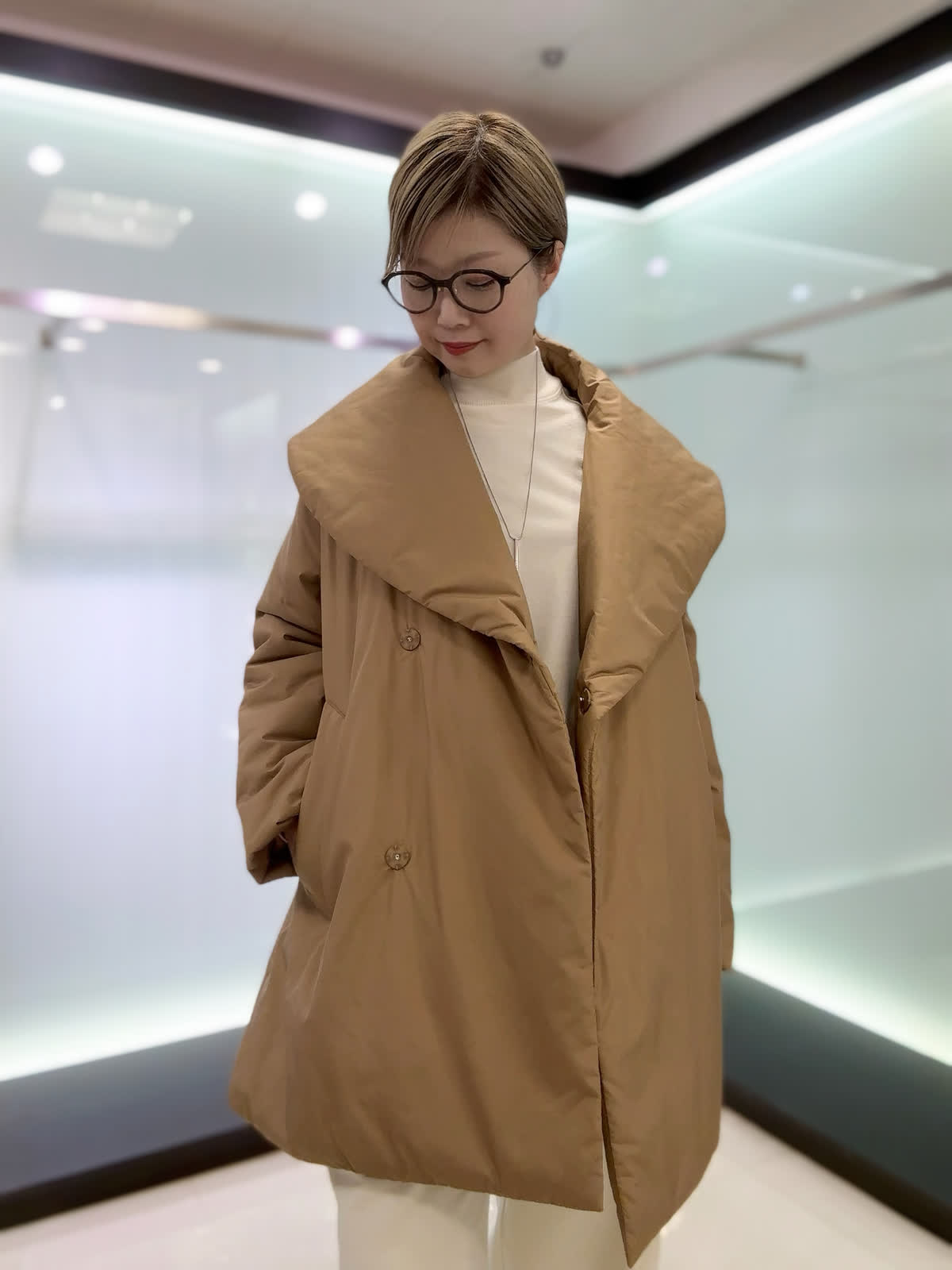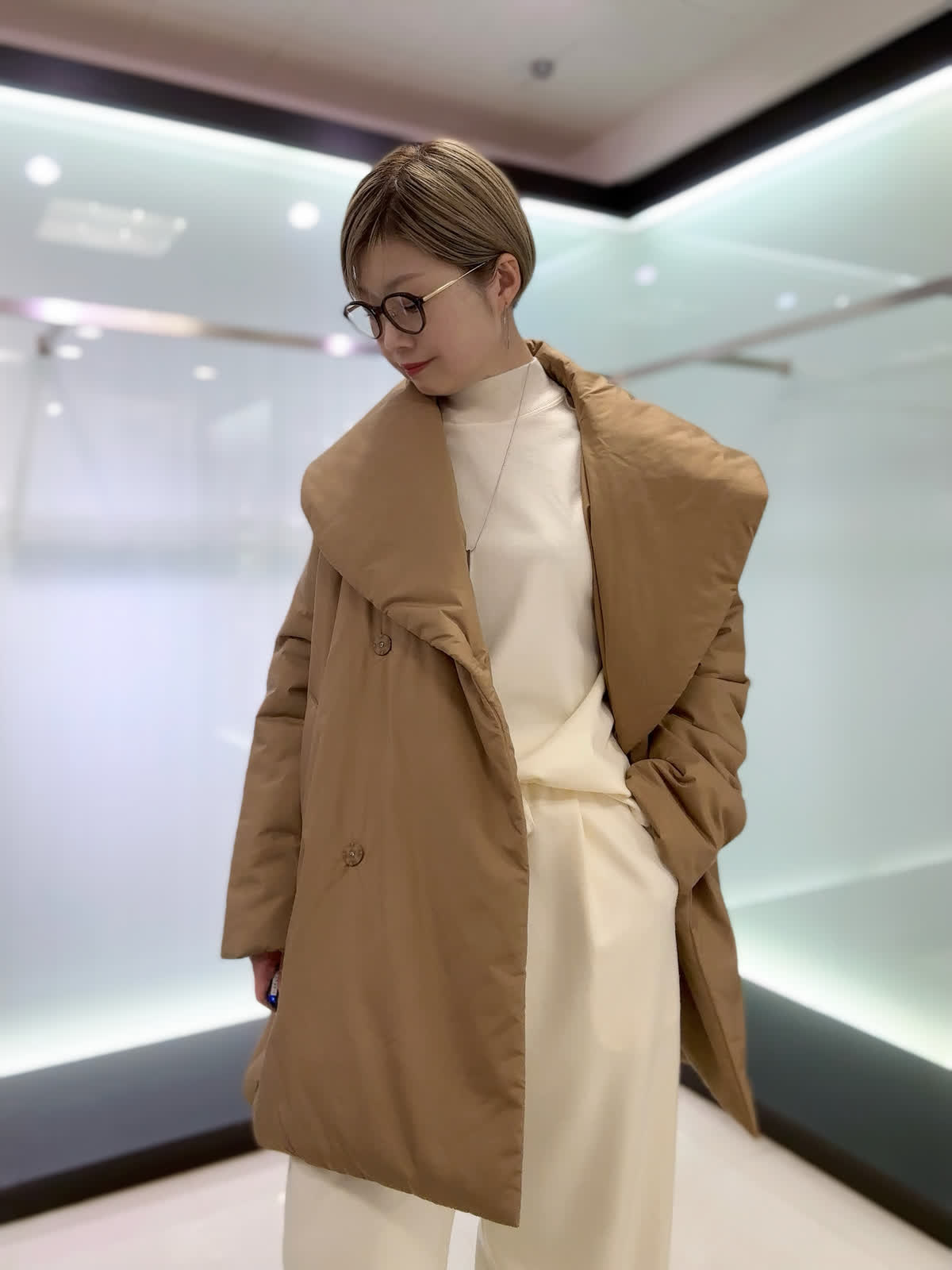 【着用サイズ】アウター : キャメル/9号 カットソー・パンツ: アイボリー/9号 おすすめリラックスコーデ♪ゆったりとしたサイズ感のセットアップに軽くて温かいダウンを合わせてみました。ダウンコートはカジュアルコーデ、綺麗めコーデにも合わせられるのでオンオフ問わず着られます。