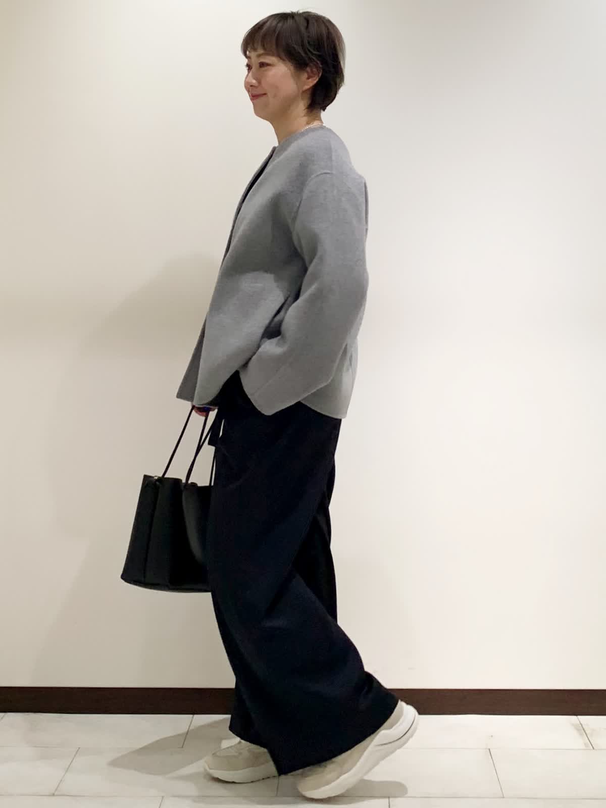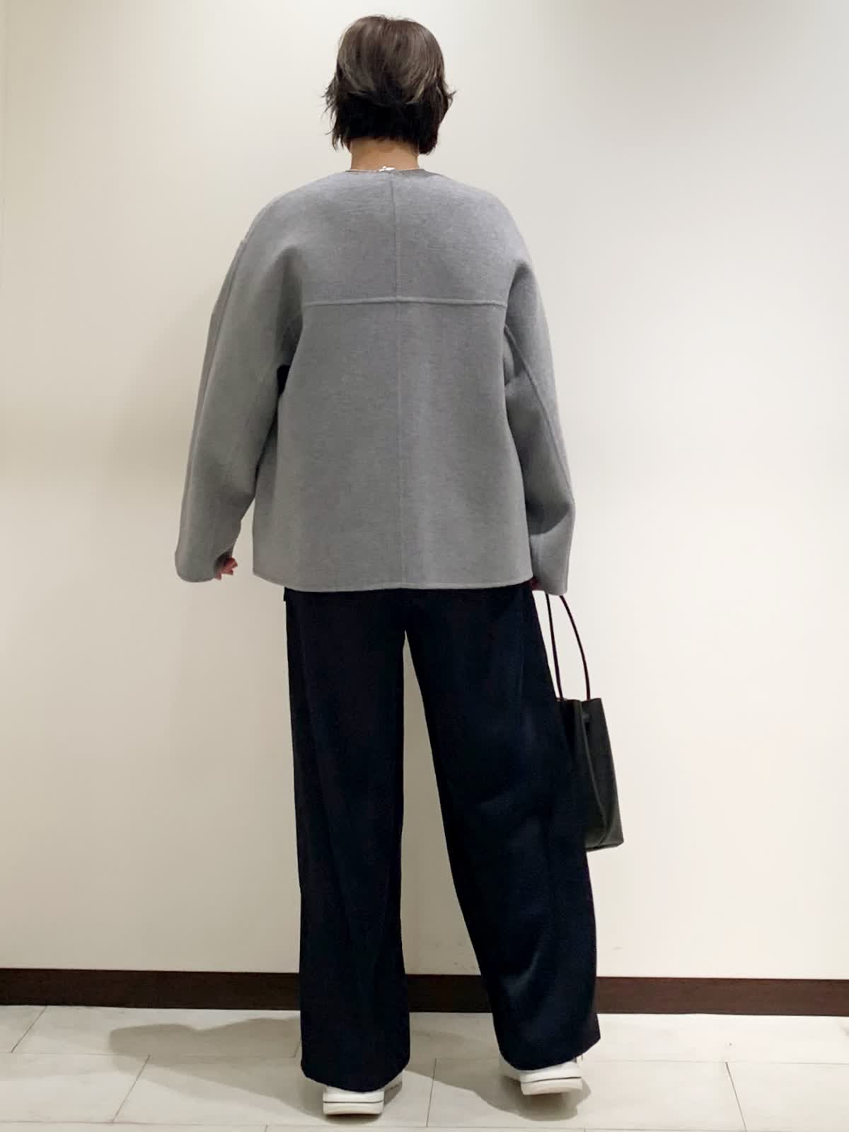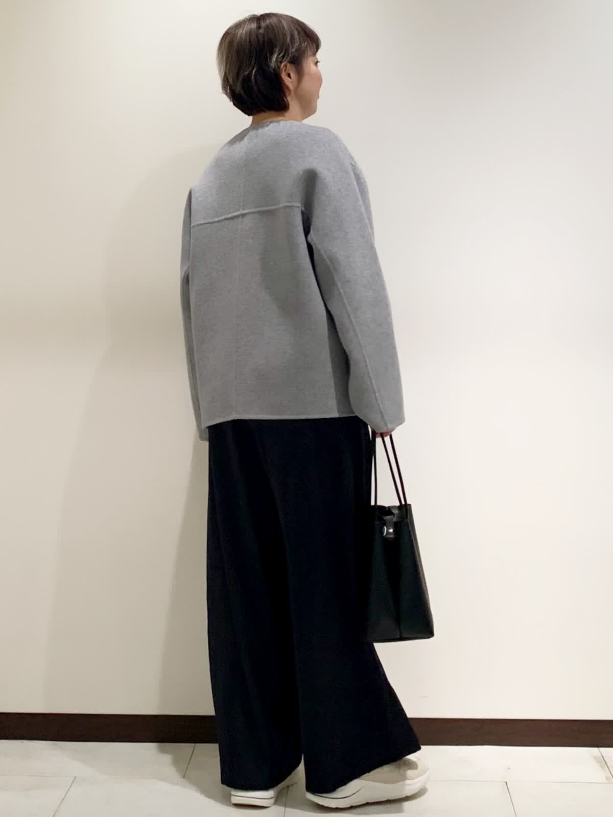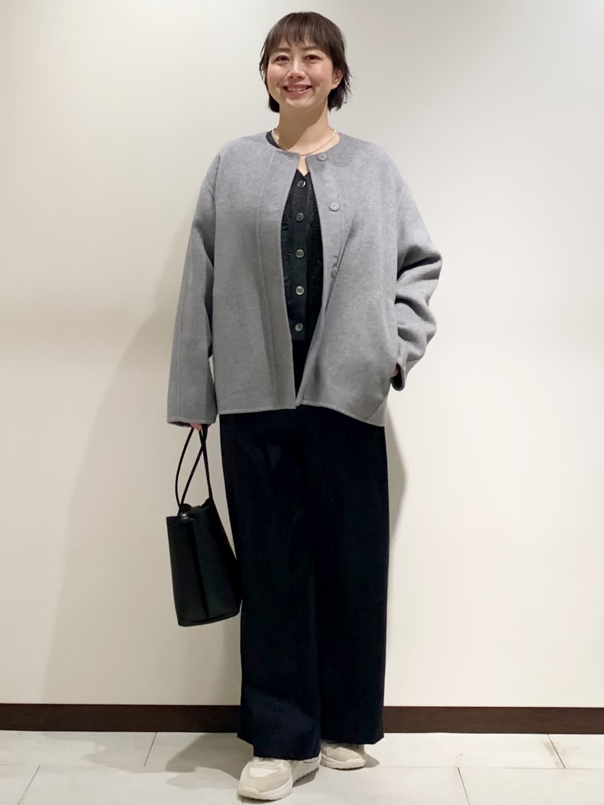 【着用サイズ】全て9号サイズ 【着用カラー】コート:グレー カーディガン:グレー パンツ:ネイビー バッグ:ブラック 柔らかな素材のリバーコートは軽い着心地で柔らかさが特徴です。乗り物などで座る時など、着やすい着丈です。パンツに合わせて普段使いしやすいカジュアルコーディネート。