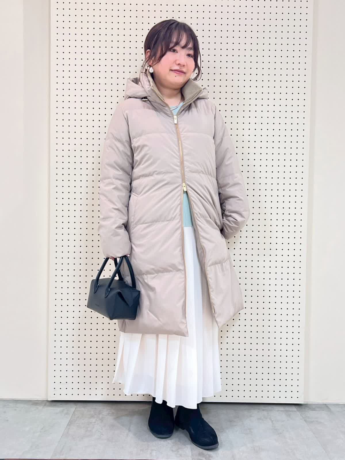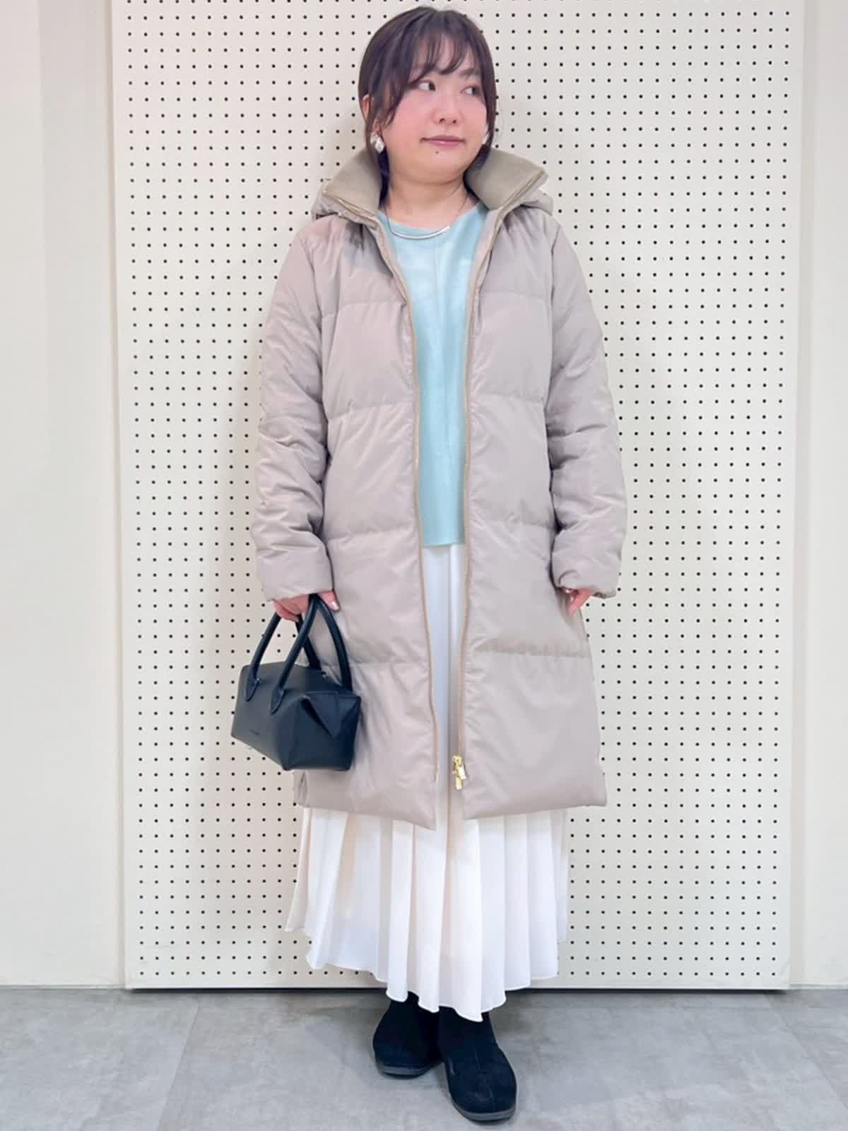 【着用サイズ】全て9号、フリー 【着用カラー】コート:ベージュ ニット:ペパーミント スカート:オフホワイト 冬のお出かけコーディネート。ロングダウンは149pで膝下の長さ。下半身も覆ってくれるので、寒い季節のお出かけにぴったりです。フードも取り外し可。インナーは明るいカラーで新年のお出かけにもおすすめです。