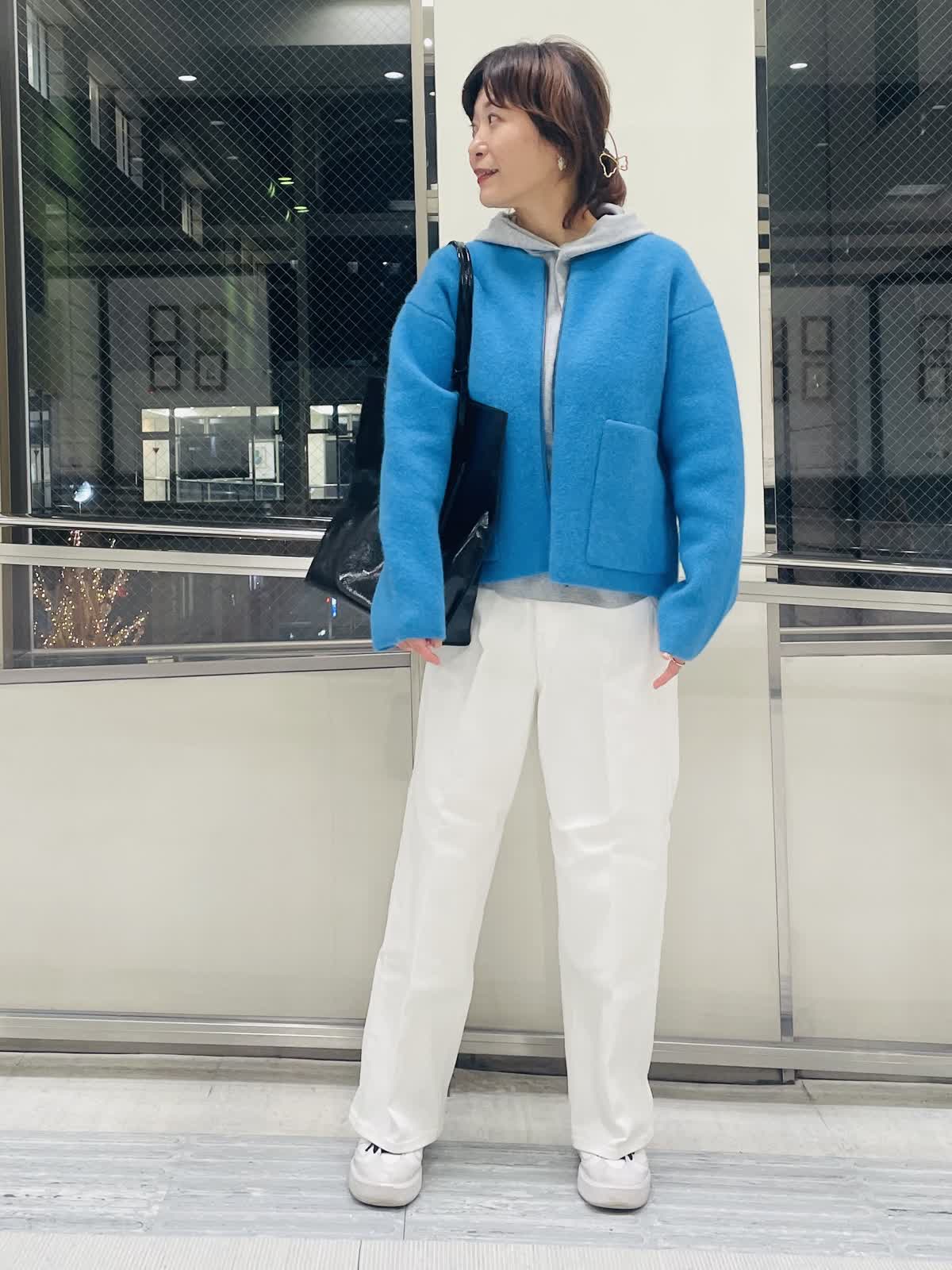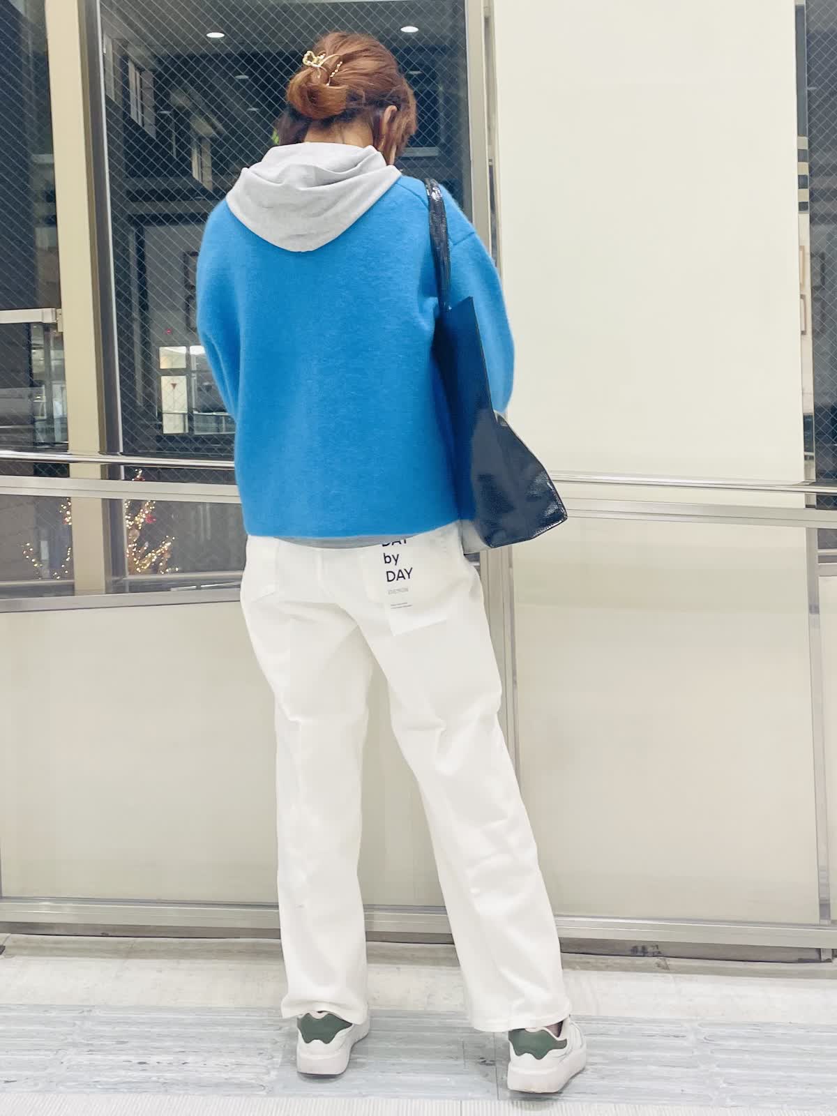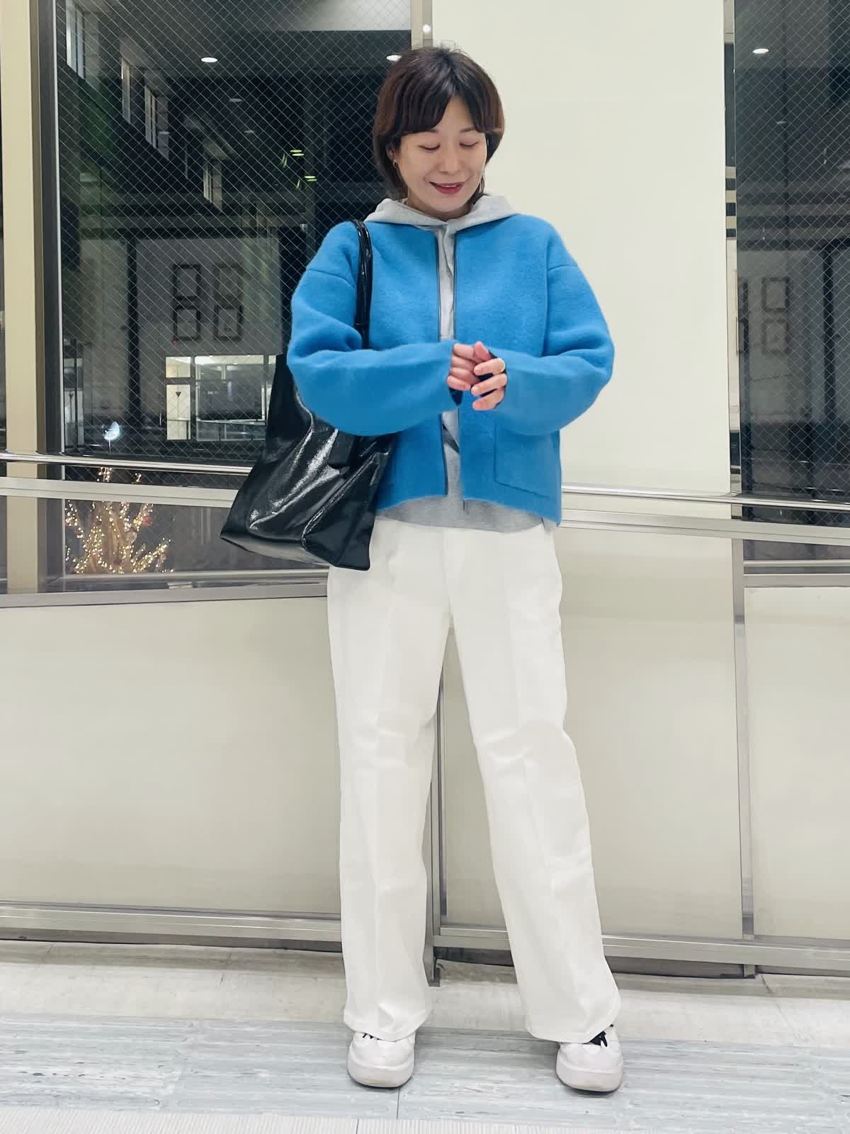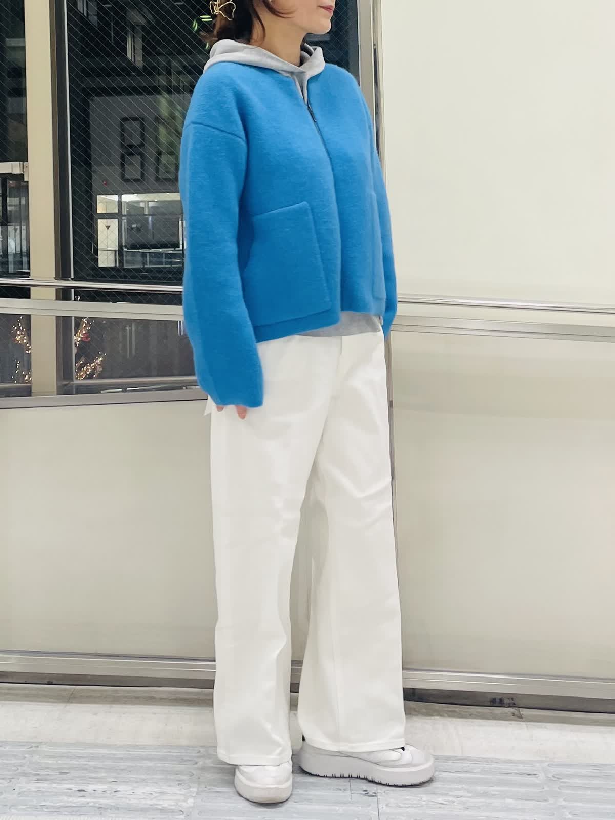 【着用サイズ/カラー】ニットブルゾン/ターコイズブルー:フリーサイズ パーカー/グレー:フリーサイズ デニム/ホワイト:11号サイズ 冬の爽やかコーデ。 薄手のパーカーは、通年着回しできる優れものコットンなので防寒着の下におすすめです。ラクーンの柔らかな温もりと体感温度調節しやすいところもポイント。合わせた白デニム、チェックしてみてください。 透けにくい安心感はストレスフリー。重宝アイテム間違いなしです。