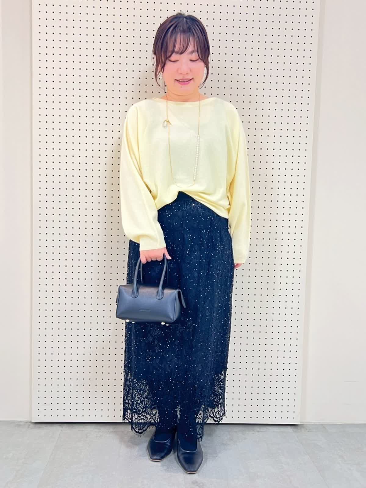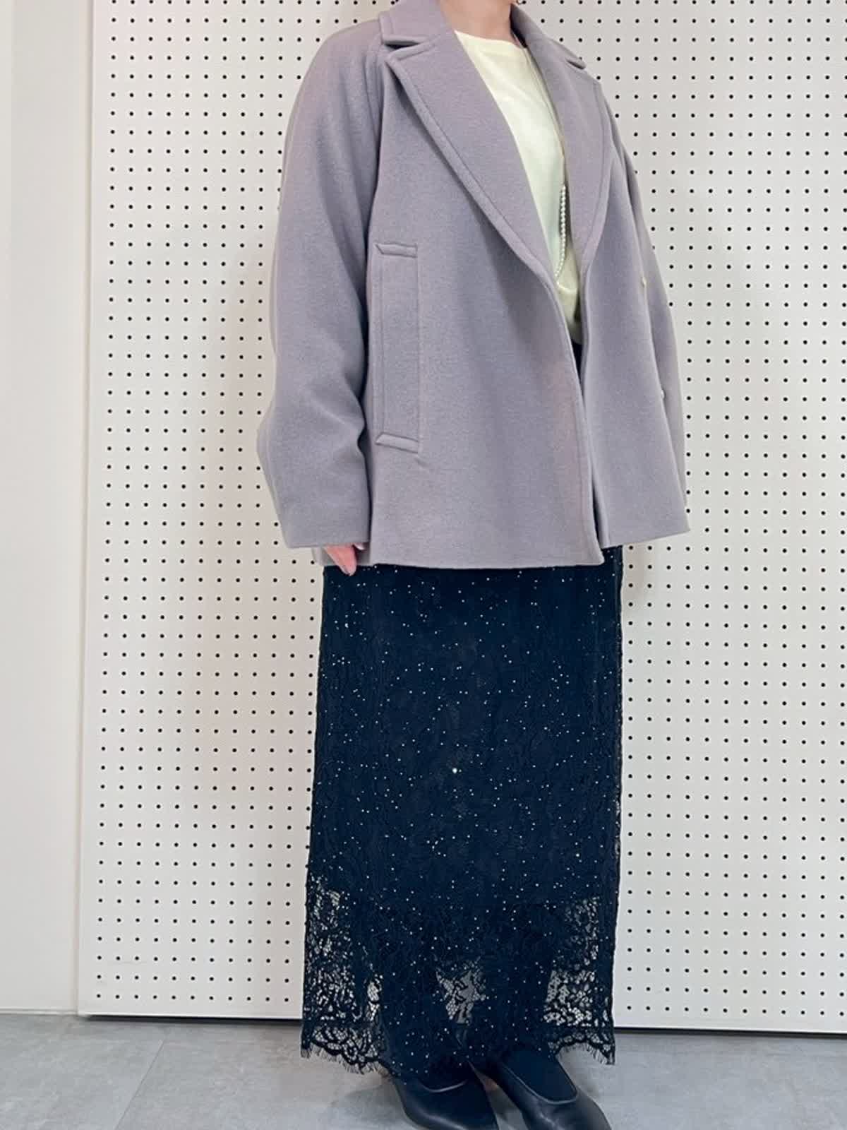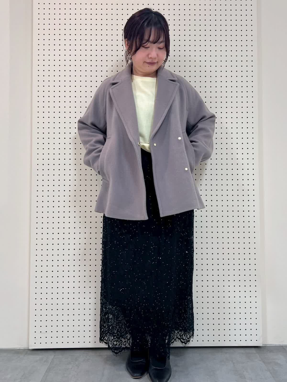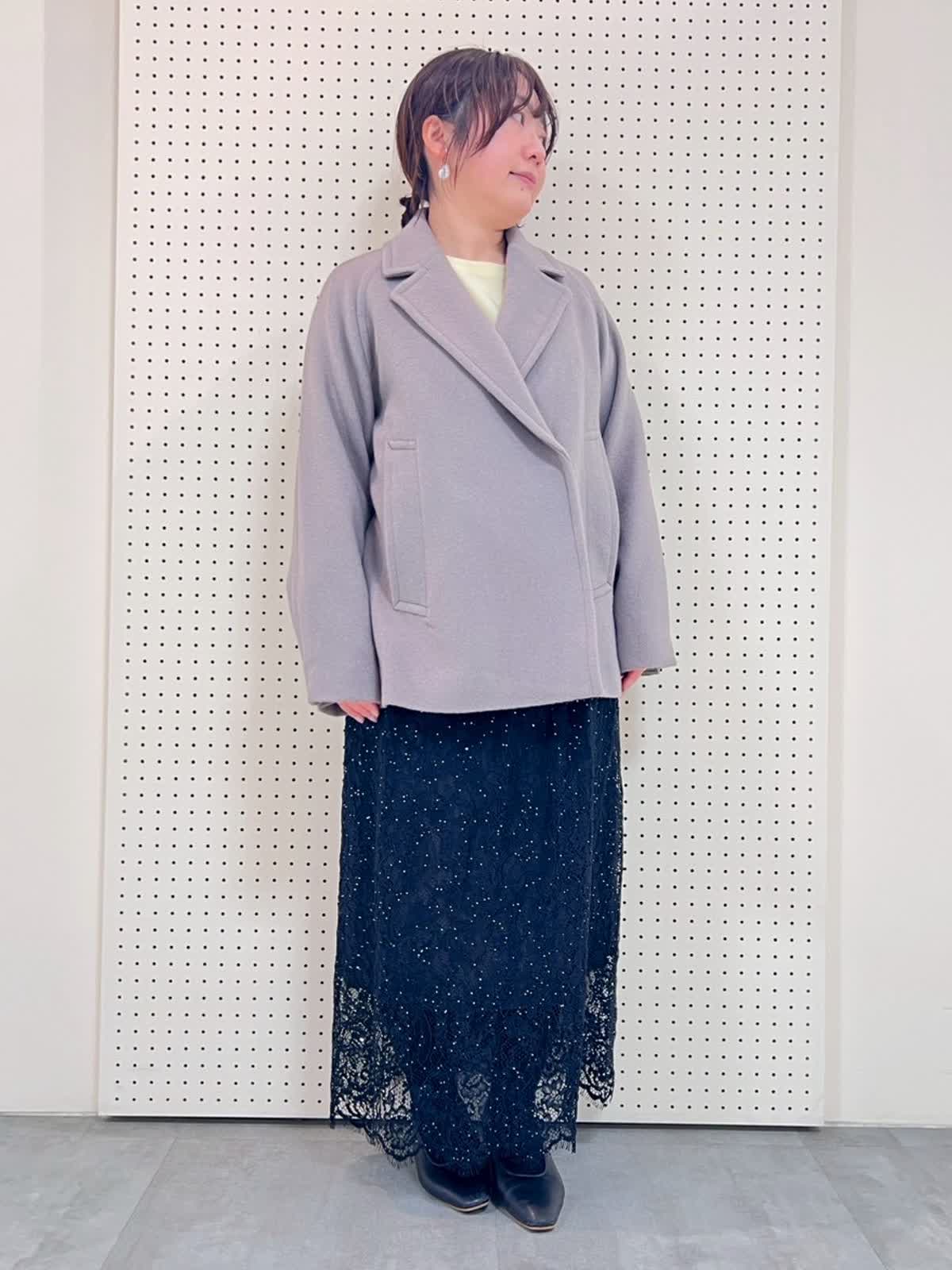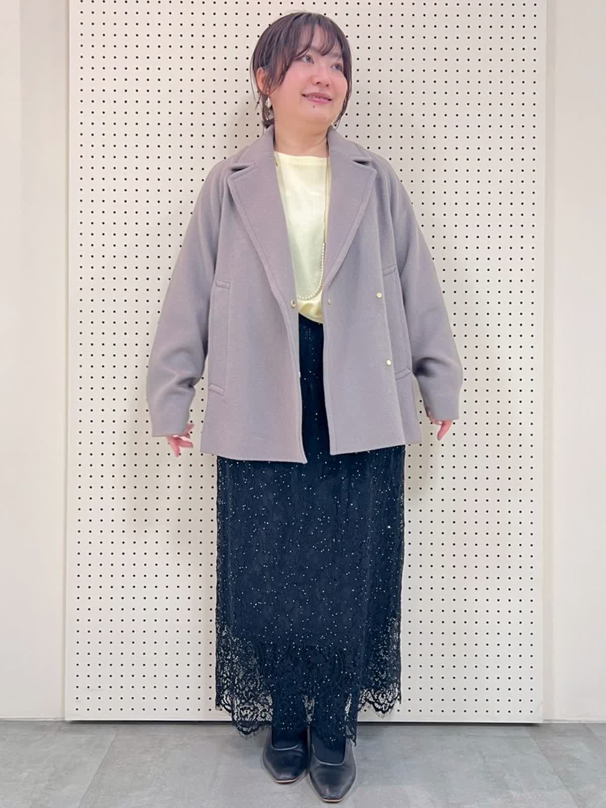 【着用サイズ】全て9号 【着用カラー】コート:グレーベージュ ニット:イエロー スカート:ブラック 冬のコートコーディネート。コートは、(149p)9号着用で腰の長さ。上品でシンプルな長く着られるデザイン。袖が長くなってしまう方はボタンを閉じるとすっきり見えます。スカートとの相性も抜群。とても軽くて暖かいので、これからの寒い季節のお出かけにぴったりです。レーススカートを合わせて華やかなコーディネート。
