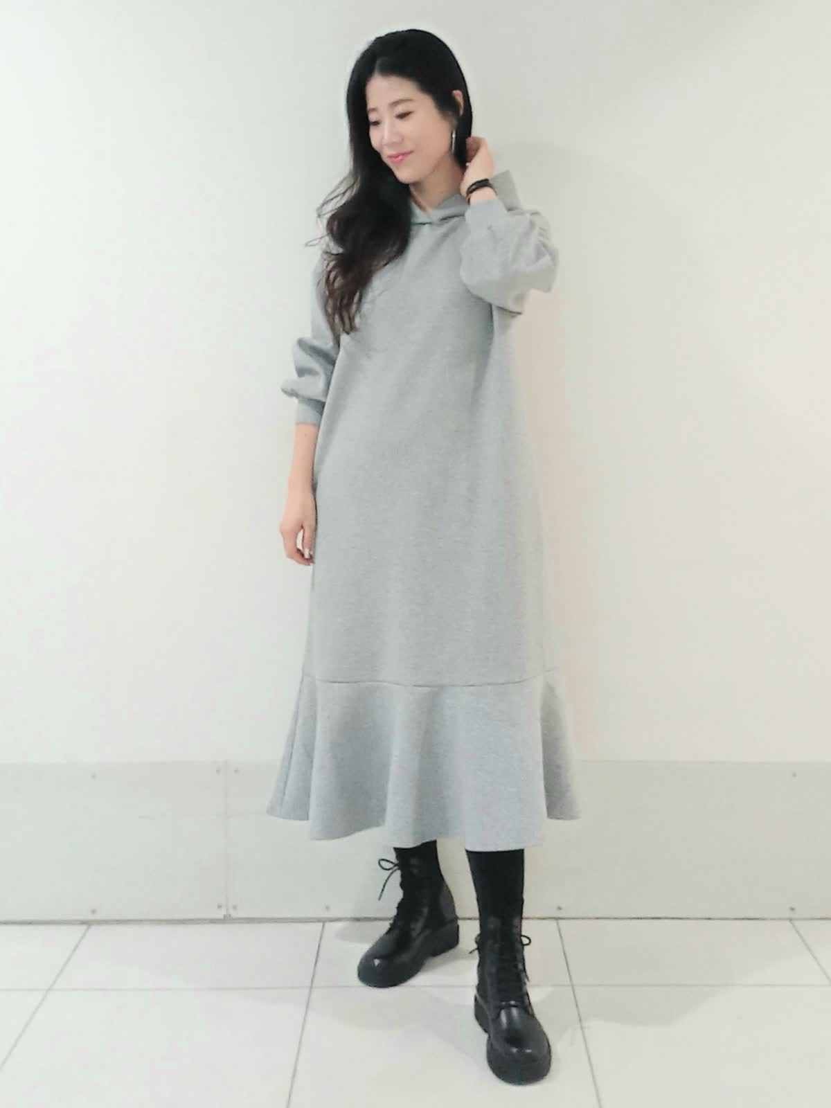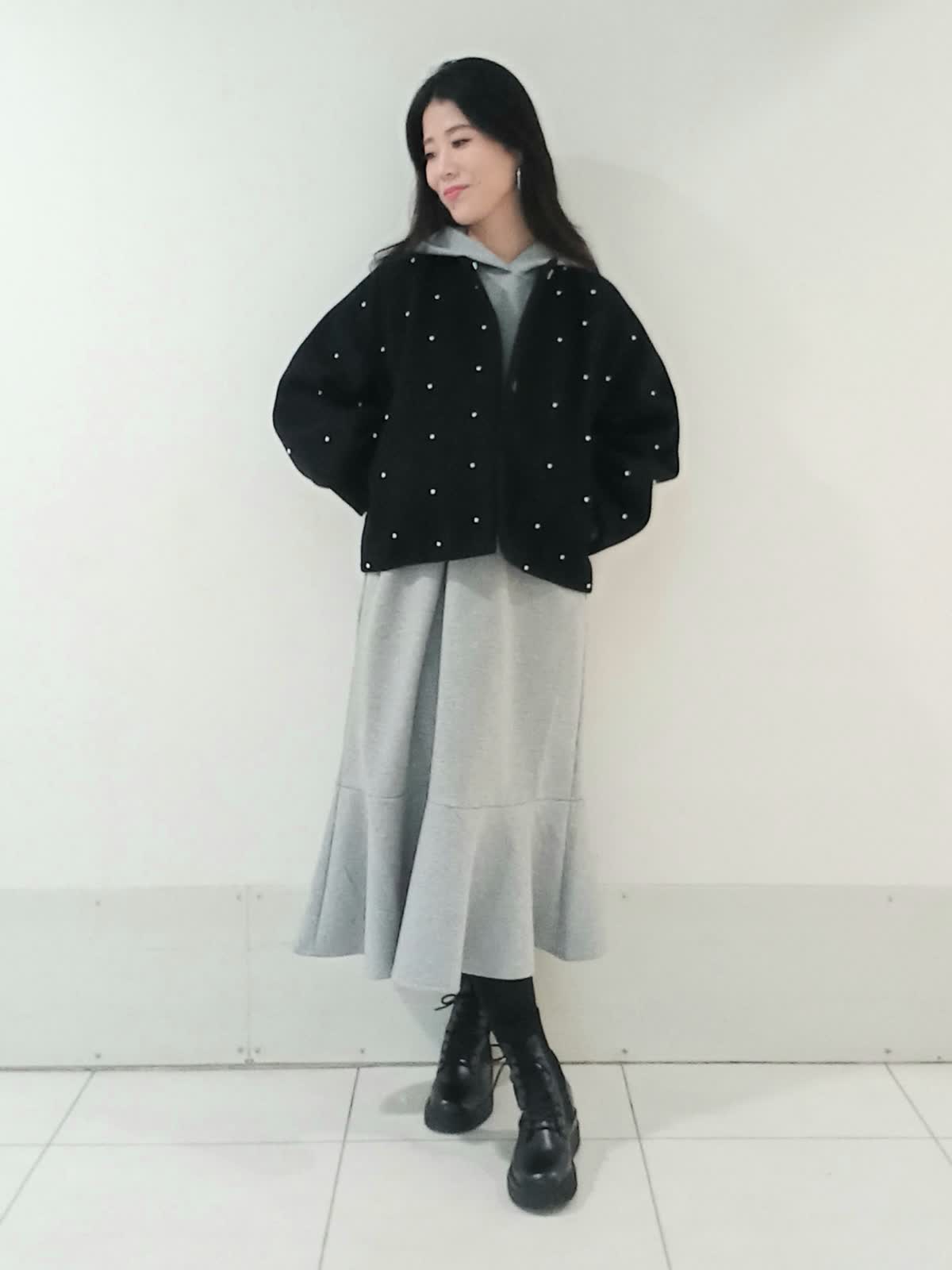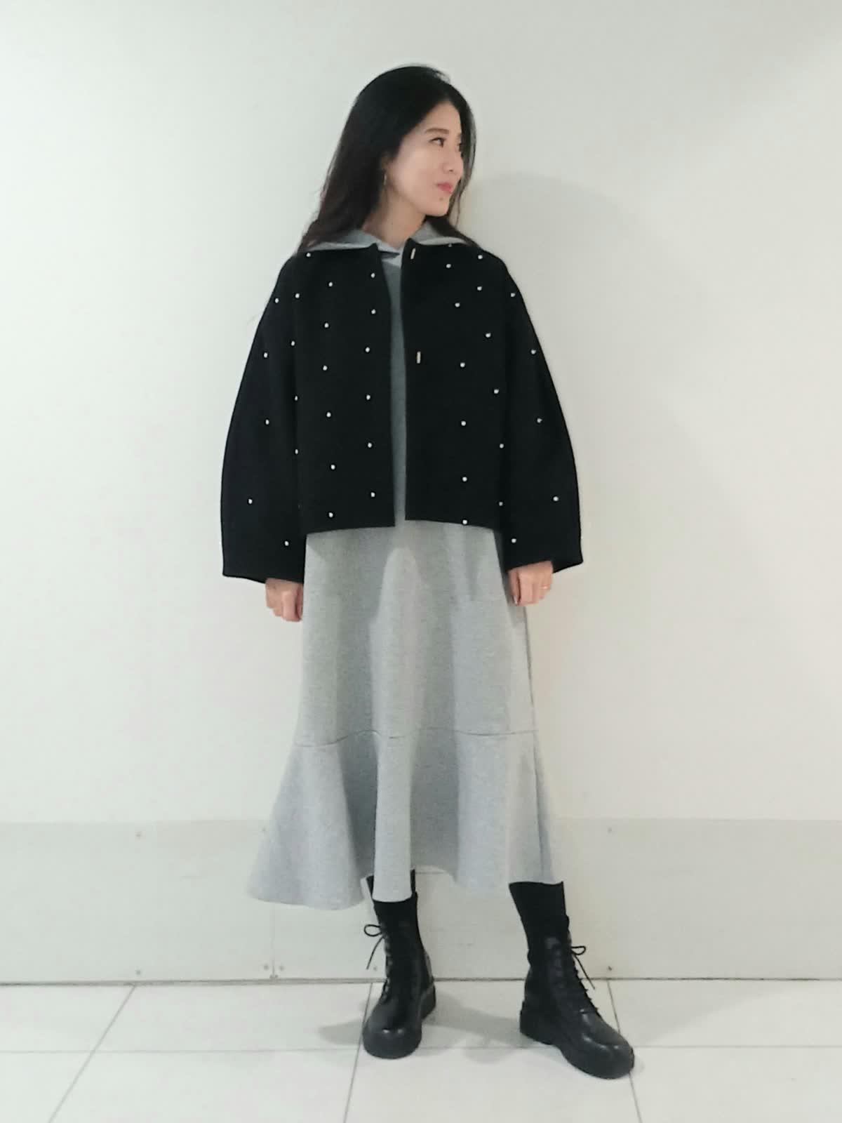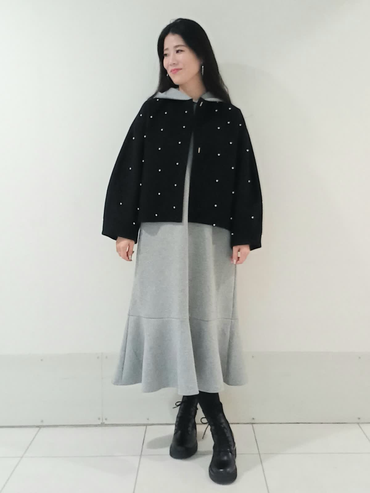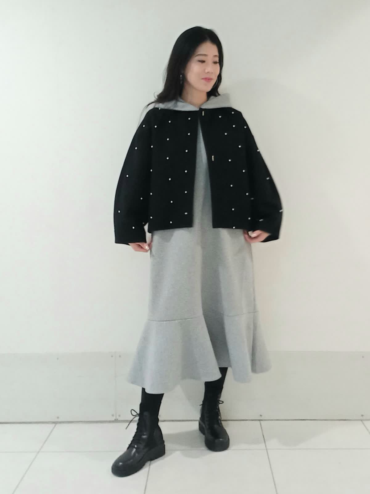 【着用サイズ、コート9号、ワンピース9号】 パーカーワンピースに上品で華やかなパールコートを合わせて大人可愛いスタイルに。?軽い着心地のパーカーワンピースは裾に向かって広がるフレアシルエットが女性らしく短め丈のコートを合わせることで重心が上がりスタイルアップに見せてくれます。?