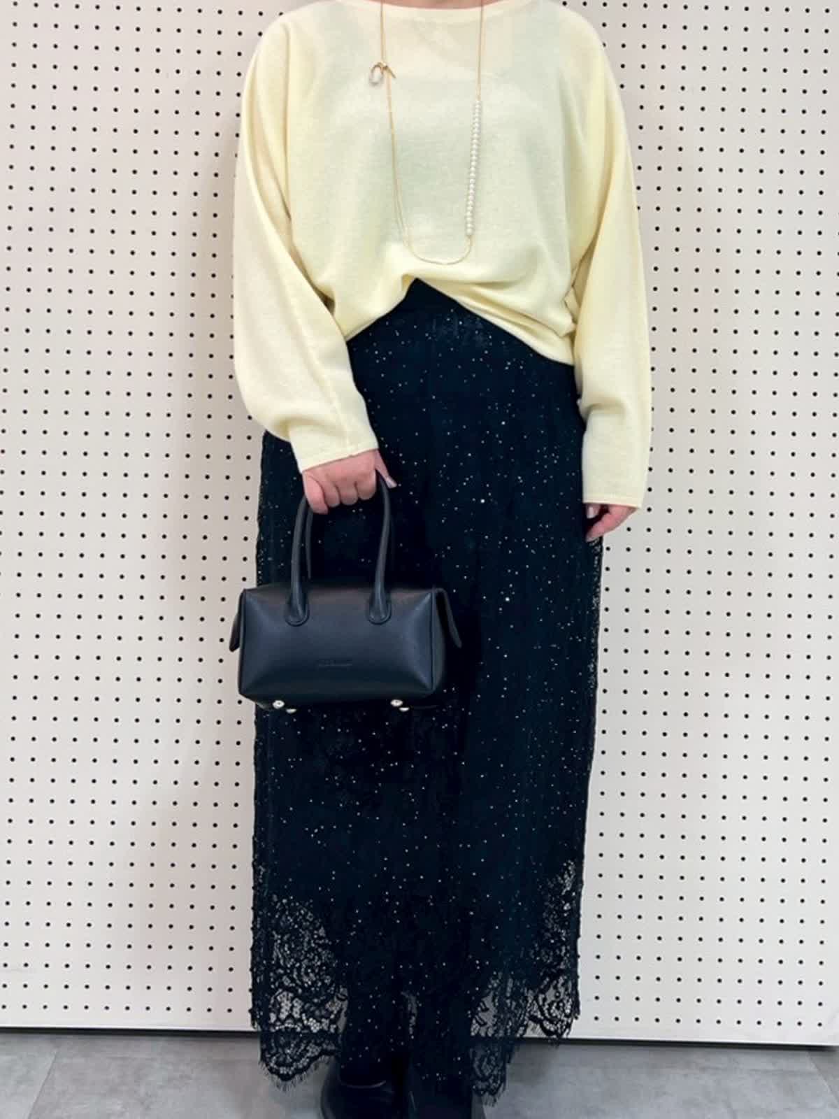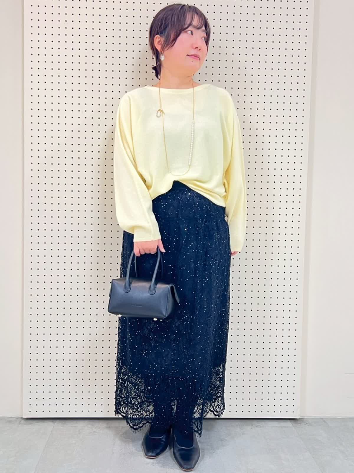 【着用サイズ】全て9号 【着用カラー】ニット:イエロー スカート:ブラック 綺麗色ニットコーディネート。ニットは袖周りもゆったりで、軽くて暖かいです。149pで腰くらいの長さで、スカートとの相性抜群です。レーススカートはウエストゴムでとても履きやすいです。タイツやブーツ合わせがおすすめです。