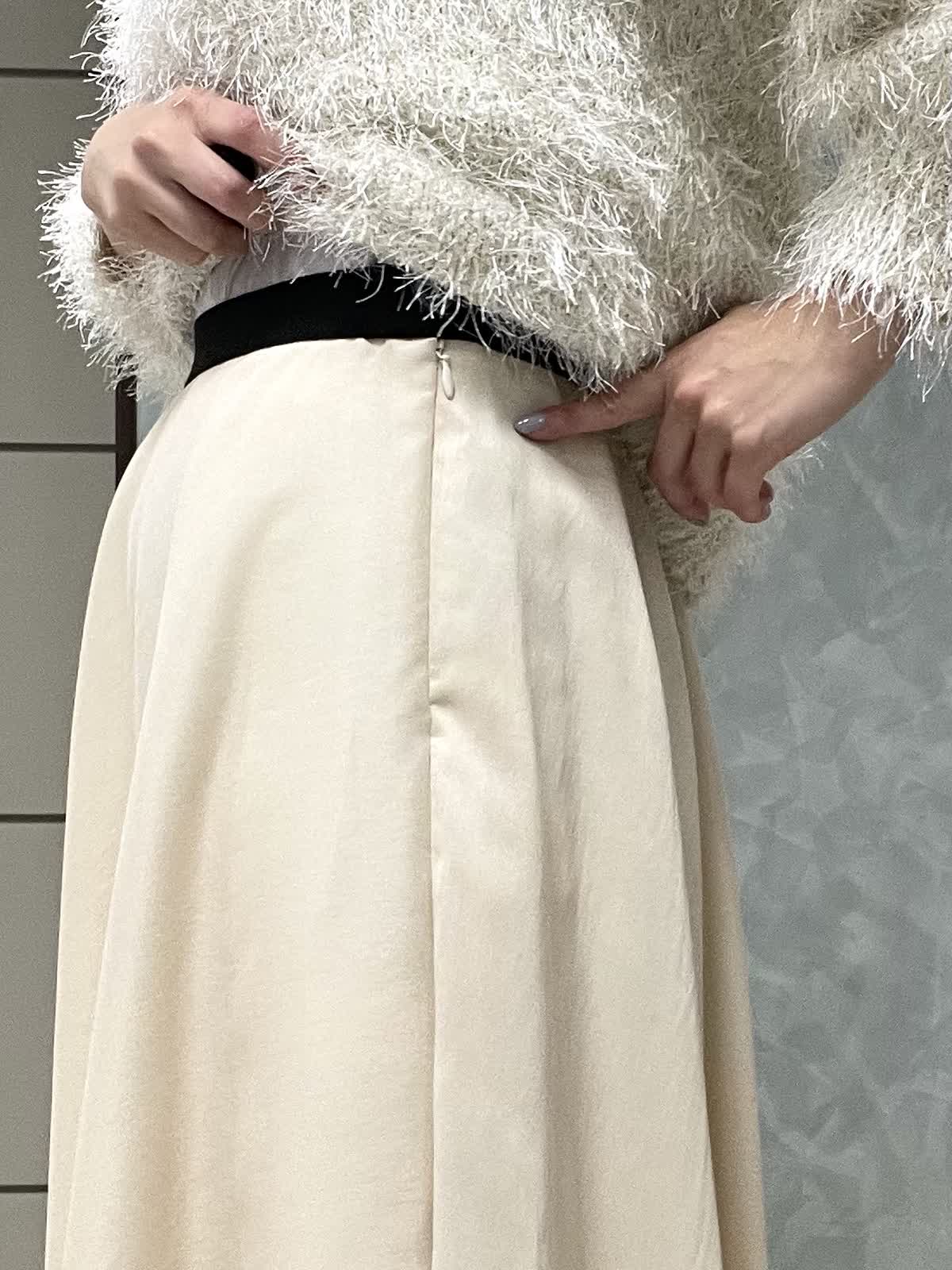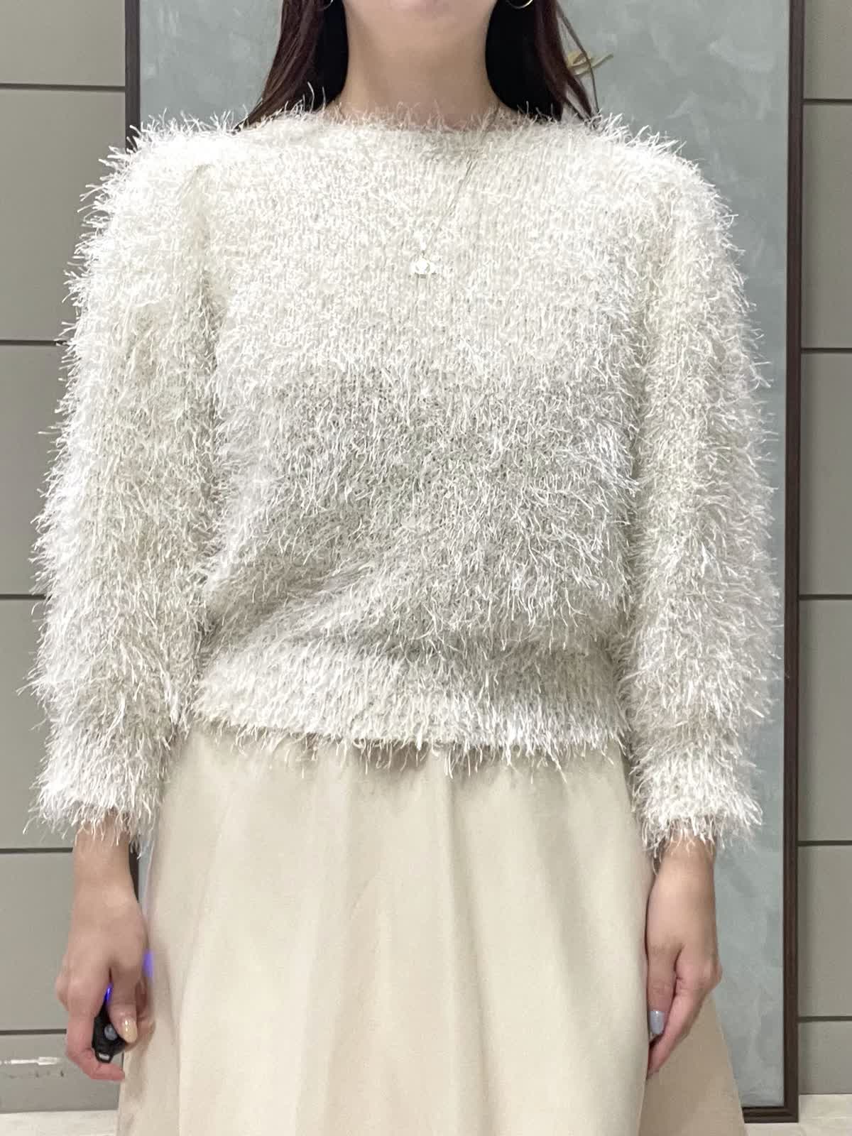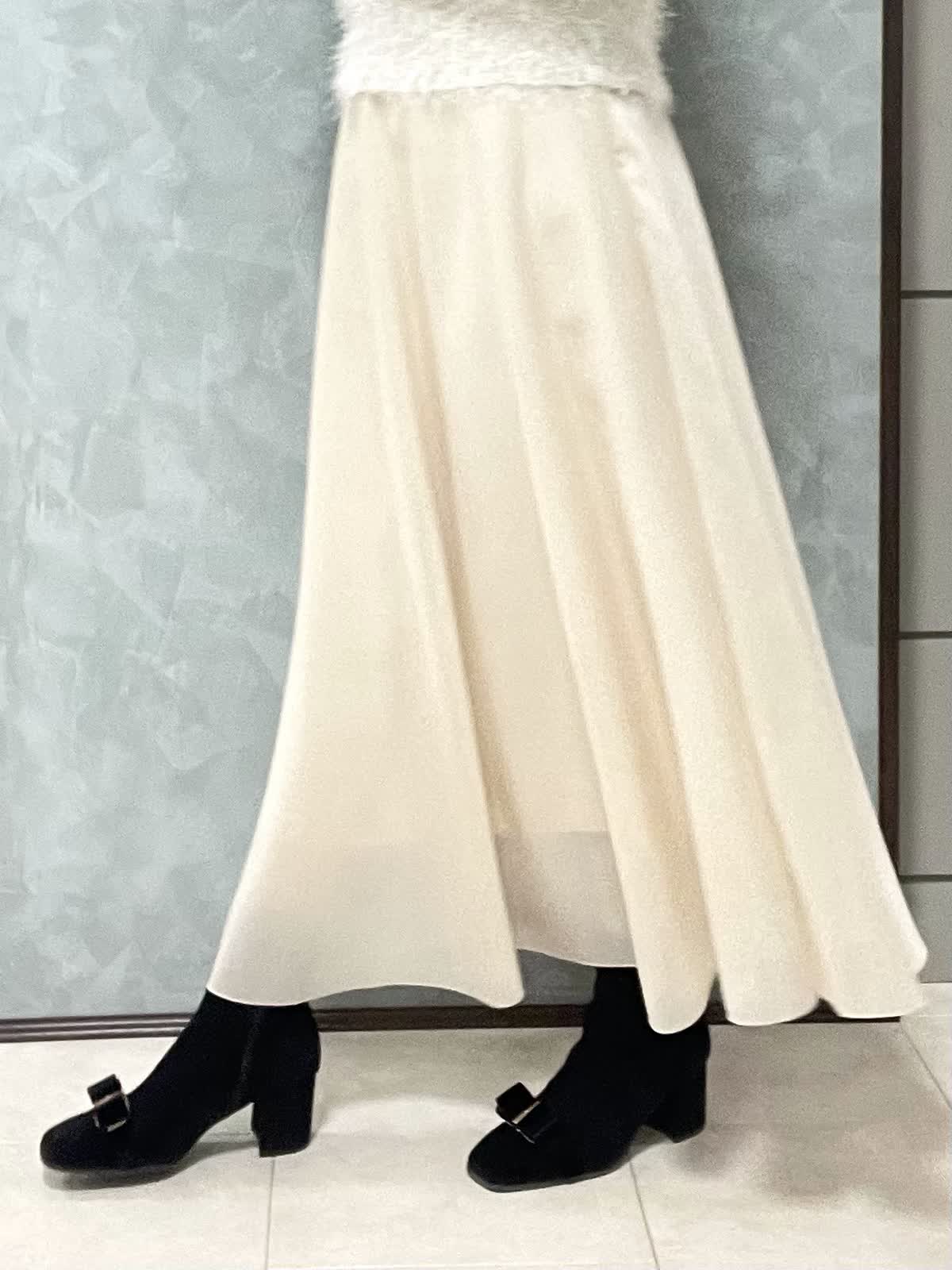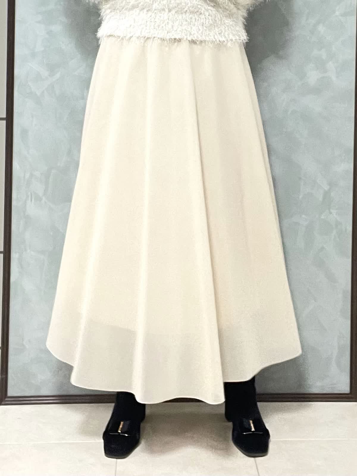 【着用サイズ】ニット:9号 スカート:7号 年末年始のイベントにオススメ!華やかなワントーンコーデです。ふわっとしたシャギー素材に袖のタックで立体感が出て、着るだけで女性らしい雰囲気に。ネックラインは開きすぎず詰まりすぎず程よいラウンドネックです。身頃はコンパクトなので、ボリュームのあるボトムとも相性◎です。スカートは軽さとハリのあるオーガンジー素材で、広がりすぎないフレアシルエットです。光沢感もあるので華やかさが出ます。ウエストはオールゴムで履き心地良いです。透け感も気にならないです。着丈は157センチで足首くらいです。左ファスナー、ポケットなしです。