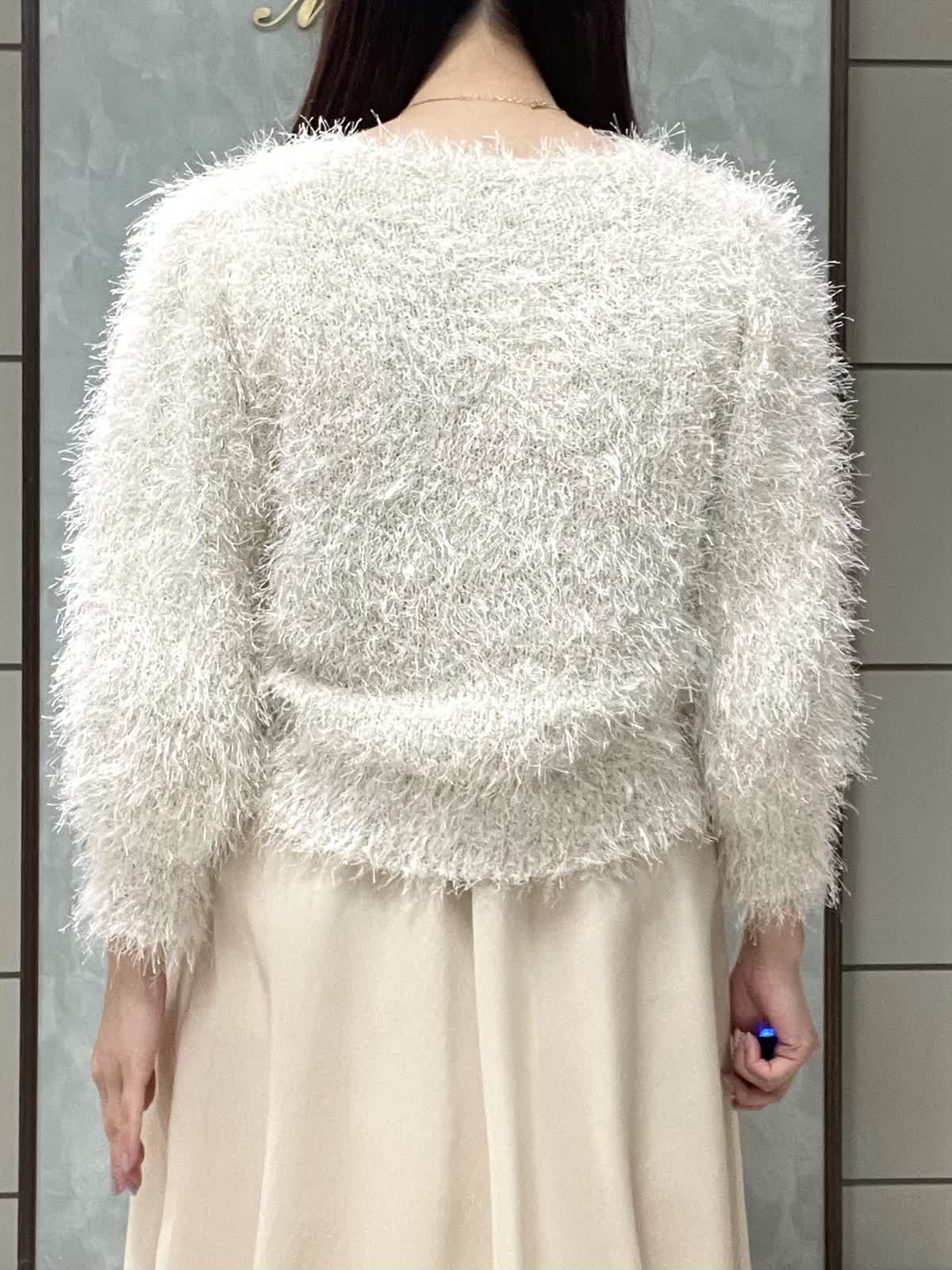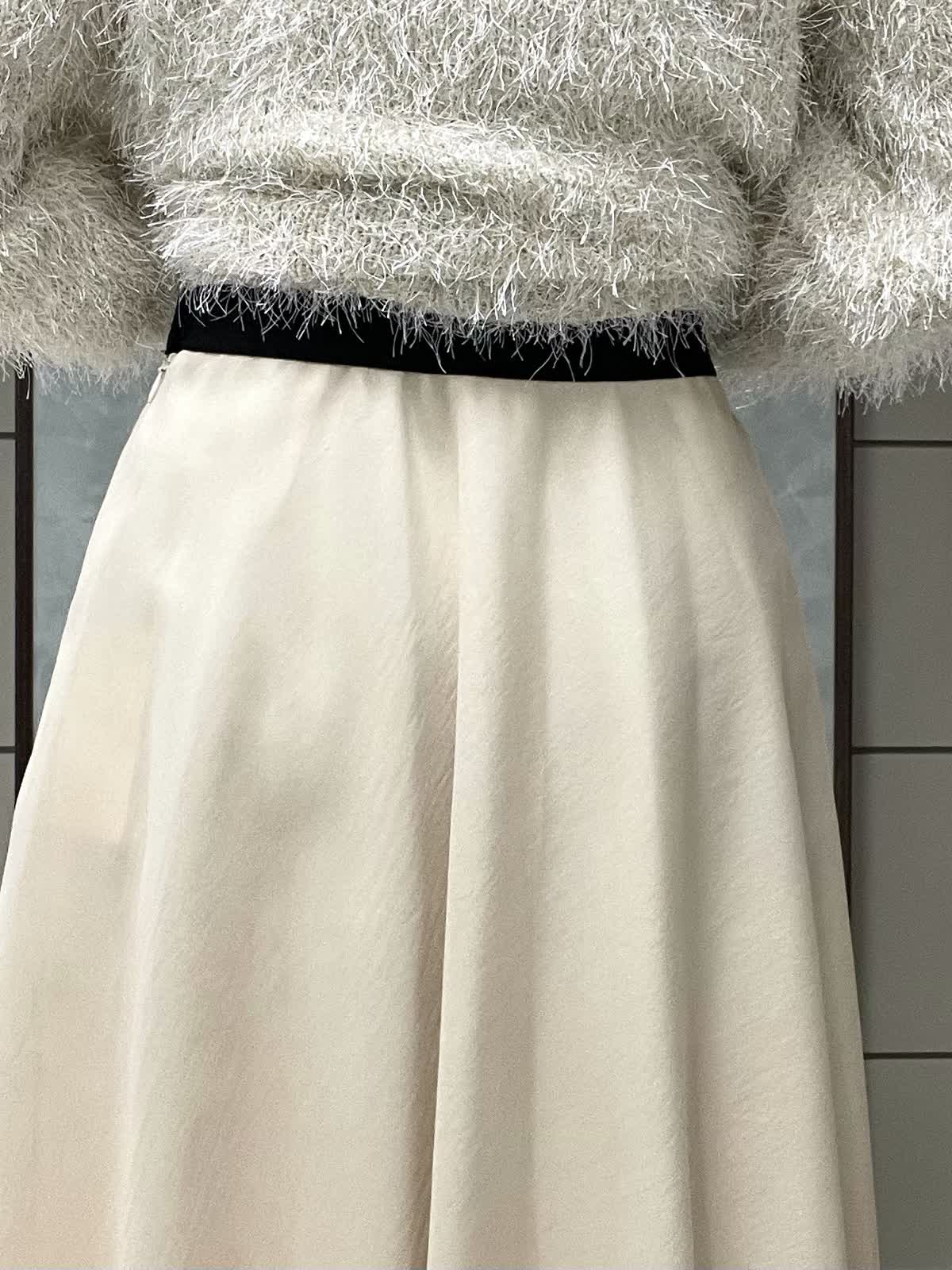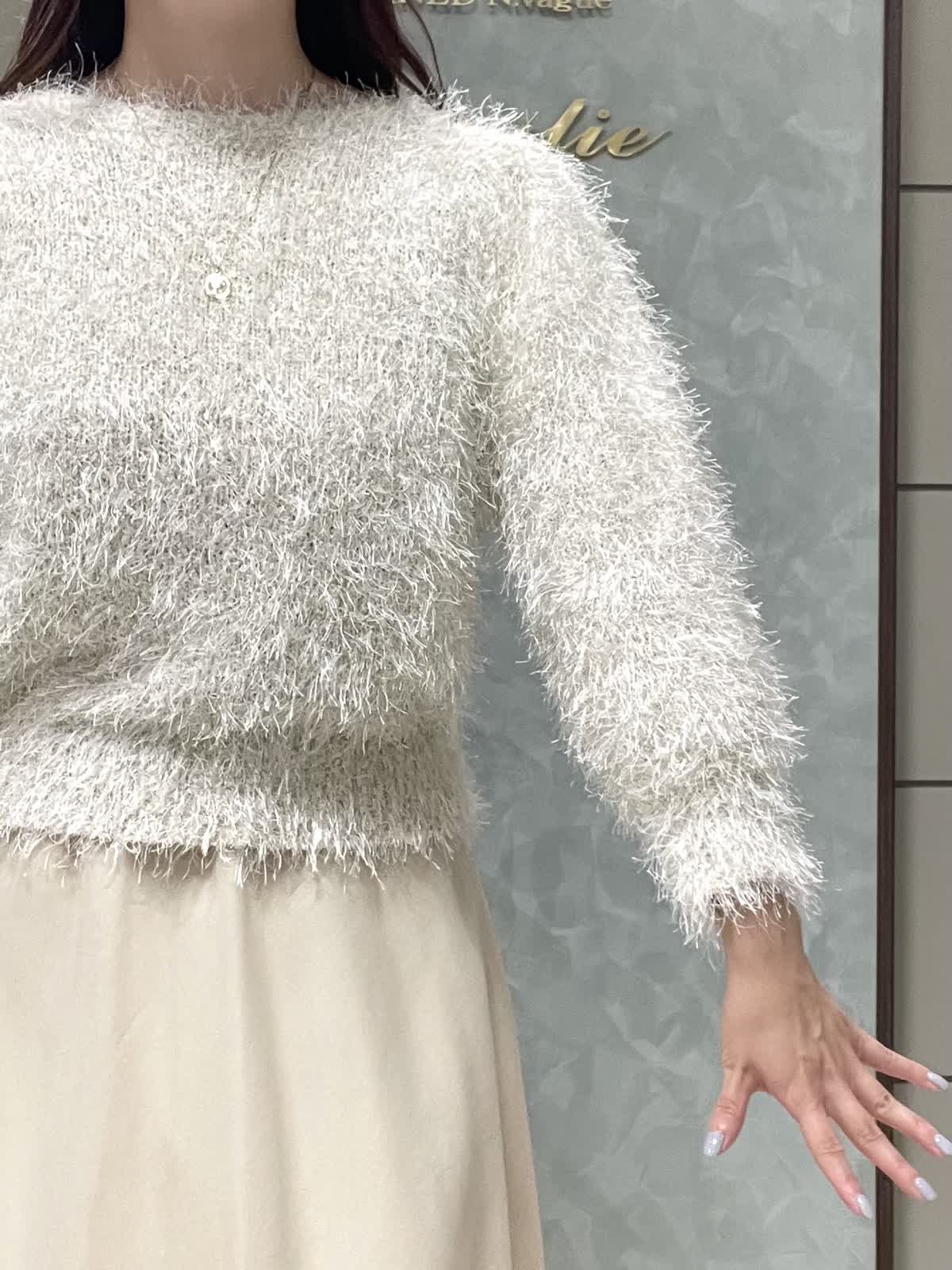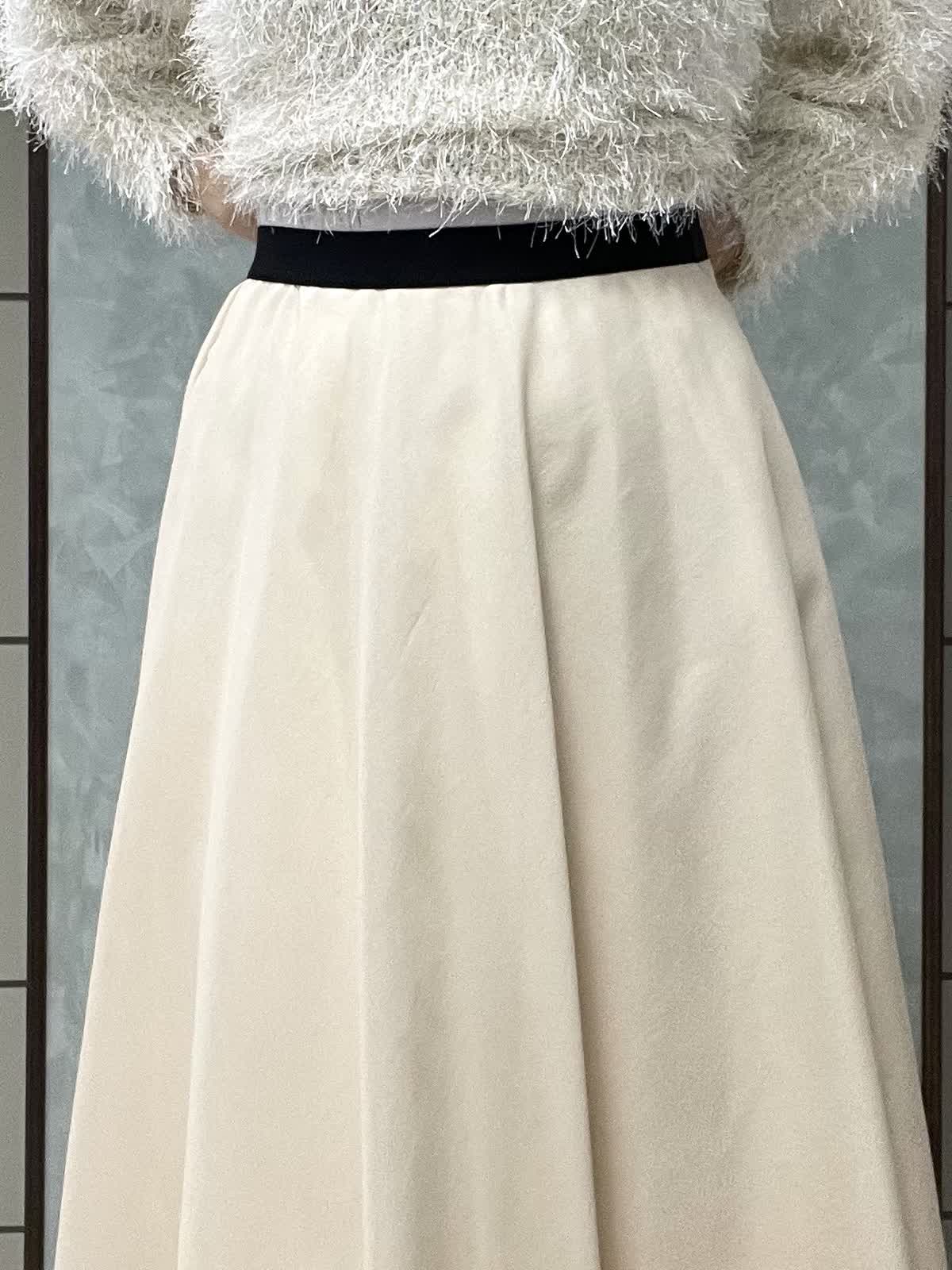【着用サイズ】ニット:9号 スカート:7号 年末年始のイベントにオススメ!華やかなワントーンコーデです。ふわっとしたシャギー素材に袖のタックで立体感が出て、着るだけで女性らしい雰囲気に。ネックラインは開きすぎず詰まりすぎず程よいラウンドネックです。身頃はコンパクトなので、ボリュームのあるボトムとも相性◎です。スカートは軽さとハリのあるオーガンジー素材で、広がりすぎないフレアシルエットです。光沢感もあるので華やかさが出ます。ウエストはオールゴムで履き心地良いです。透け感も気にならないです。着丈は157センチで足首くらいです。左ファスナー、ポケットなしです。