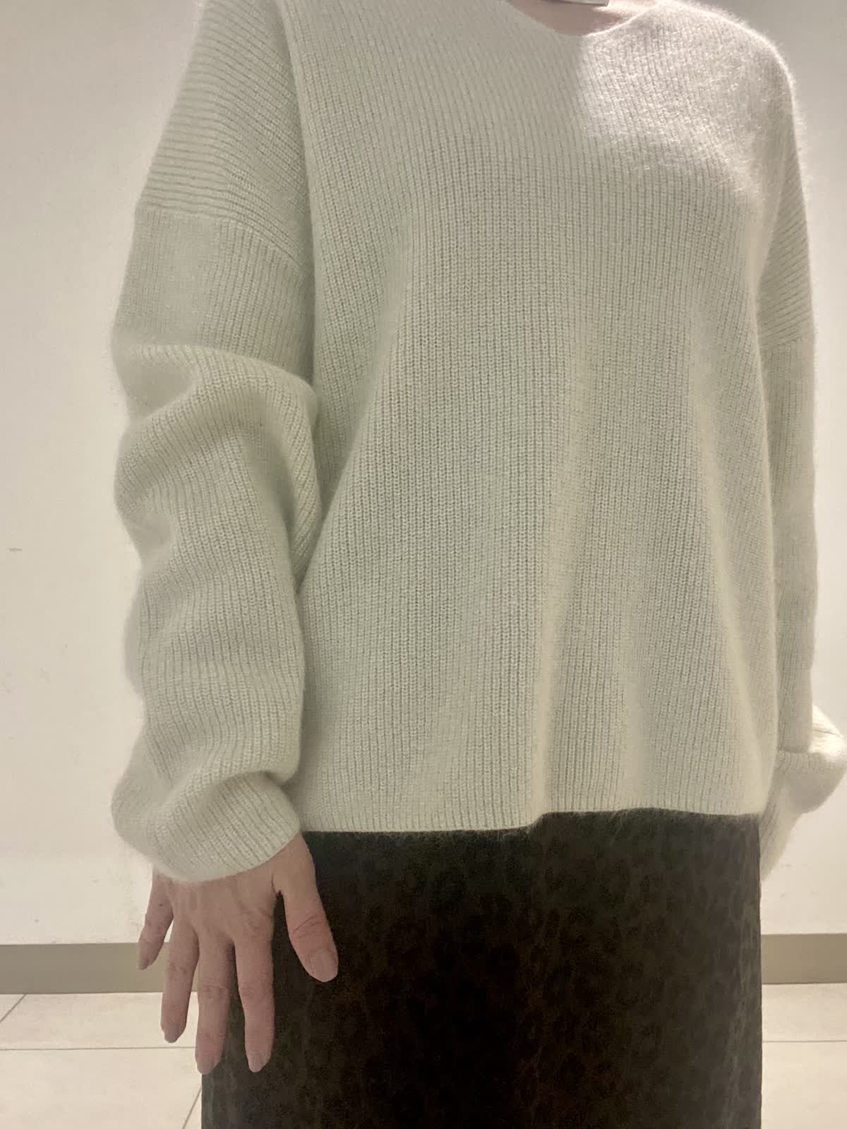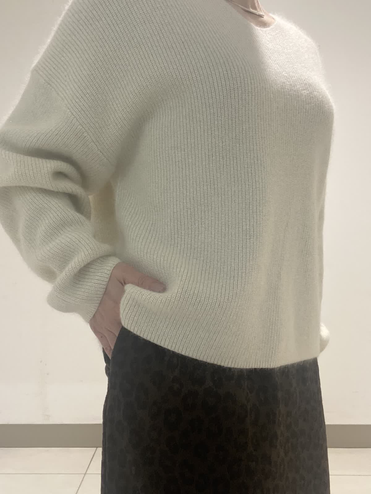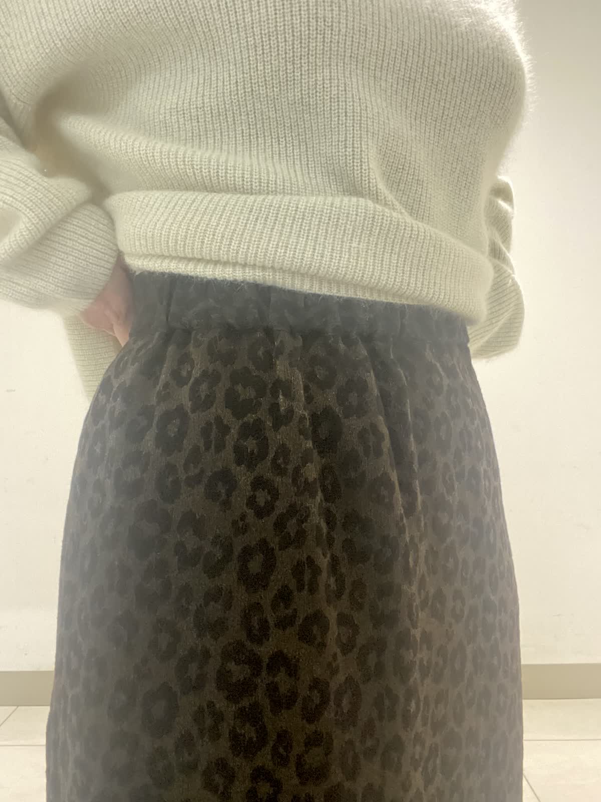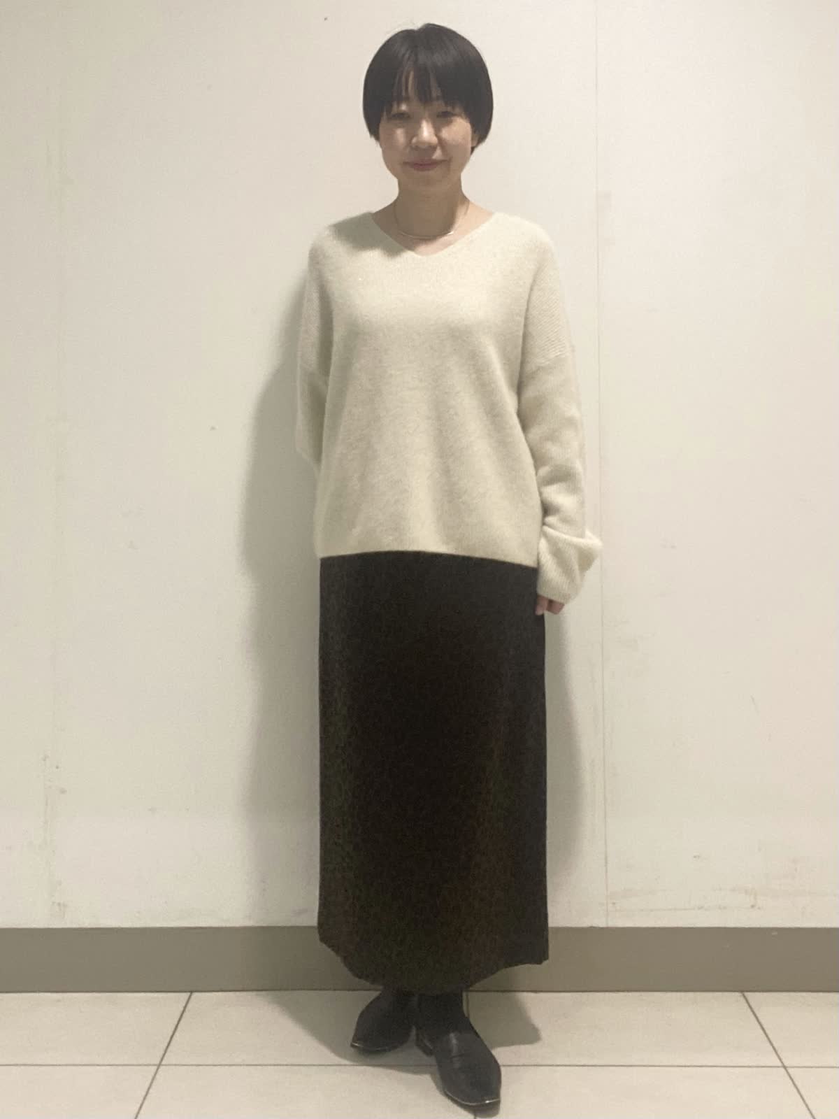 【着用サイズ】ニット:フリー スカート:9号 ふんわりとしたアンゴラ混の糸にラメとスパンコールを掛け合わせた華やかなニット。深すぎないVネックが首元をスッキリと見せてくれます。レオパード柄のスカートはAラインでスタイルアップ。ウエストがゴム仕様なのも嬉しいポイント。華やかさのあるスタイリングは年末年始のお出掛けにオススメです◎。