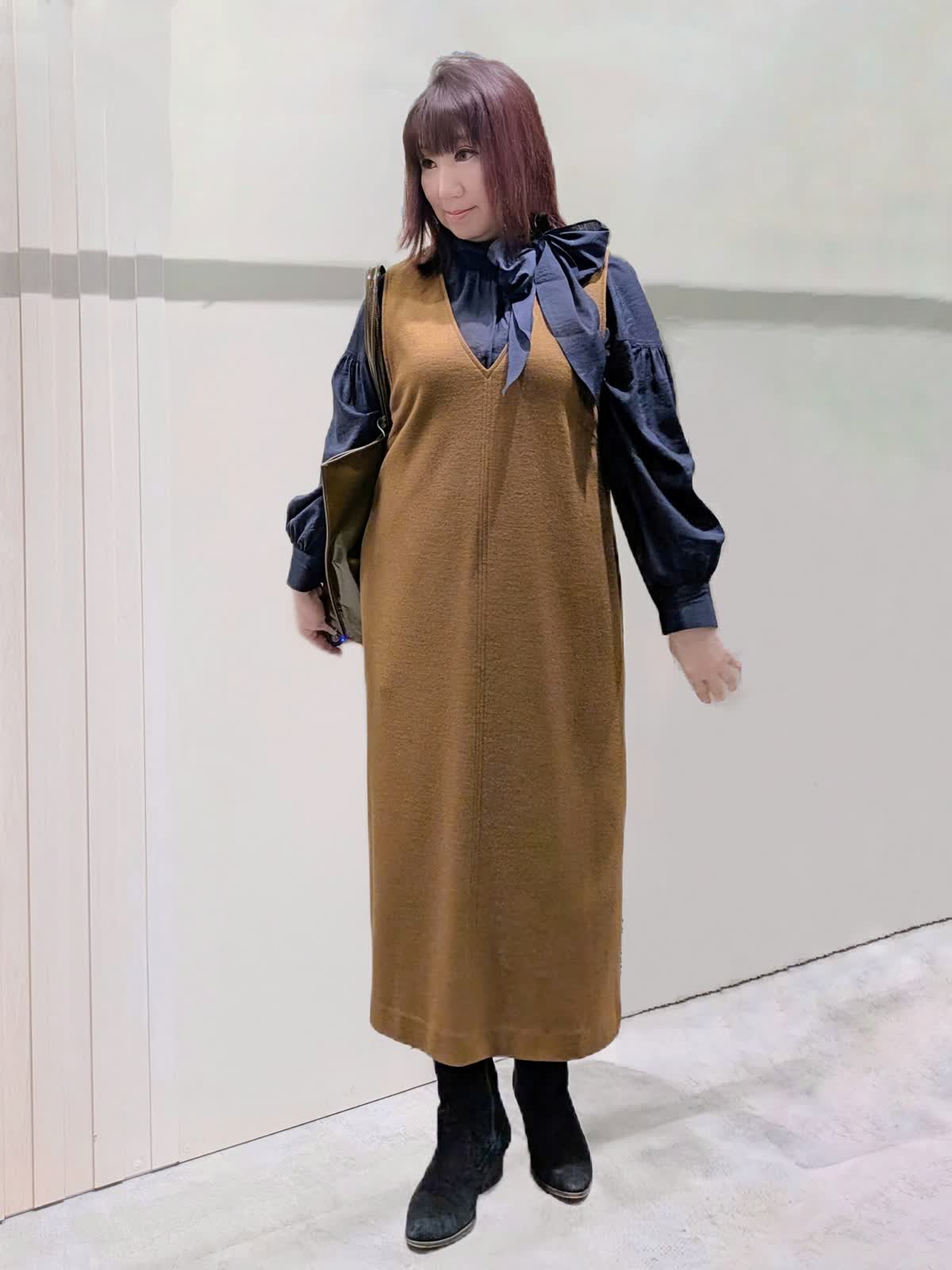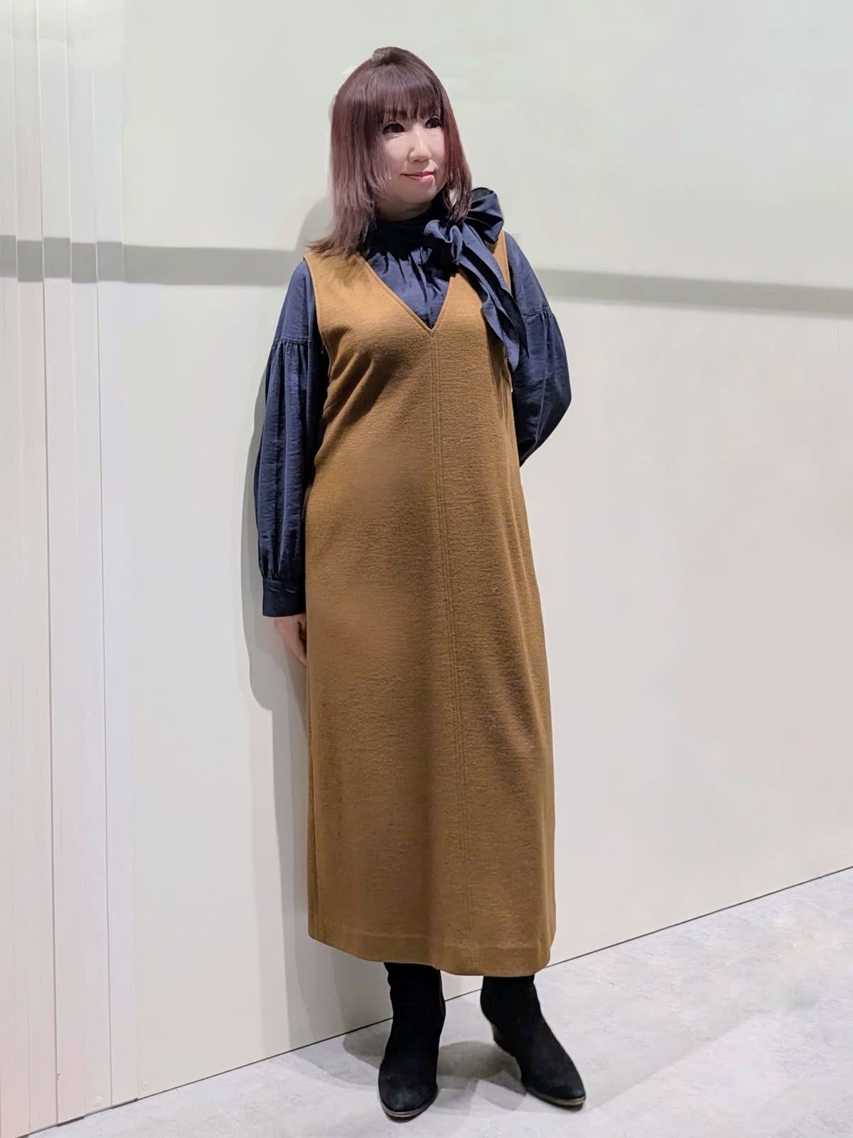 【着用サイズ】ダウンコート、ジャンパースカート:9号 ニットジャケット、ブラウス:フリーサイズ【着用カラー】ダウンコート:ベージュ ニットジャケット:ブラウン ジャンパースカート:キンチャ ブラウス:ネイビー 冬の暖かコーディネート 軽くて、保温性・撥水防水効果もある暖かダウンコートは、上品なマット生地でピーコート風のデザインがポイントです。ゆとりのあるサイズ感と程良い丈感で気軽に羽織れてボトムを選びません。軽やかな着心地のニットジャケットは、ムートンの様な温かさで大きすぎず着ぶくれもしにくくです。大き過ぎないサイズ感でコートのインナーにもご利用でき 長いシーズン活用できるアイテムです。深めのVネックがポイントのジャンパースカートは、暖かみのあるウールジャージ素材でストレッチ性も兼ね備えたストレスフリーな着心地です。様々なインナーでレイヤードをお楽しみ頂けます。ボウタイ付ブラウスは、取り外しも可能で色んなバリエーションを楽しんで頂けます。