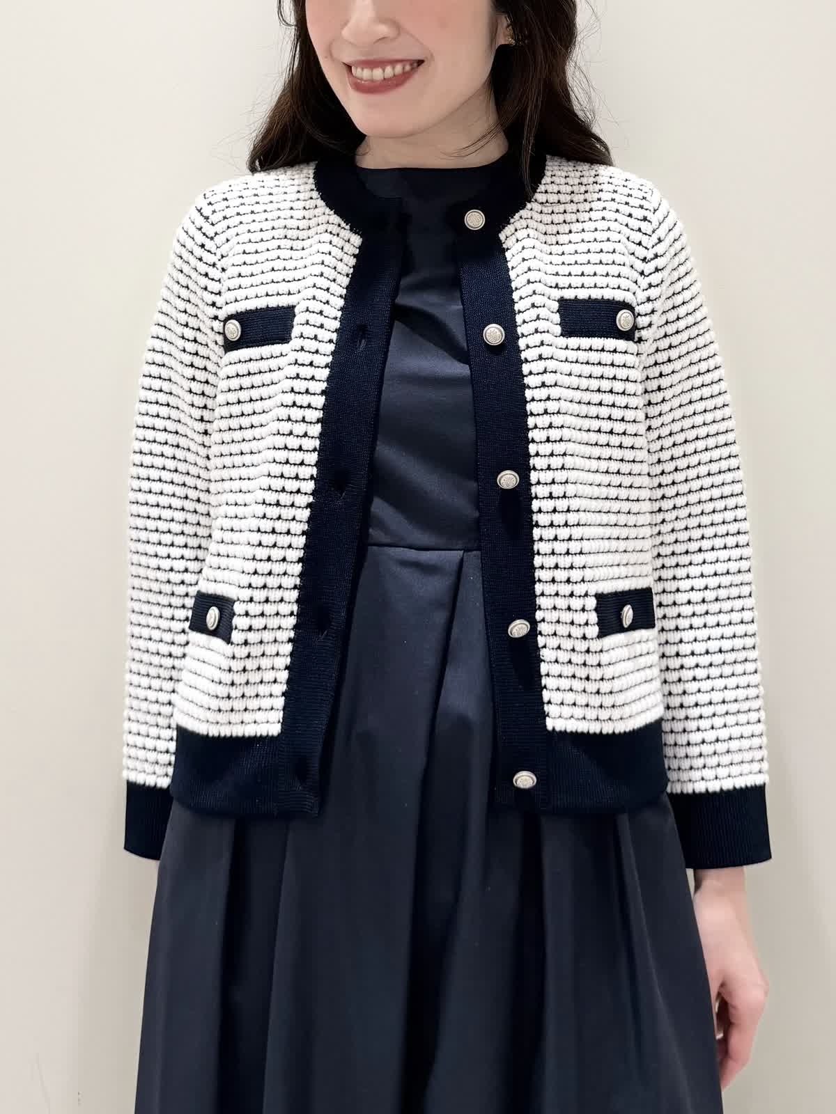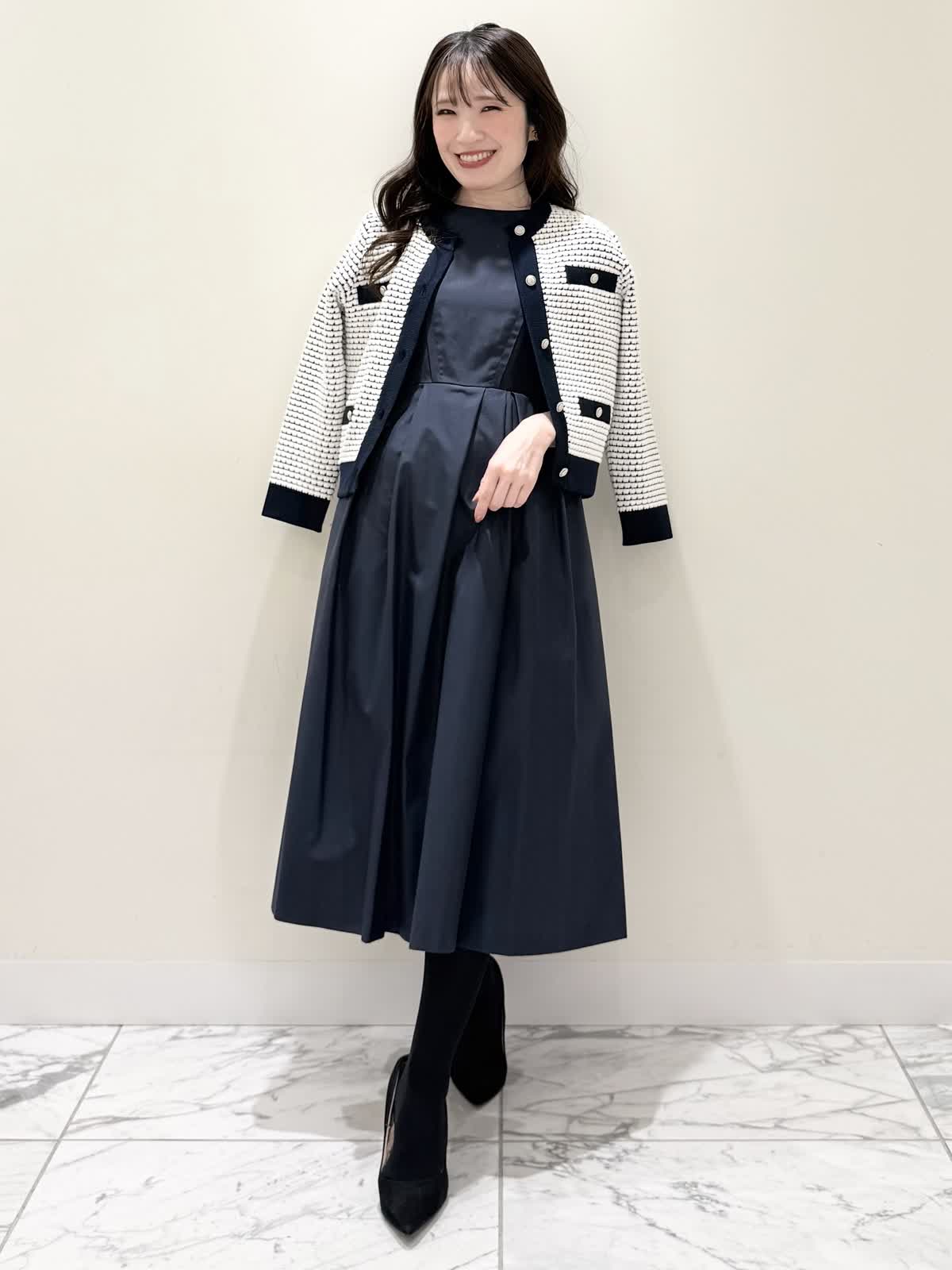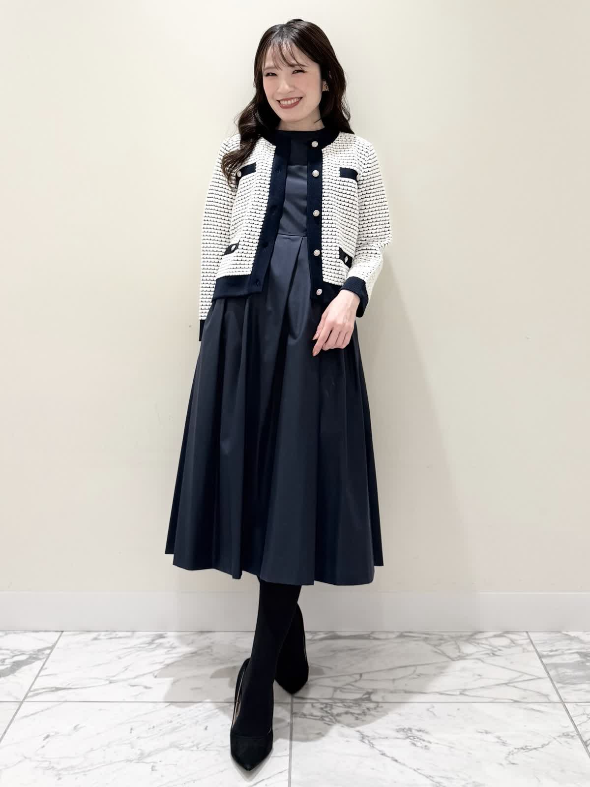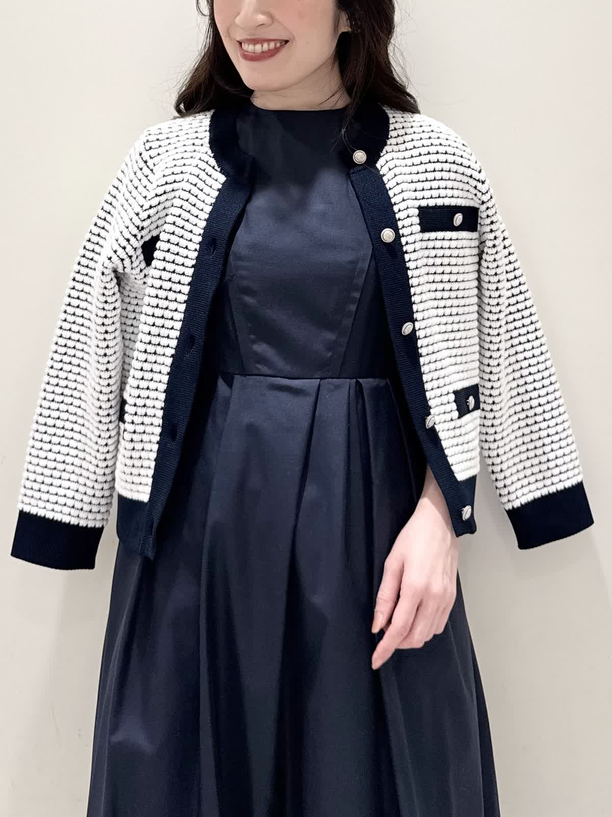 【着用サイズ/カラー】カーディガン:7号/オフホワイト カーディガン:7号/ネイビー ワンピース:5号/ネイビー お仕事からお食事、お出かけにおすすめなコーディネート。ワンピースは1枚で着やすい5分袖、サラっとしたシワになりにくい生地のフィット&フレアのシルエット。高め位置の切り替えからランダムなタックの広がりすぎないフレア。ウエストの後ろはゴム仕様で窮屈感なく着られます。アームホールはゆとりがあるのですが、バスト部分がややピッタリとしているのでバストがある方はいつもより1サイズ大きめが良いかと思います。羽織りには配色が可愛いニットカーディガン。ジャケット風のデザインがきちんと見えしお仕事にもおすすめ。ノンウールで薄手すぎない生地なのでしっかりと羽織れワンピースにも相性が良い着丈です。いつものサイズで大丈夫です。お食事、お出かけには羽織りをチクチクしないラメシャギーニットカーディガンに変えてキラキラとさせてみました。コンパクト丈なのでサッと羽織るだけでまとまり感があります。こちらもいつものサイズで大丈夫です。