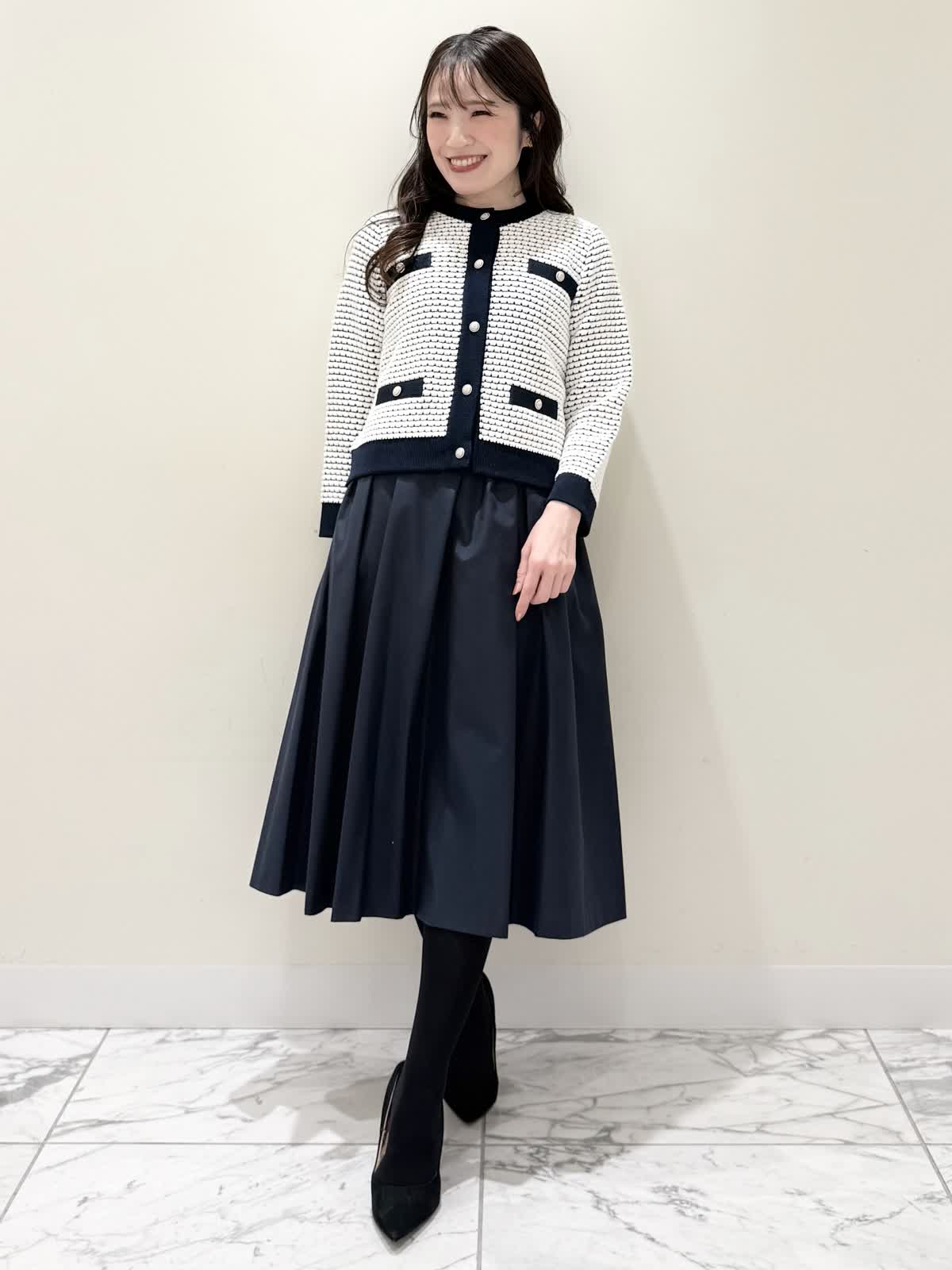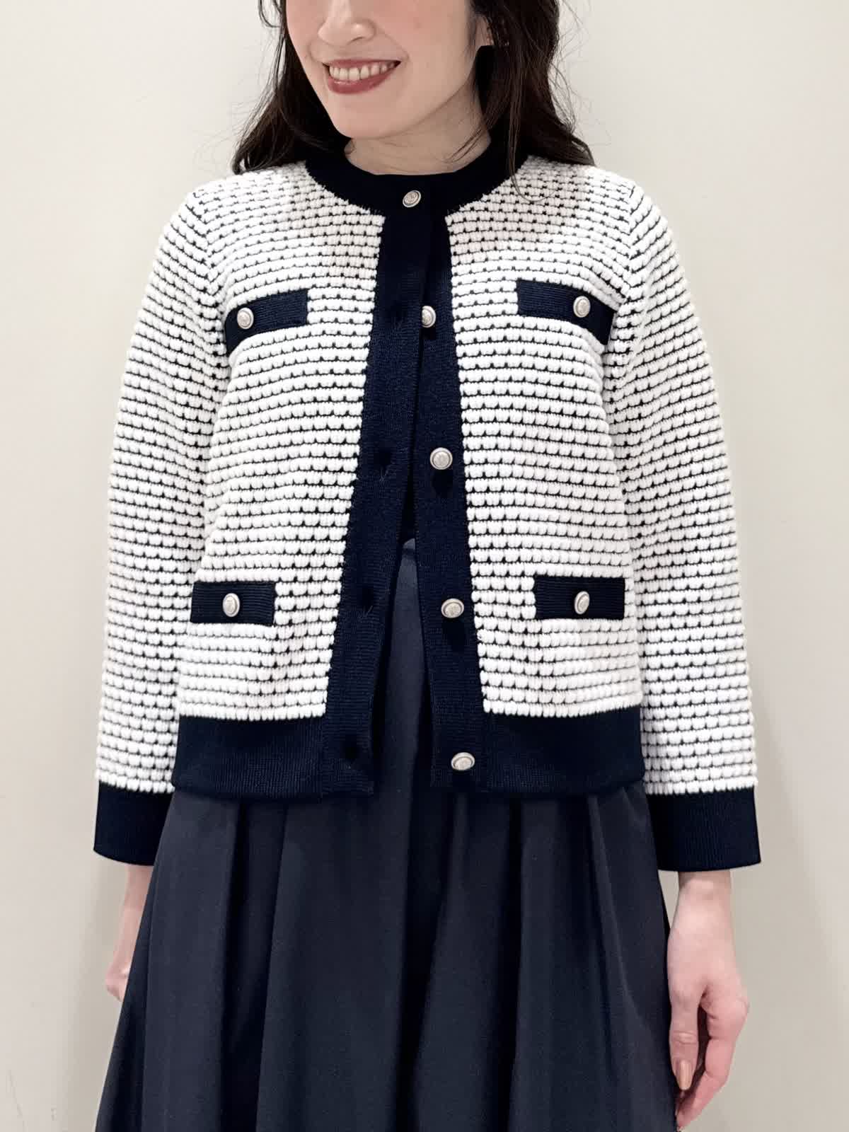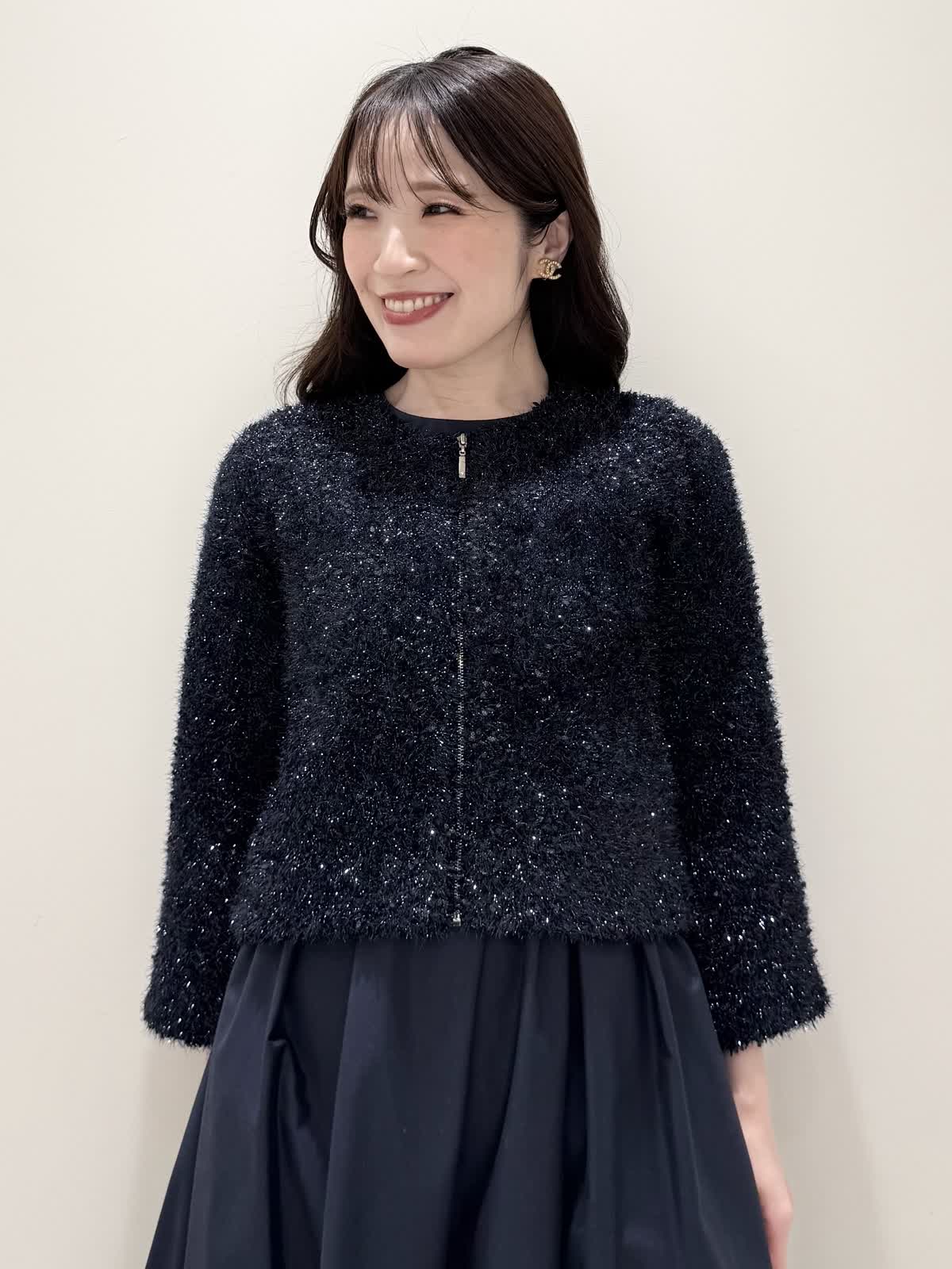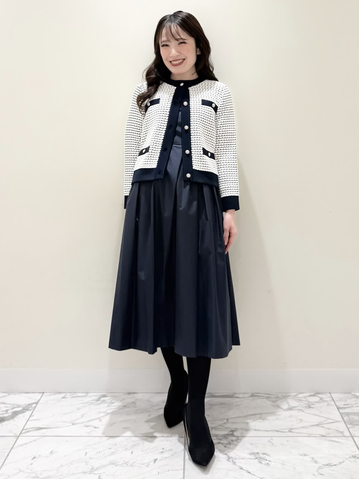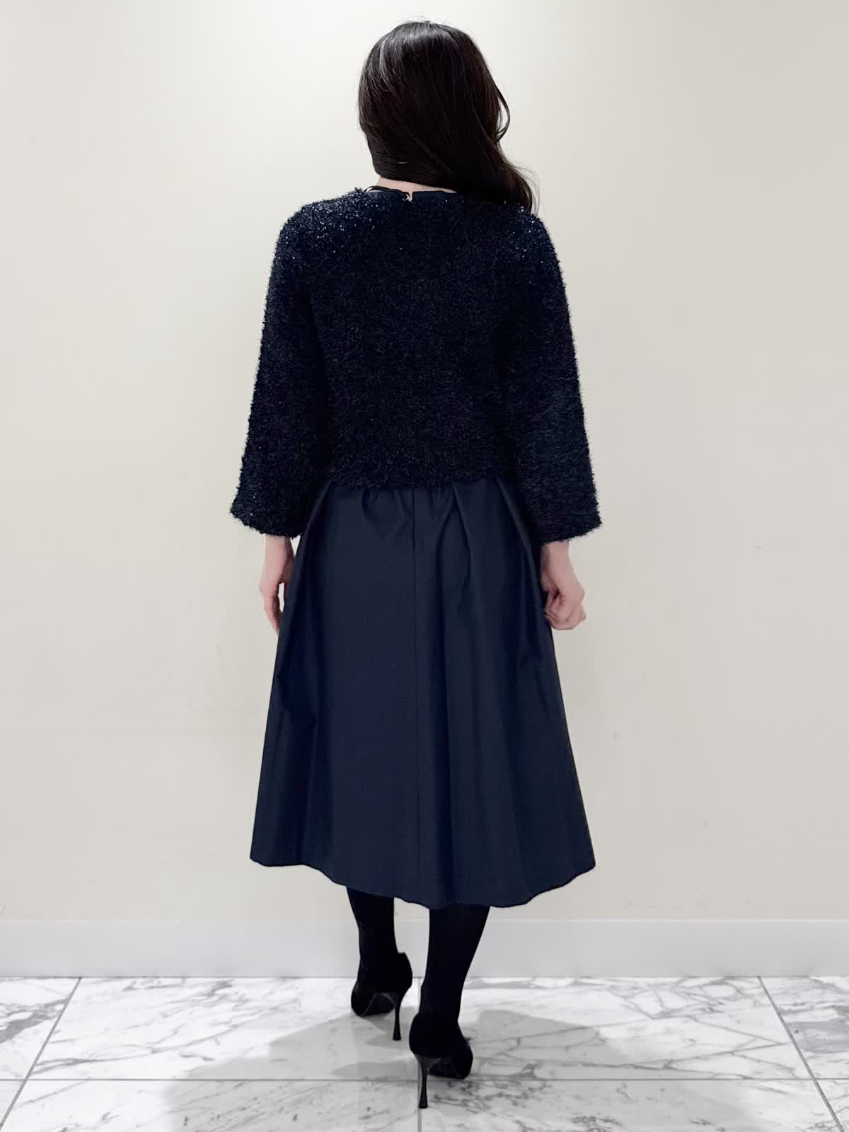 【着用サイズ/カラー】カーディガン:7号/オフホワイト カーディガン:7号/ネイビー ワンピース:5号/ネイビー お仕事からお食事、お出かけにおすすめなコーディネート。ワンピースは1枚で着やすい5分袖、サラっとしたシワになりにくい生地のフィット&フレアのシルエット。高め位置の切り替えからランダムなタックの広がりすぎないフレア。ウエストの後ろはゴム仕様で窮屈感なく着られます。アームホールはゆとりがあるのですが、バスト部分がややピッタリとしているのでバストがある方はいつもより1サイズ大きめが良いかと思います。羽織りには配色が可愛いニットカーディガン。ジャケット風のデザインがきちんと見えしお仕事にもおすすめ。ノンウールで薄手すぎない生地なのでしっかりと羽織れワンピースにも相性が良い着丈です。いつものサイズで大丈夫です。お食事、お出かけには羽織りをチクチクしないラメシャギーニットカーディガンに変えてキラキラとさせてみました。コンパクト丈なのでサッと羽織るだけでまとまり感があります。こちらもいつものサイズで大丈夫です。