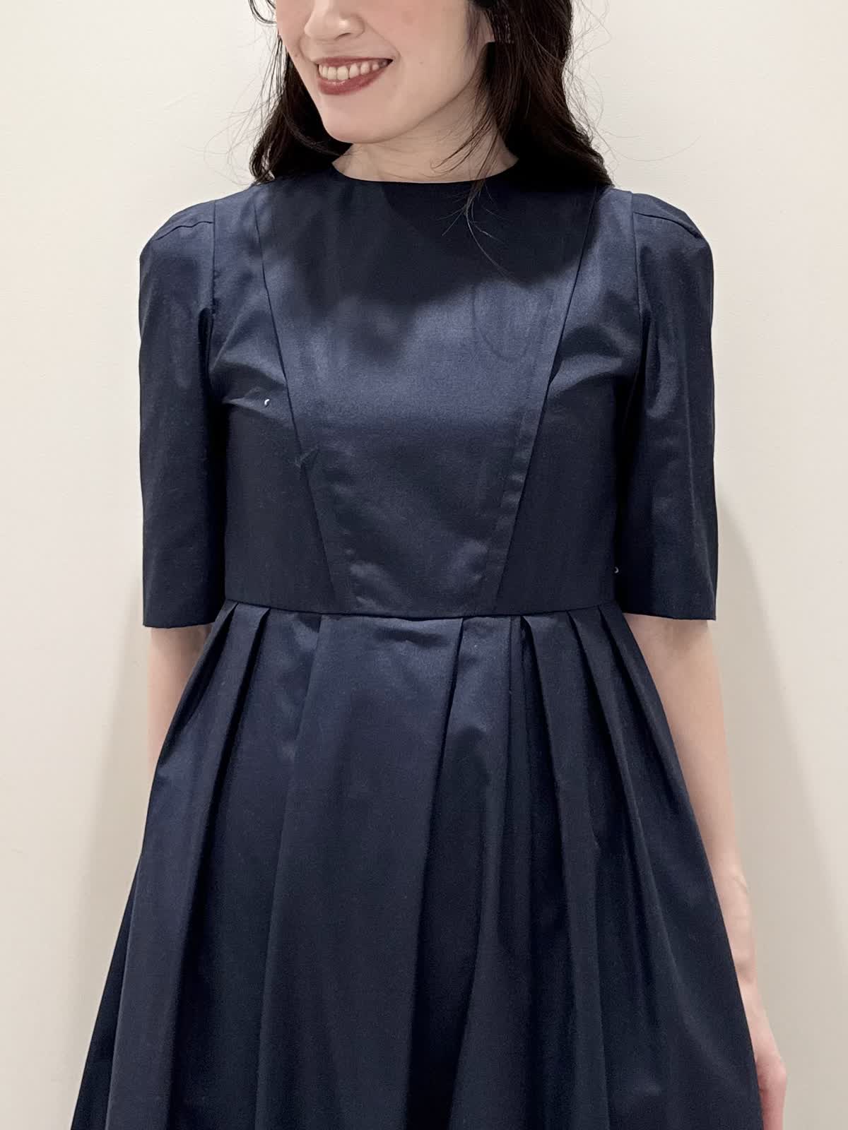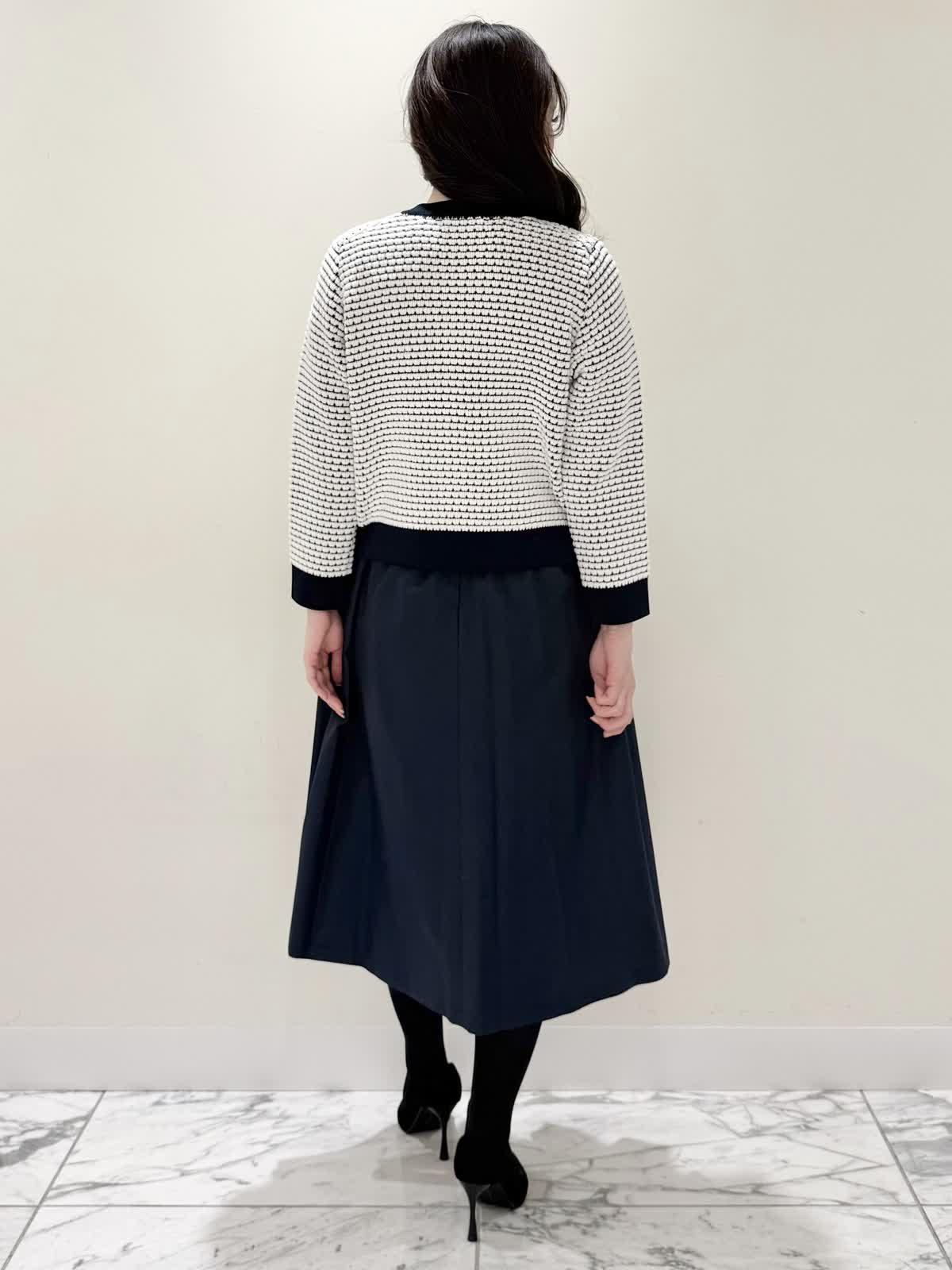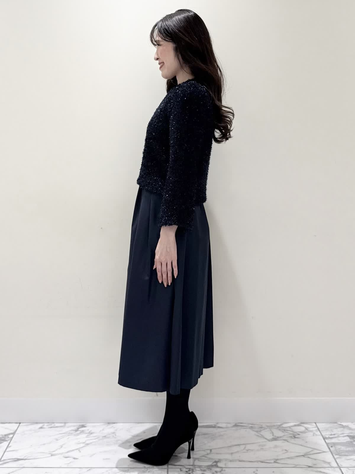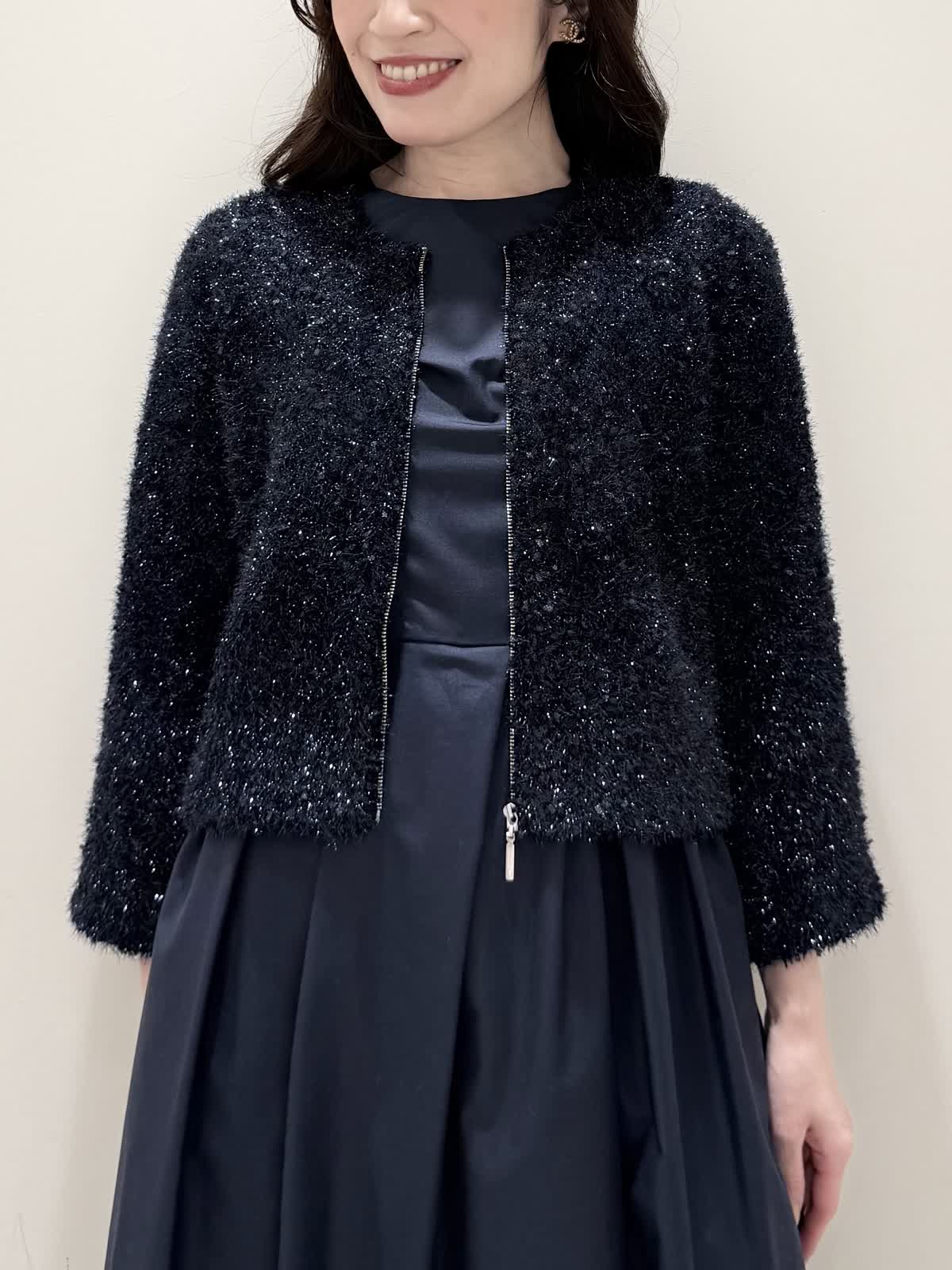 【着用サイズ/カラー】カーディガン:7号/オフホワイト カーディガン:7号/ネイビー ワンピース:5号/ネイビー お仕事からお食事、お出かけにおすすめなコーディネート。ワンピースは1枚で着やすい5分袖、サラっとしたシワになりにくい生地のフィット&フレアのシルエット。高め位置の切り替えからランダムなタックの広がりすぎないフレア。ウエストの後ろはゴム仕様で窮屈感なく着られます。アームホールはゆとりがあるのですが、バスト部分がややピッタリとしているのでバストがある方はいつもより1サイズ大きめが良いかと思います。羽織りには配色が可愛いニットカーディガン。ジャケット風のデザインがきちんと見えしお仕事にもおすすめ。ノンウールで薄手すぎない生地なのでしっかりと羽織れワンピースにも相性が良い着丈です。いつものサイズで大丈夫です。お食事、お出かけには羽織りをチクチクしないラメシャギーニットカーディガンに変えてキラキラとさせてみました。コンパクト丈なのでサッと羽織るだけでまとまり感があります。こちらもいつものサイズで大丈夫です。