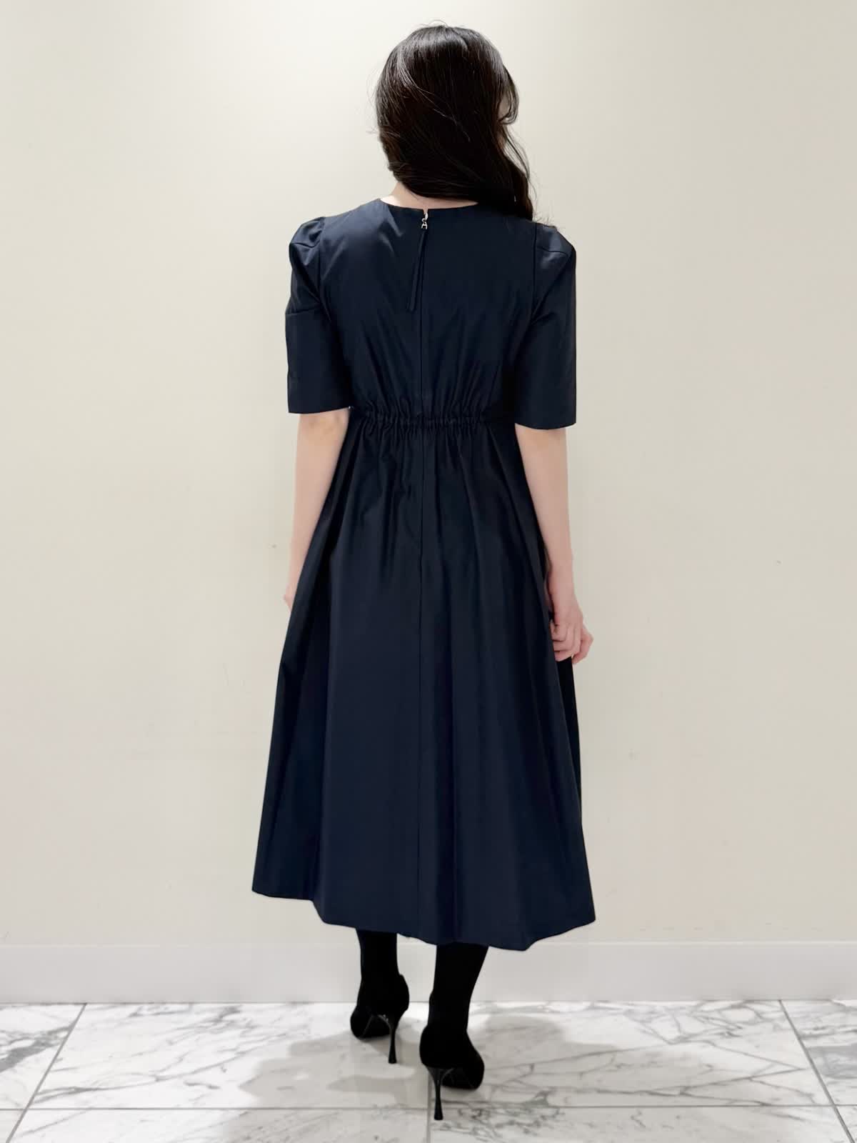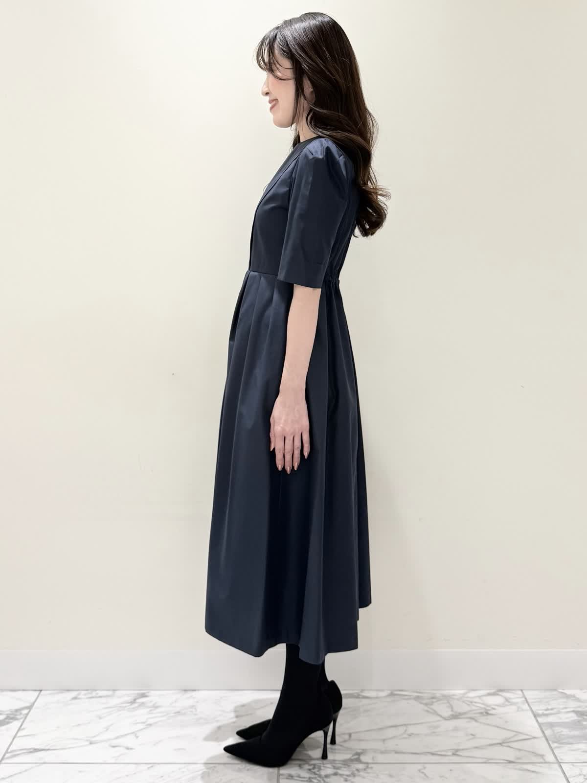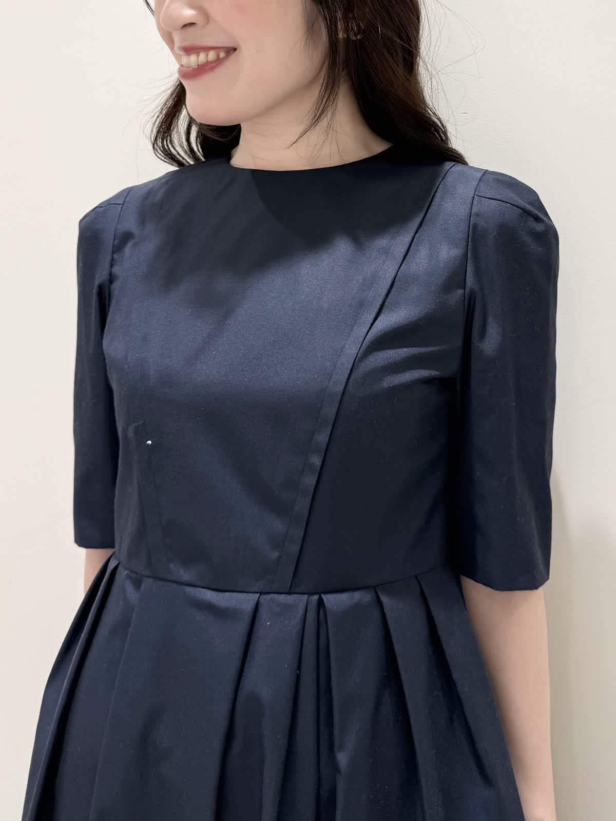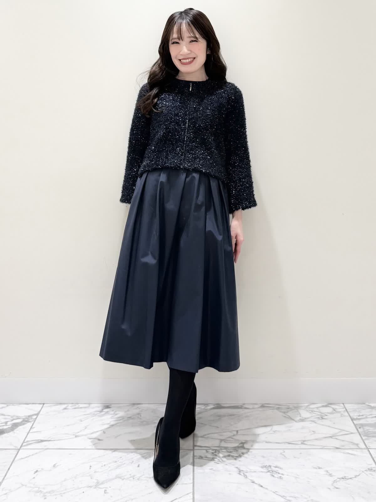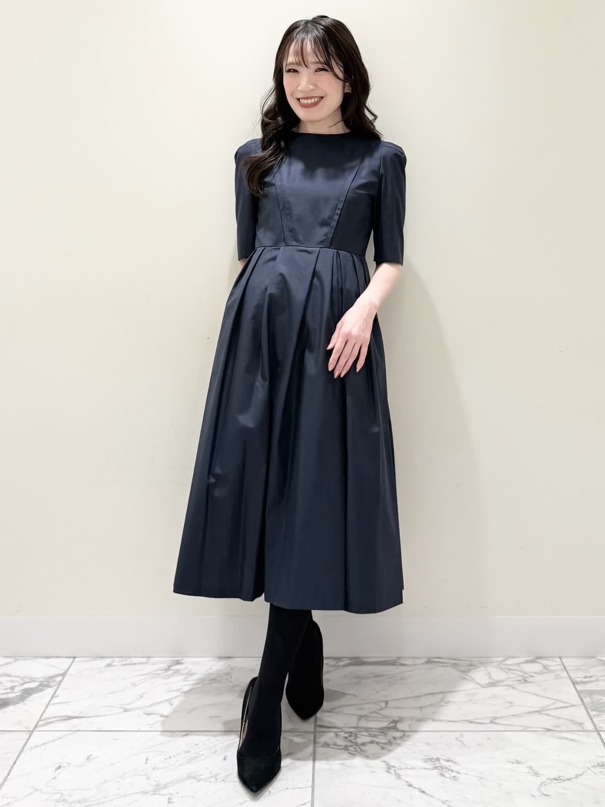 【着用サイズ/カラー】カーディガン:7号/オフホワイト カーディガン:7号/ネイビー ワンピース:5号/ネイビー お仕事からお食事、お出かけにおすすめなコーディネート。ワンピースは1枚で着やすい5分袖、サラっとしたシワになりにくい生地のフィット&フレアのシルエット。高め位置の切り替えからランダムなタックの広がりすぎないフレア。ウエストの後ろはゴム仕様で窮屈感なく着られます。アームホールはゆとりがあるのですが、バスト部分がややピッタリとしているのでバストがある方はいつもより1サイズ大きめが良いかと思います。羽織りには配色が可愛いニットカーディガン。ジャケット風のデザインがきちんと見えしお仕事にもおすすめ。ノンウールで薄手すぎない生地なのでしっかりと羽織れワンピースにも相性が良い着丈です。いつものサイズで大丈夫です。お食事、お出かけには羽織りをチクチクしないラメシャギーニットカーディガンに変えてキラキラとさせてみました。コンパクト丈なのでサッと羽織るだけでまとまり感があります。こちらもいつものサイズで大丈夫です。