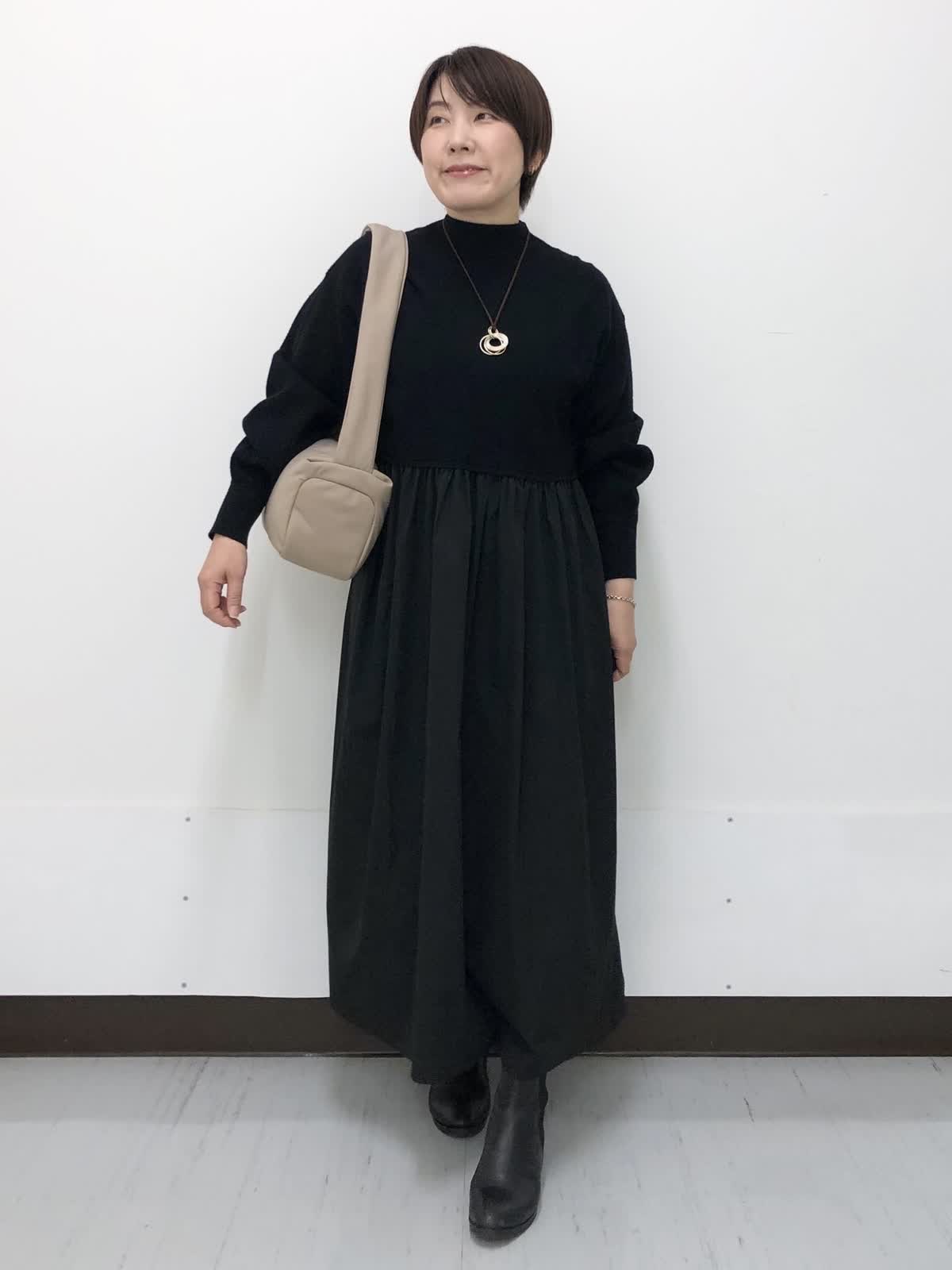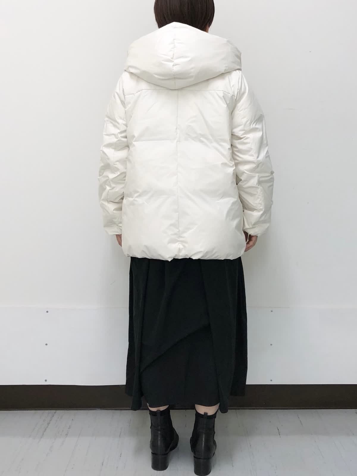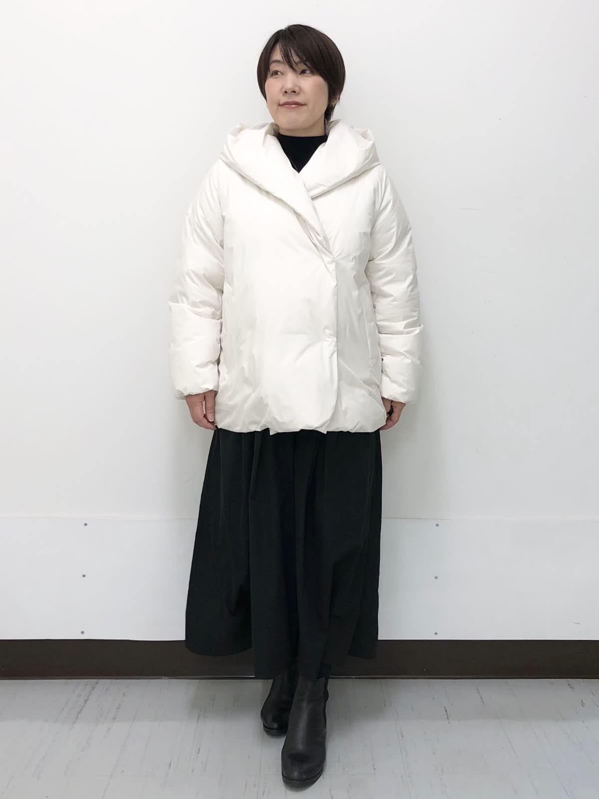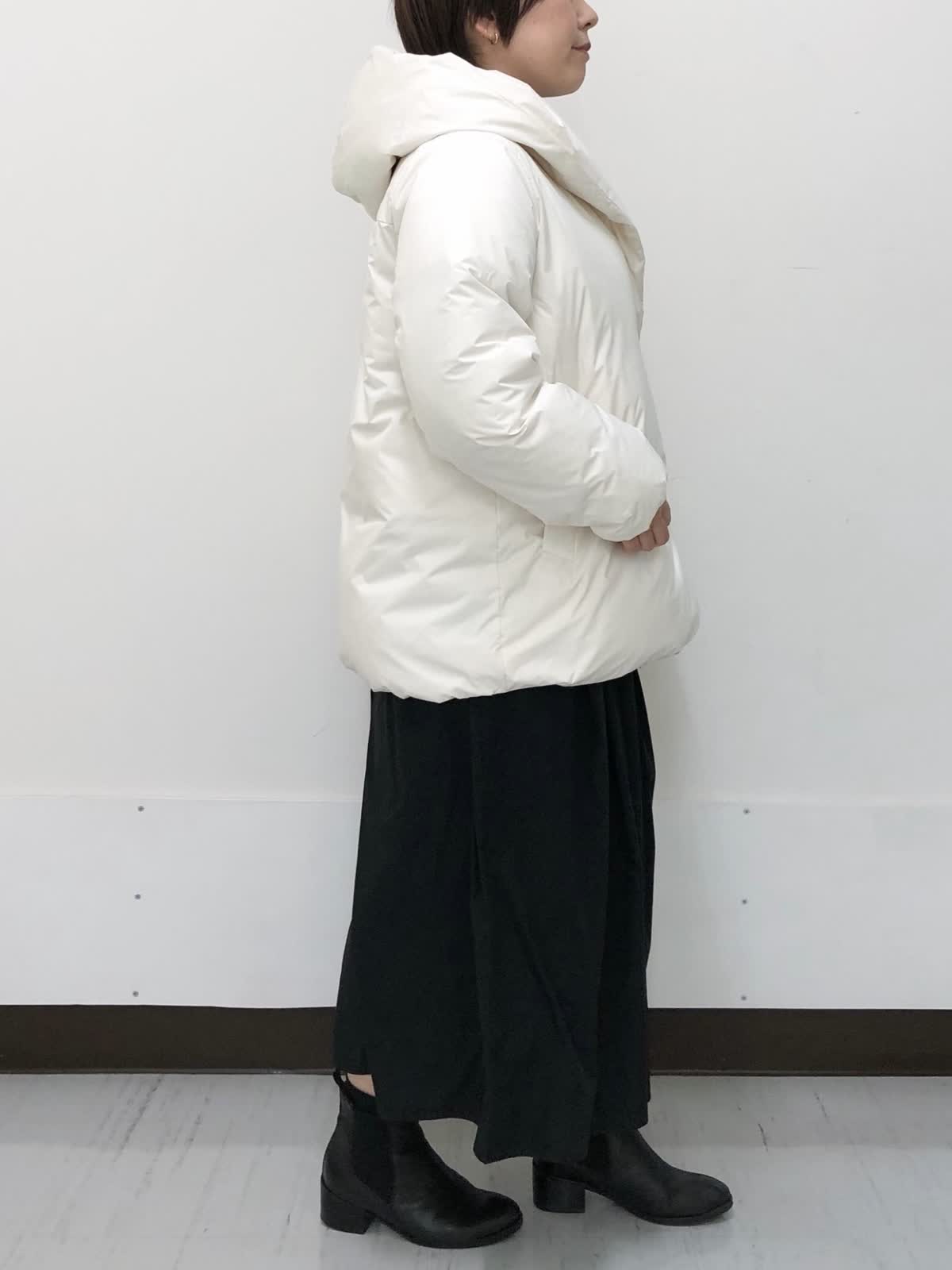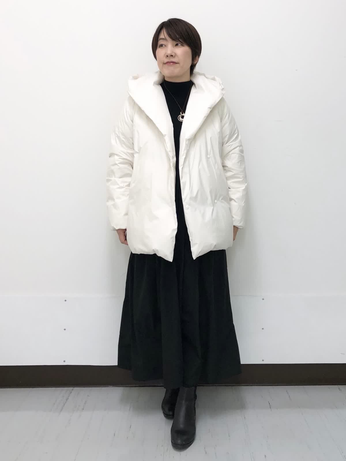 【着用サイズ】すべて9号【着用カラー】コート:アイボリー ワンピース:ブラック 冬のお出かけスタイル。 ?ショールカラーが女性らしい雰囲気にしてくれるフード付きダウン。華やかさと防寒、どちらも叶えてくれる今年らしいシルエット。裾のドローコードでコクーンシルエットも楽しめます。ワンピースは異素材ドッキング。着るだけで決まるシルエットなのでアクセントにネックレスをあわせるだけでコーデが完成、悩まず着れる優秀アイテムです。