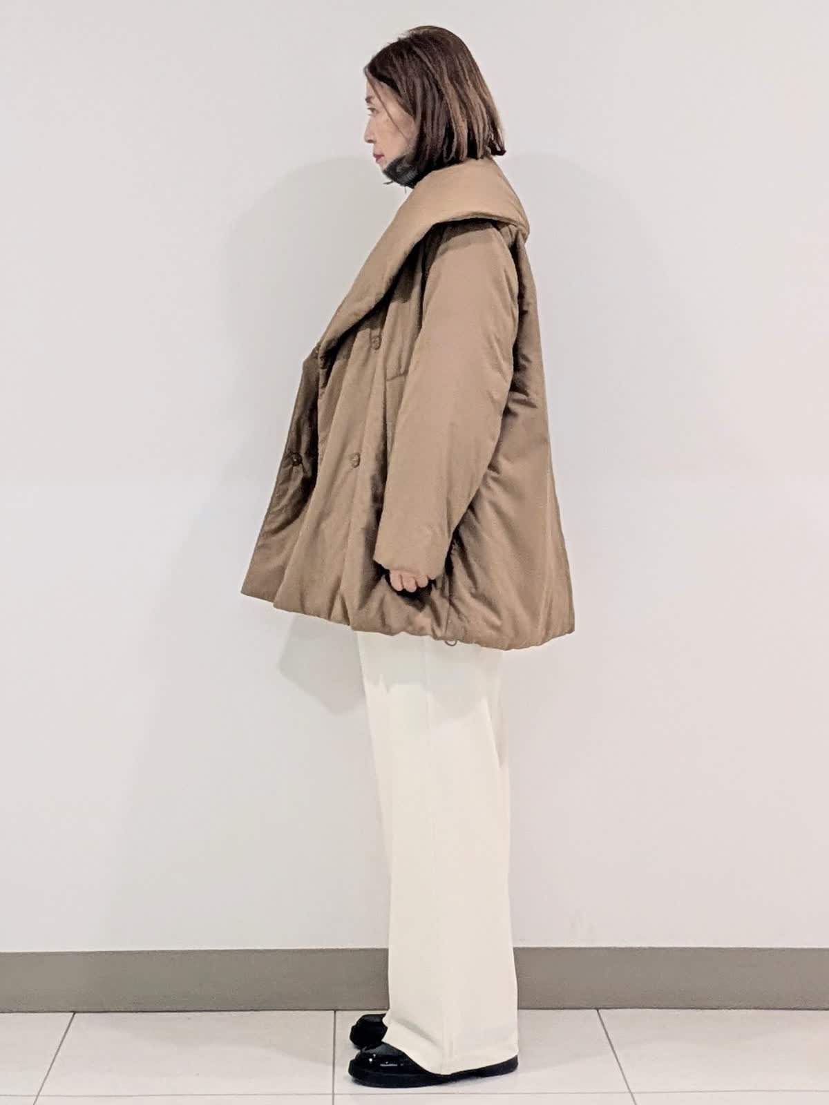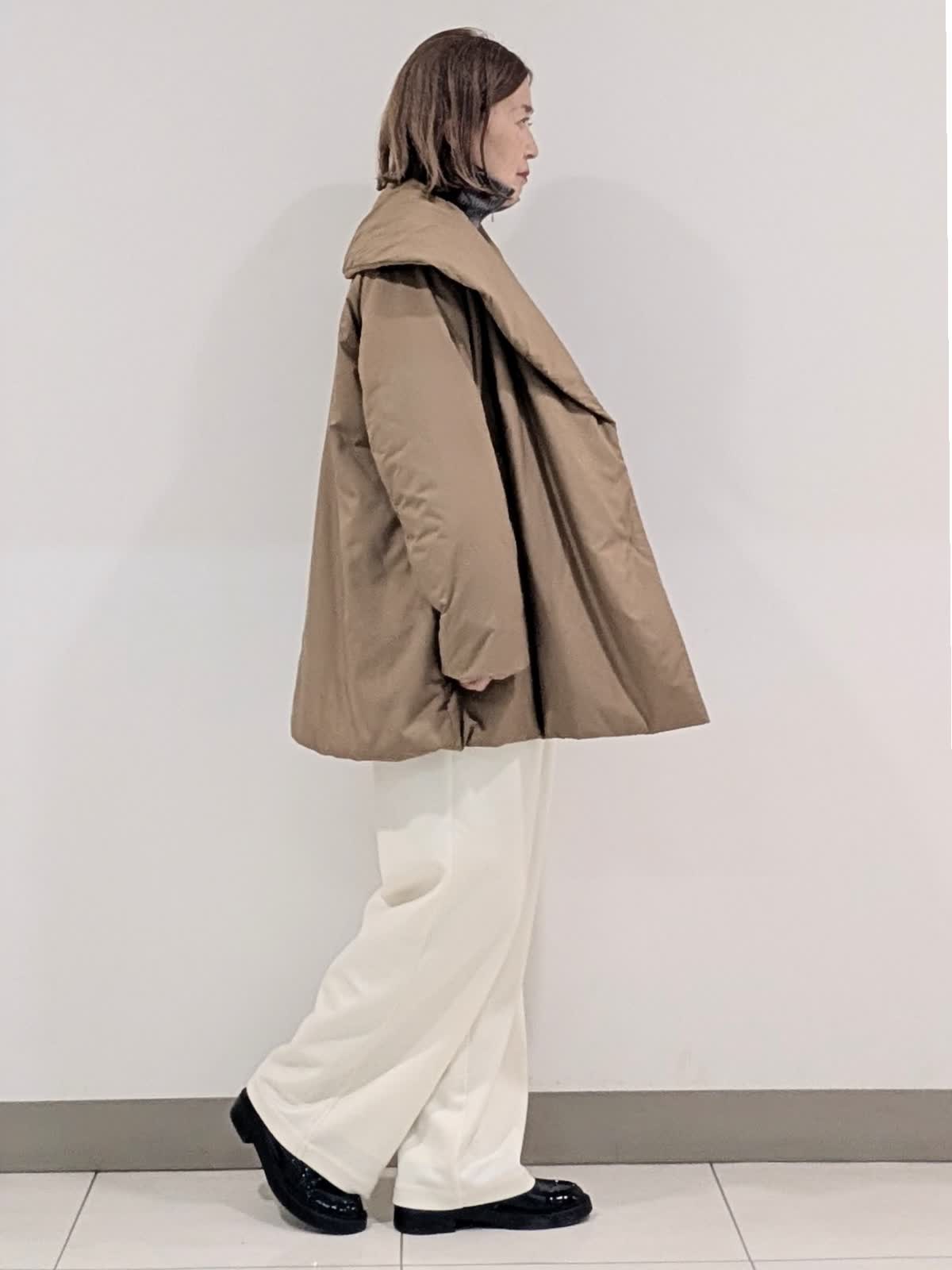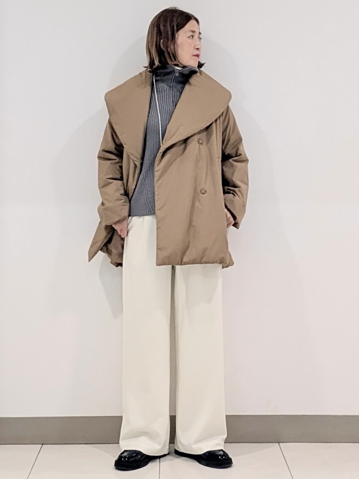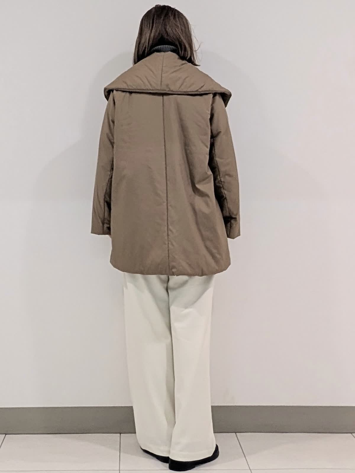 【着用サイズ9号】 アウターは、大きめなショールカラーが印象的な中綿コート。袖や肩まわりがスッキリと見えるようにパターンや中綿の分量感にこだわりました。撥水機能も備えたおすすめのアウターです◎ インナーはジップリブニットとタートルのレイヤード。 ジップのデザインですがカジュアルすぎずパンツでもスカートでも合わせられます。 合わせたボトムスは、ノンストレスな着心地が魅力のイージーパンツ。リラックス感があり脚を長くみせてくれるシルエットです。