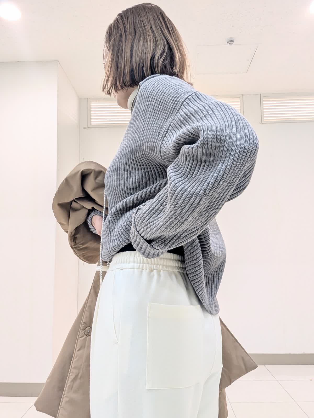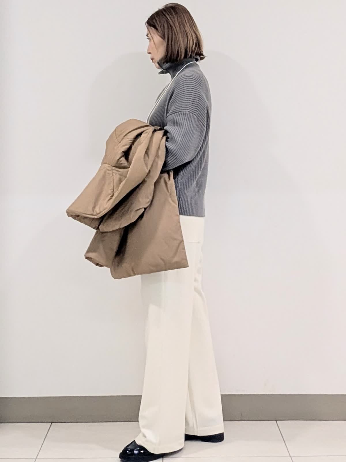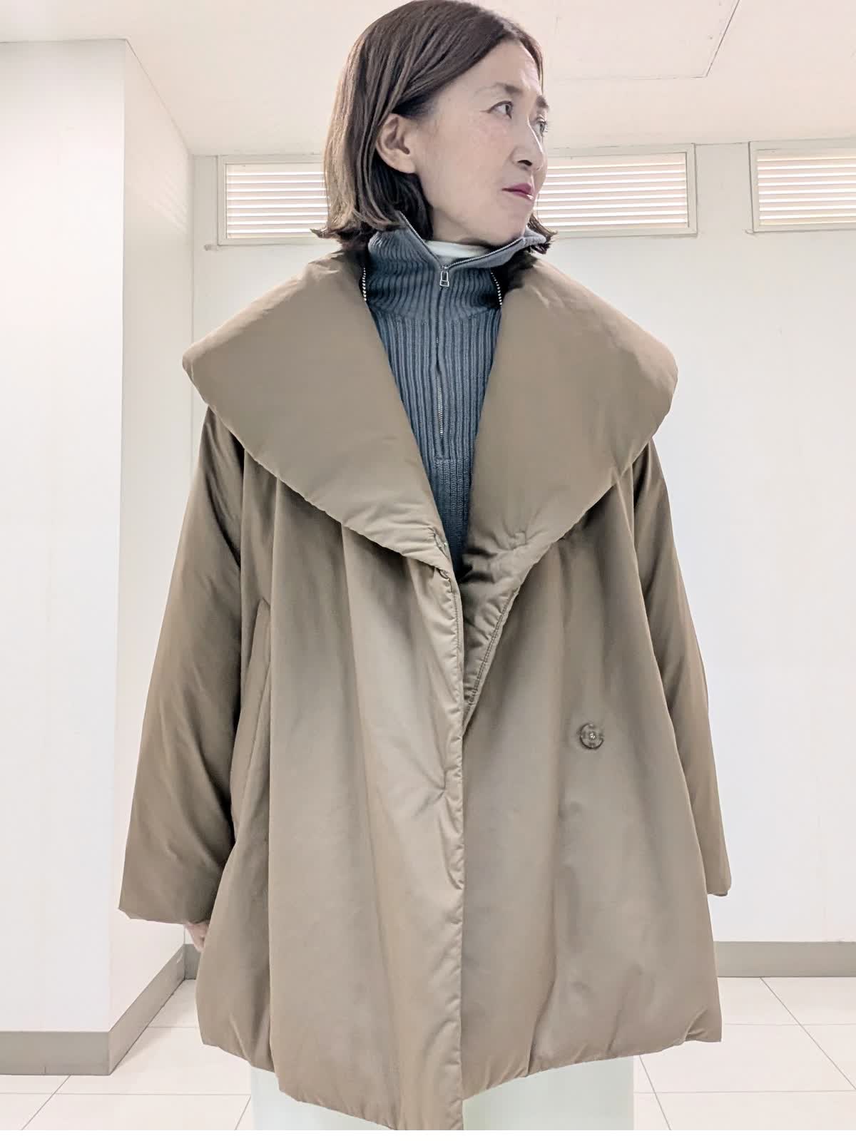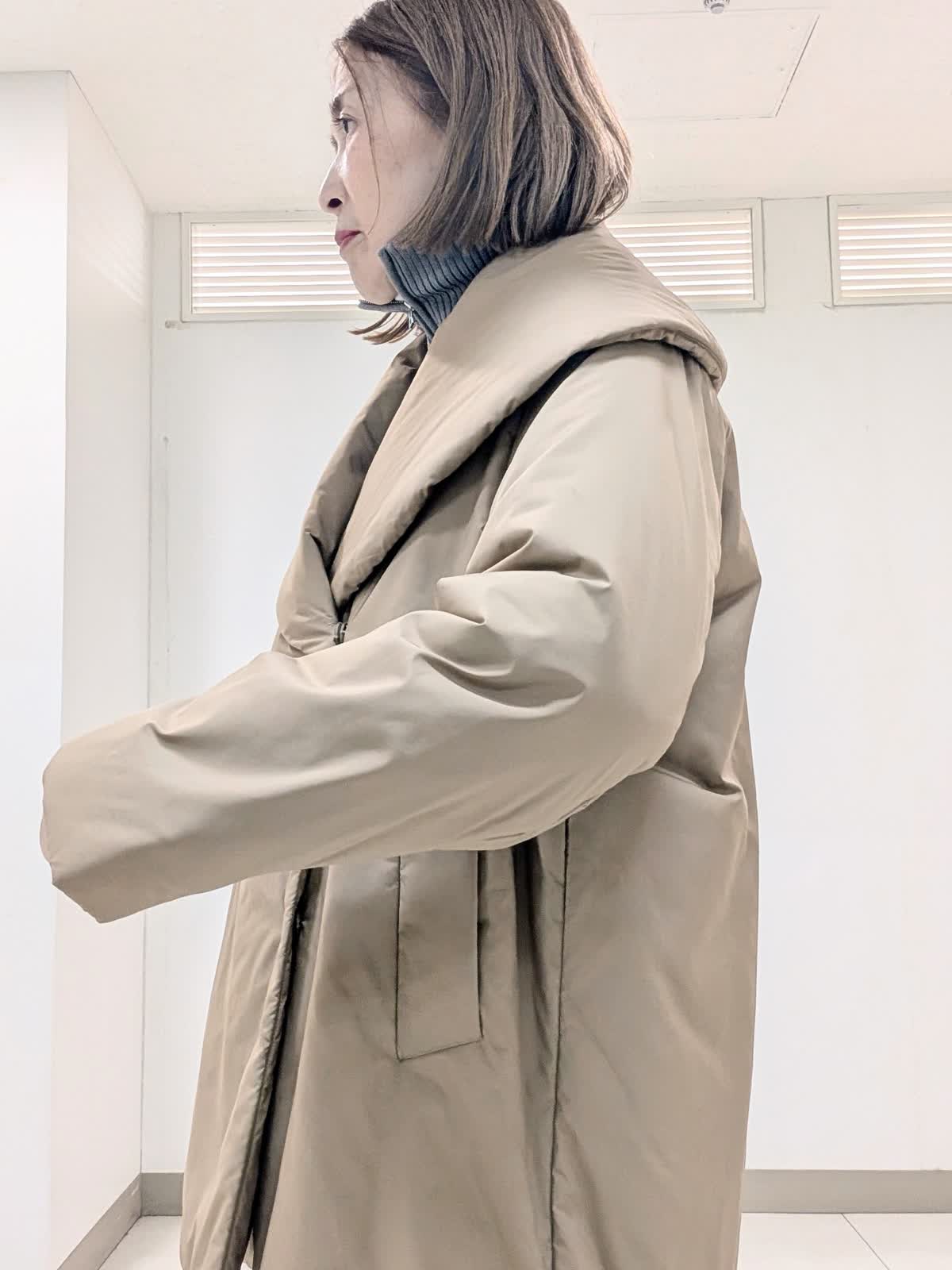 【着用サイズ9号】 アウターは、大きめなショールカラーが印象的な中綿コート。袖や肩まわりがスッキリと見えるようにパターンや中綿の分量感にこだわりました。撥水機能も備えたおすすめのアウターです◎ インナーはジップリブニットとタートルのレイヤード。 ジップのデザインですがカジュアルすぎずパンツでもスカートでも合わせられます。 合わせたボトムスは、ノンストレスな着心地が魅力のイージーパンツ。リラックス感があり脚を長くみせてくれるシルエットです。