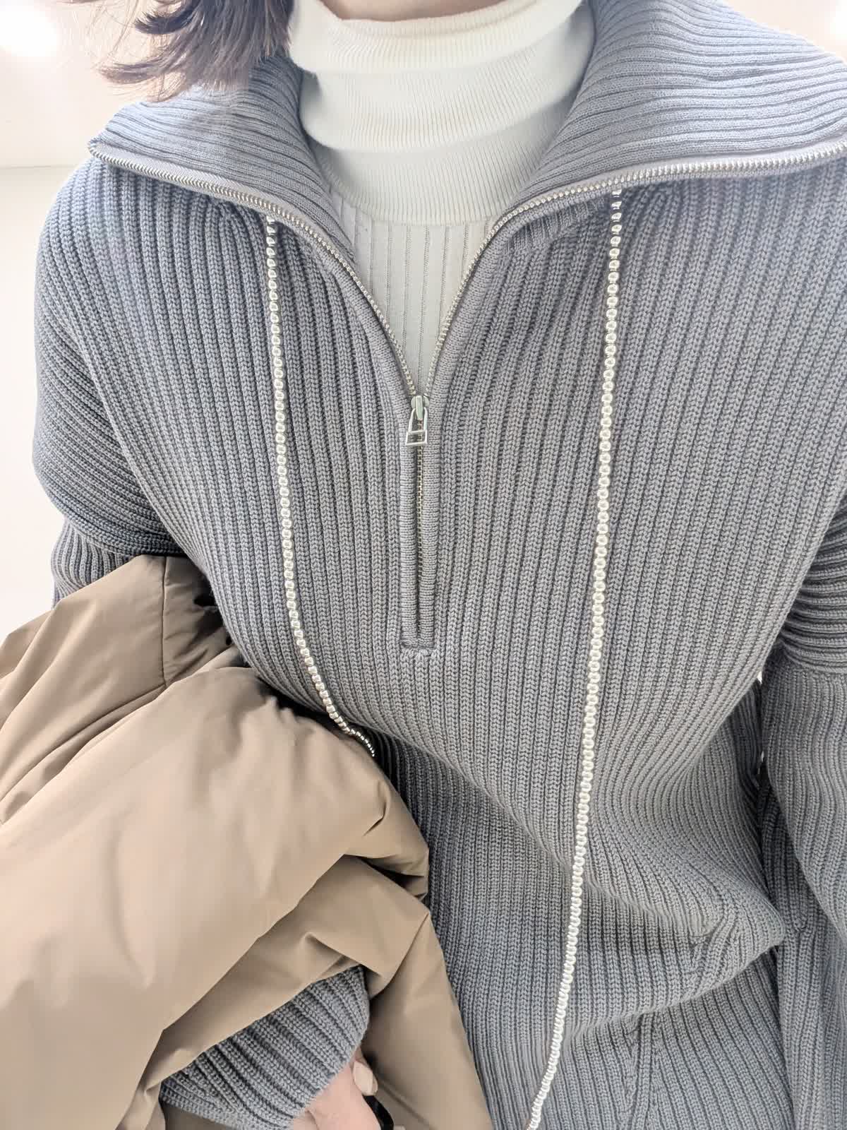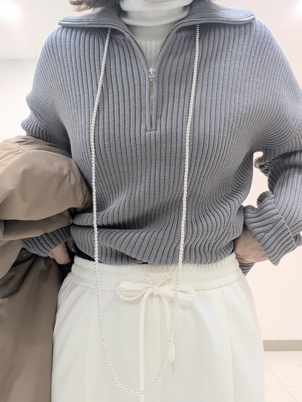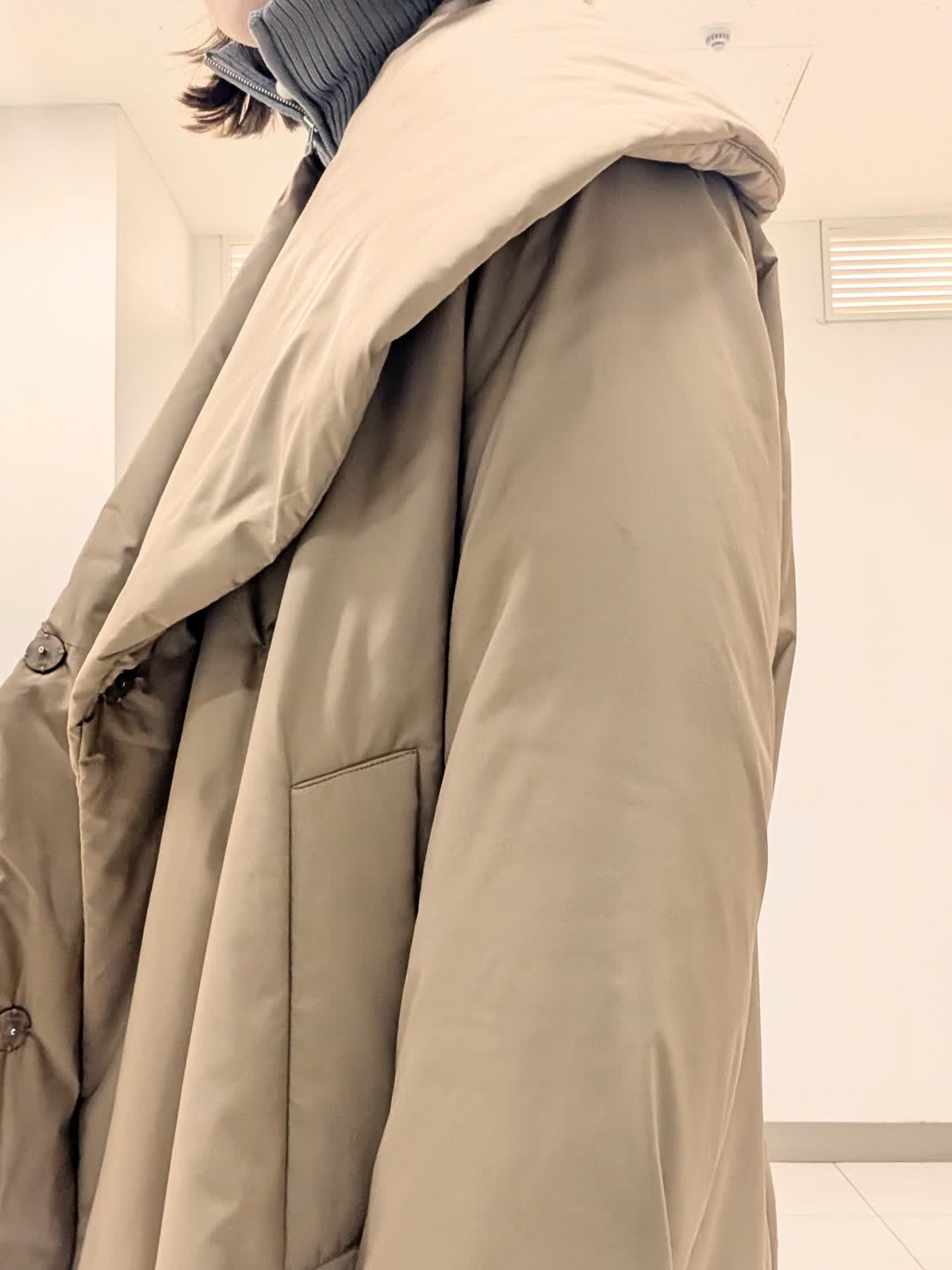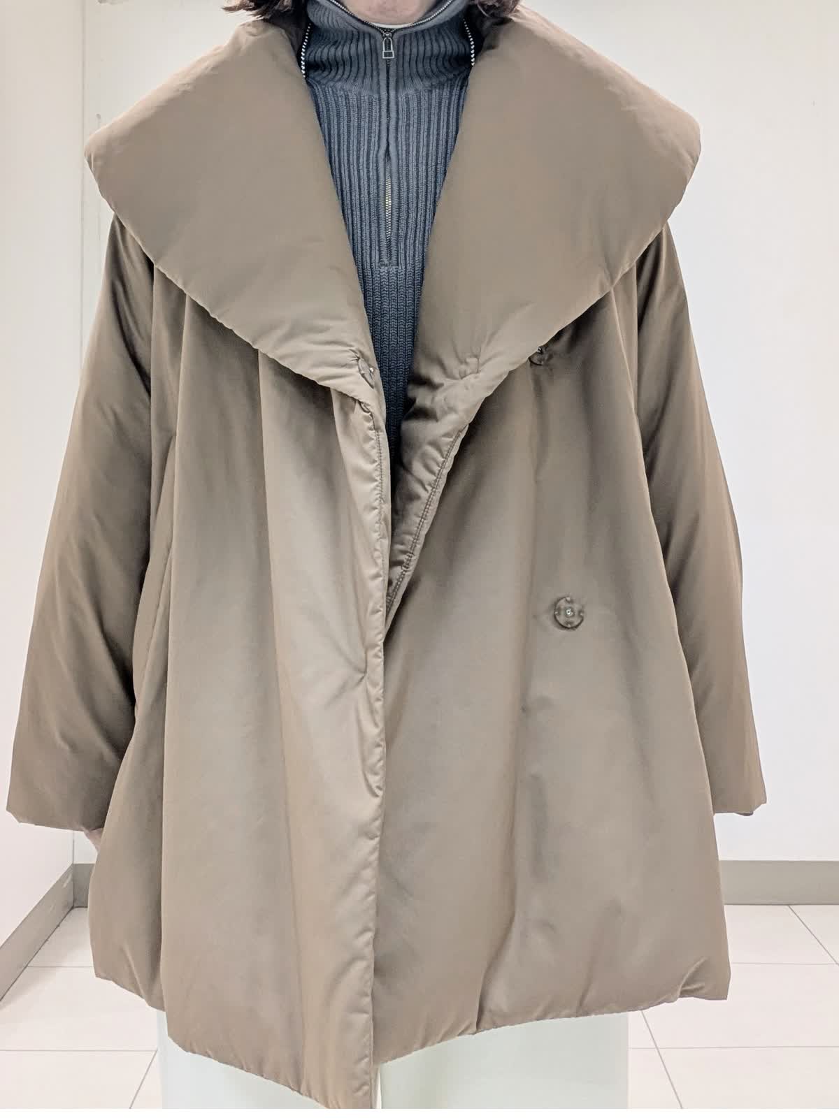 【着用サイズ9号】 アウターは、大きめなショールカラーが印象的な中綿コート。袖や肩まわりがスッキリと見えるようにパターンや中綿の分量感にこだわりました。撥水機能も備えたおすすめのアウターです◎ インナーはジップリブニットとタートルのレイヤード。 ジップのデザインですがカジュアルすぎずパンツでもスカートでも合わせられます。 合わせたボトムスは、ノンストレスな着心地が魅力のイージーパンツ。リラックス感があり脚を長くみせてくれるシルエットです。