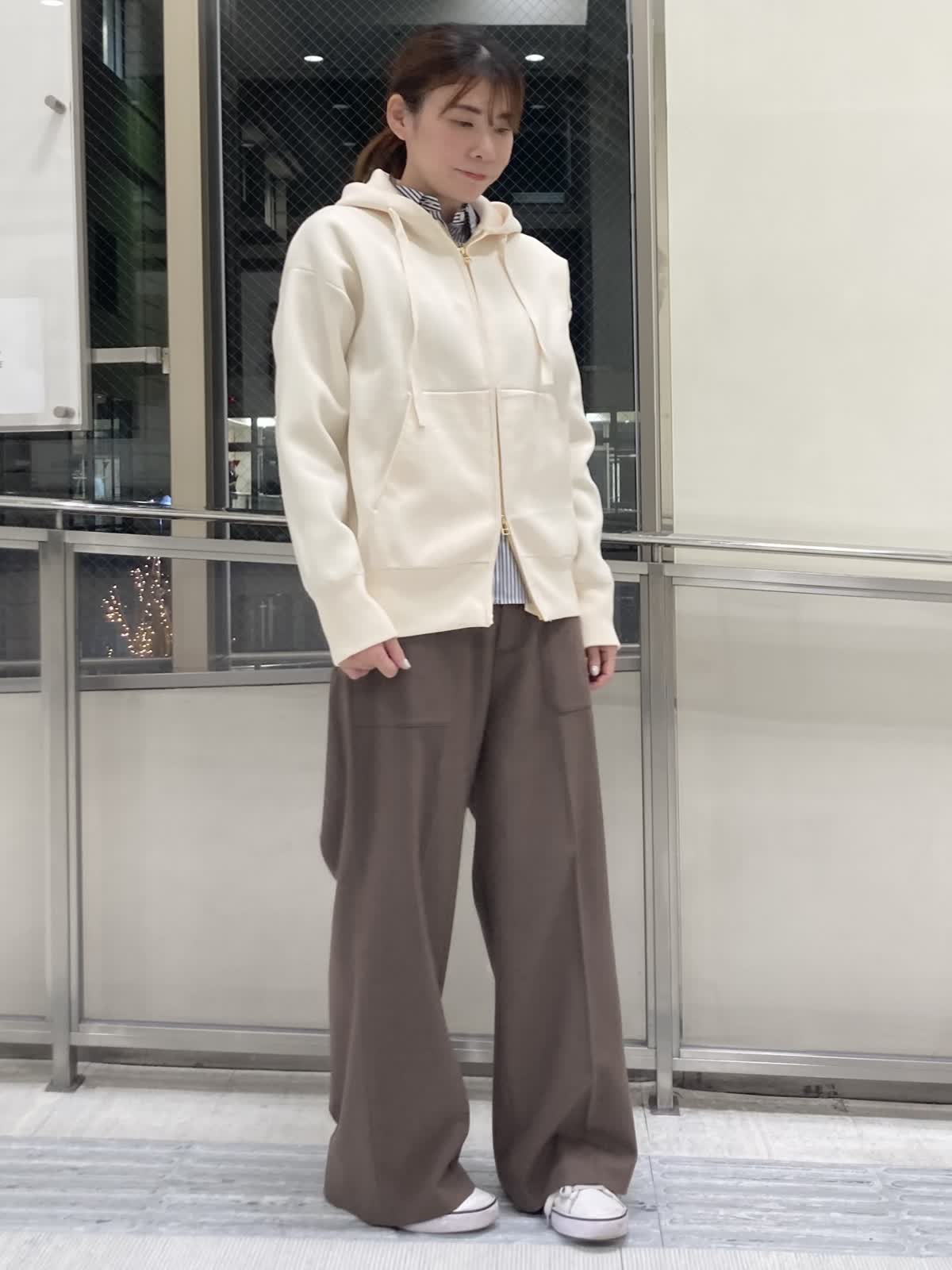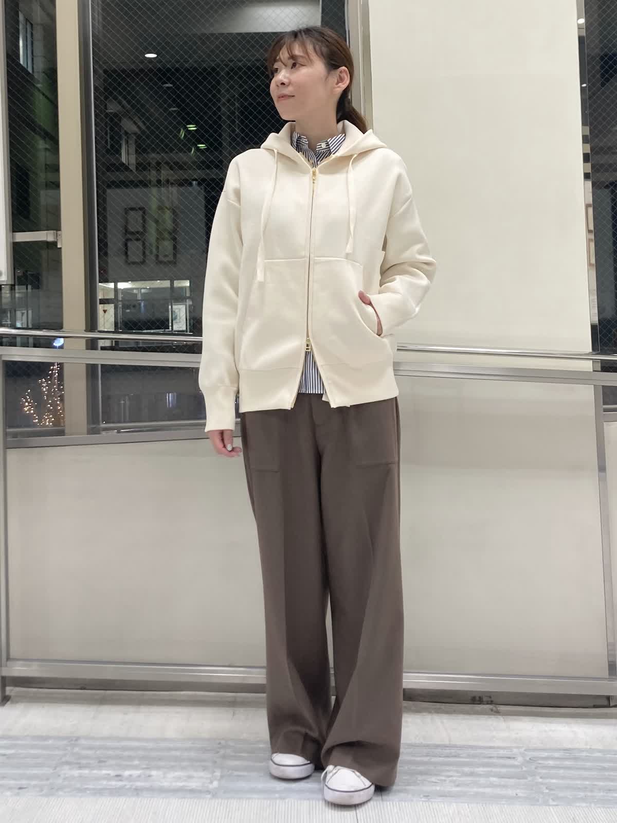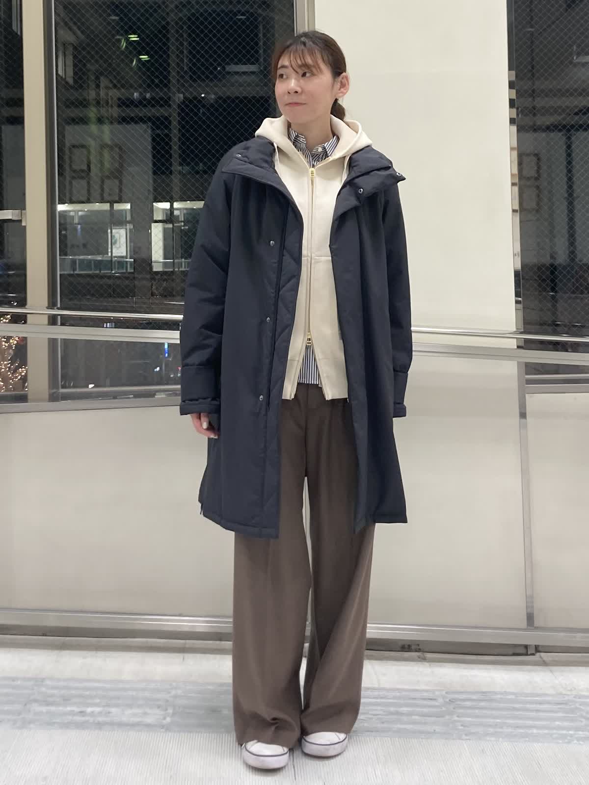 【着用サイズ】シャツ : 9号 フーディー : フリー パンツ : 7号 コート : フリー 【着用カラー】シャツ : ストライプ フーディー : オフホワイト パンツ : ブラウン コート : ブラック ちょっとそこまでのお買い物コーデ。ストライプのシャツをチラッと見せるのがポイントです。フーディはダブルジップで下を開けて今風に。コートはブラックだけど、マットなので暗くなりすぎないのでオススメです。どれも普段使いしやすいアイテムです。