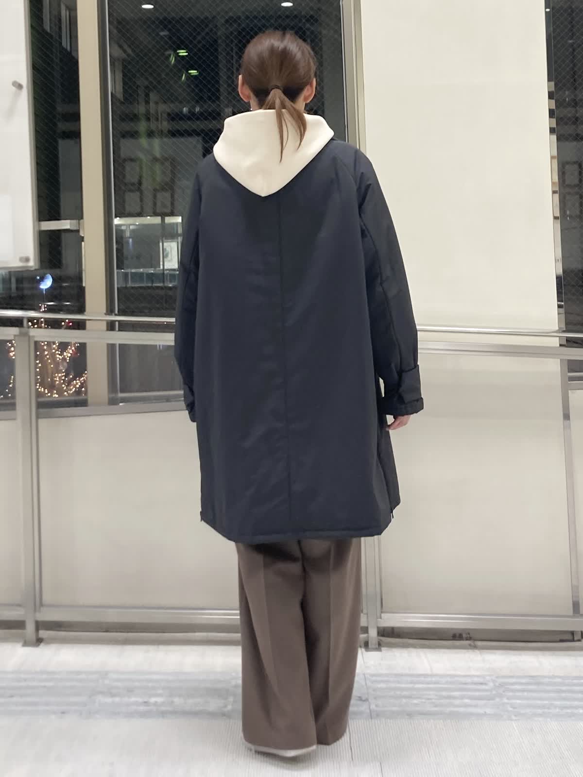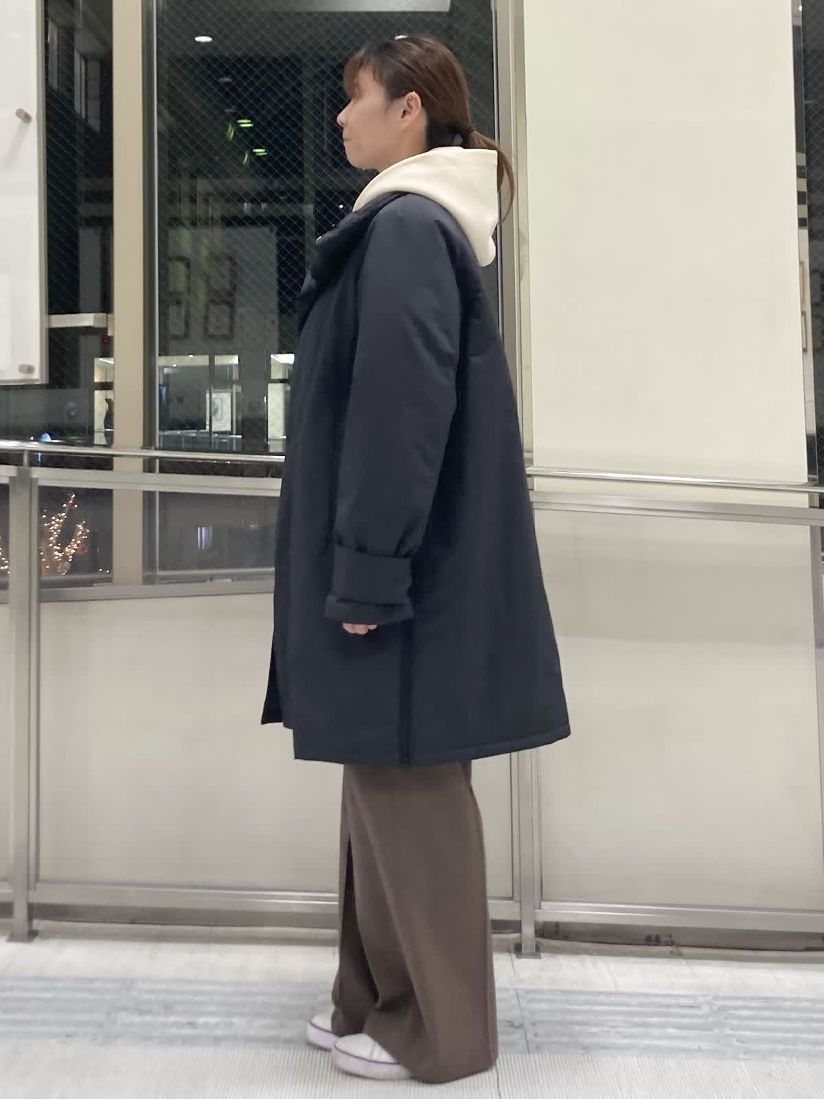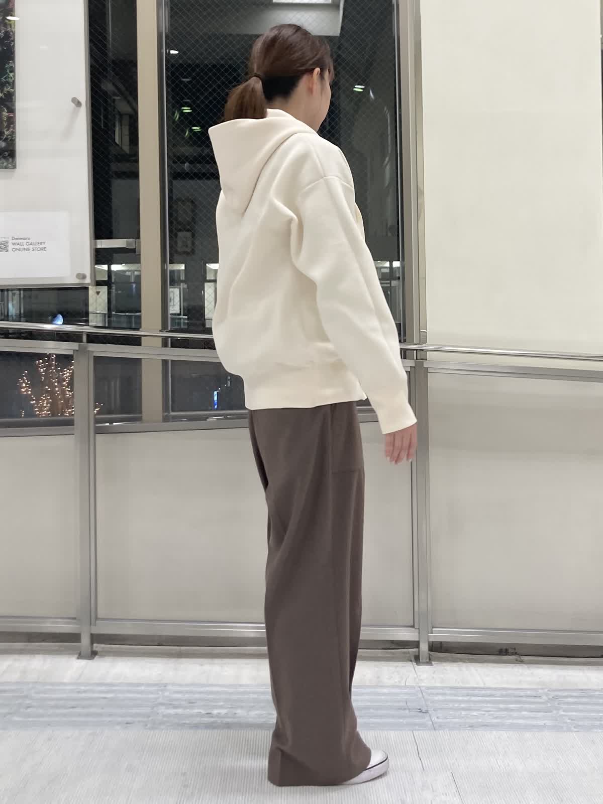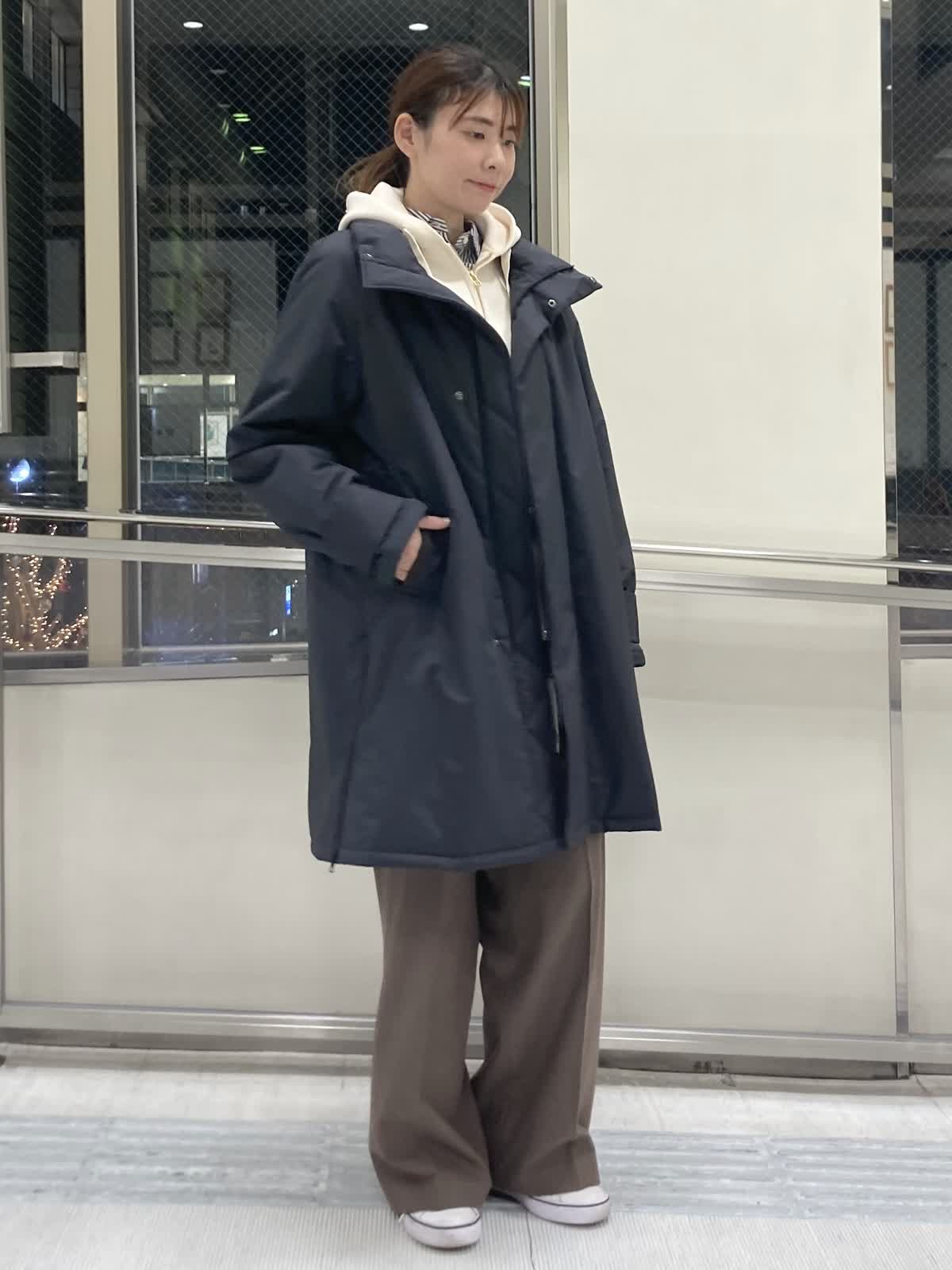 【着用サイズ】シャツ : 9号 フーディー : フリー パンツ : 7号 コート : フリー 【着用カラー】シャツ : ストライプ フーディー : オフホワイト パンツ : ブラウン コート : ブラック ちょっとそこまでのお買い物コーデ。ストライプのシャツをチラッと見せるのがポイントです。フーディはダブルジップで下を開けて今風に。コートはブラックだけど、マットなので暗くなりすぎないのでオススメです。どれも普段使いしやすいアイテムです。