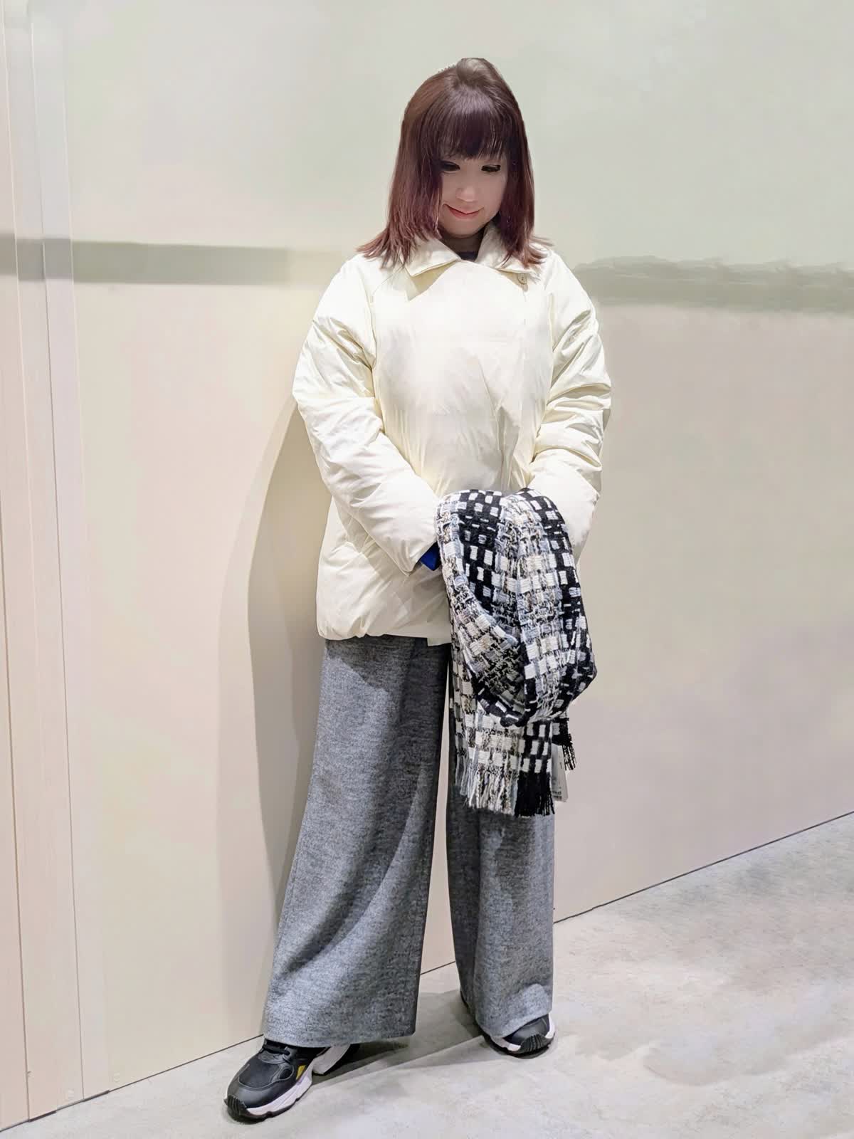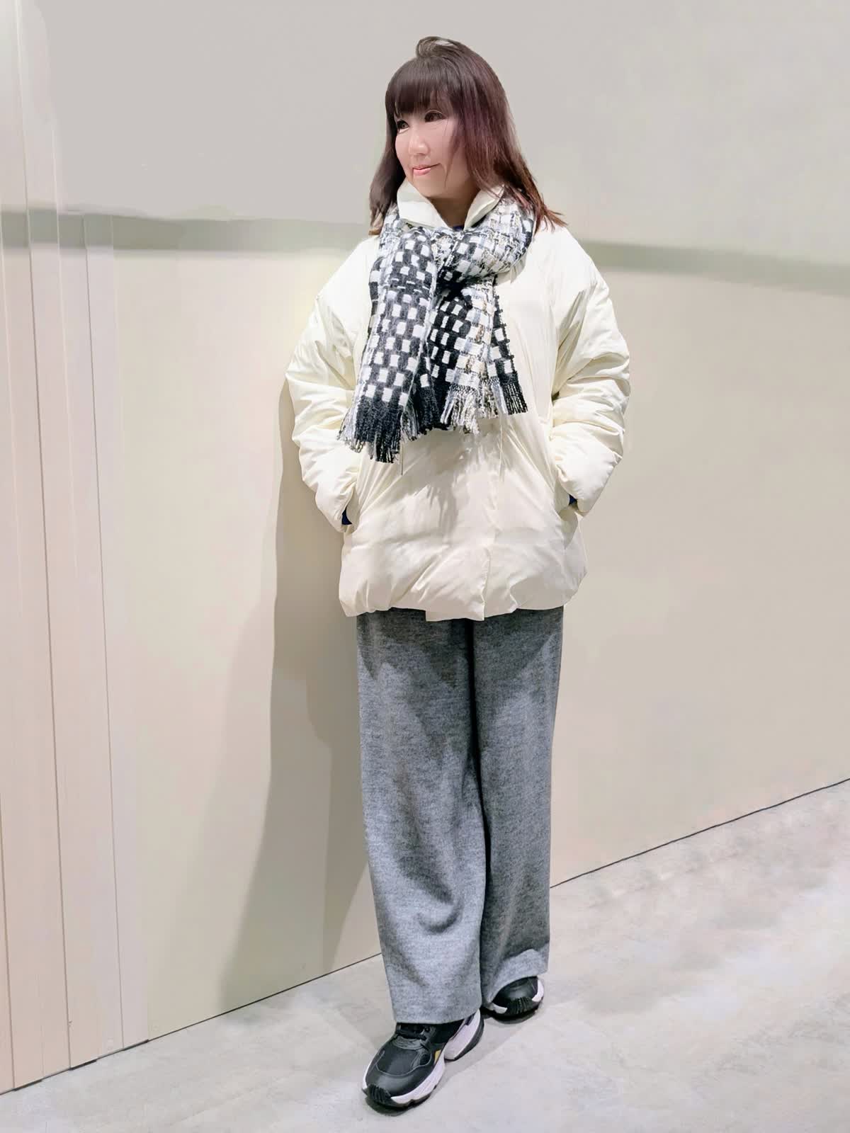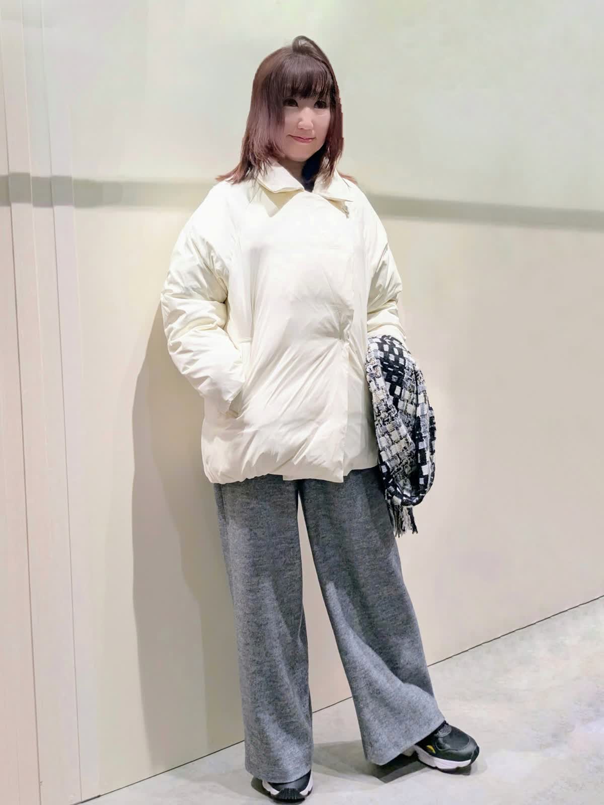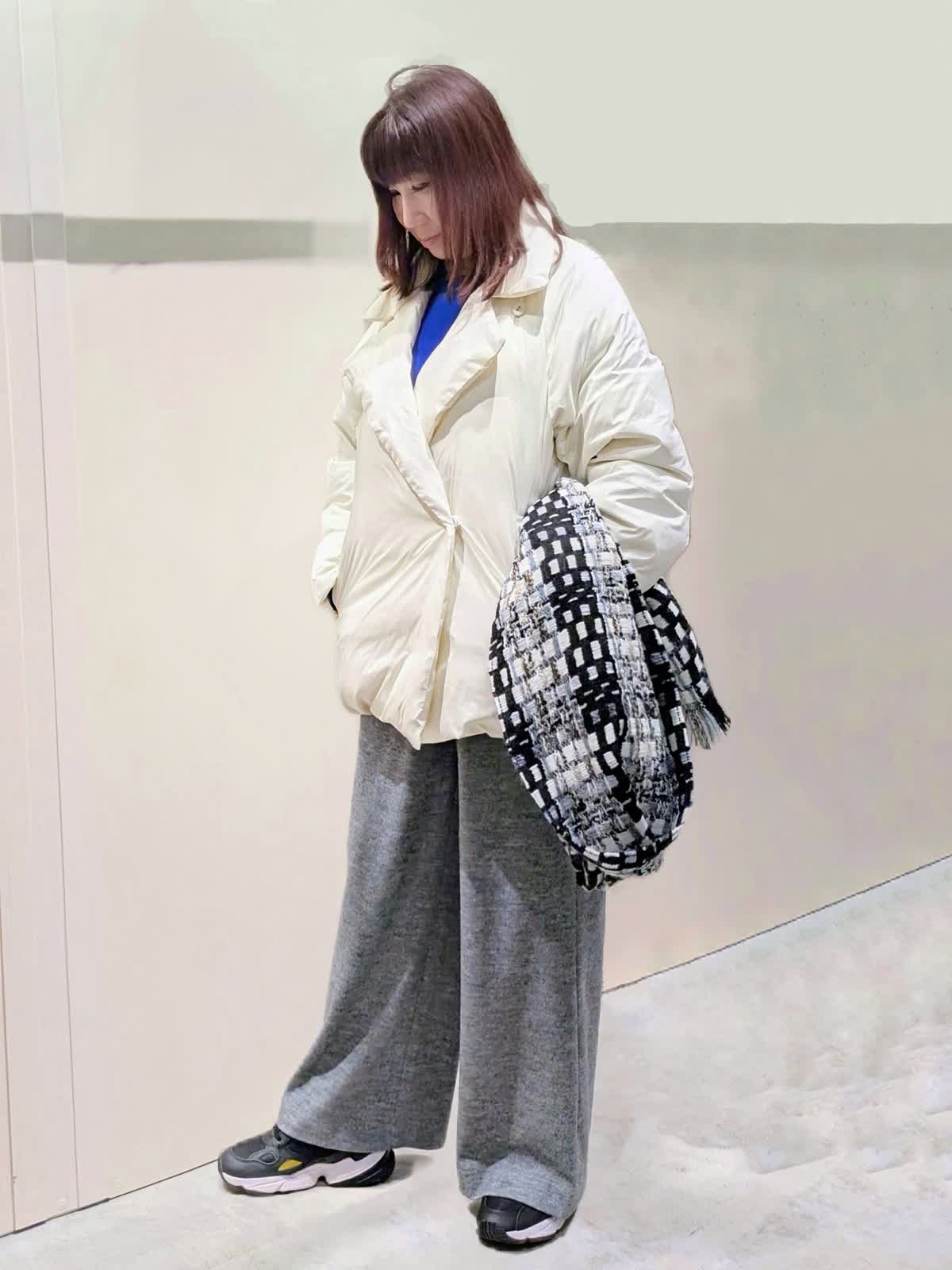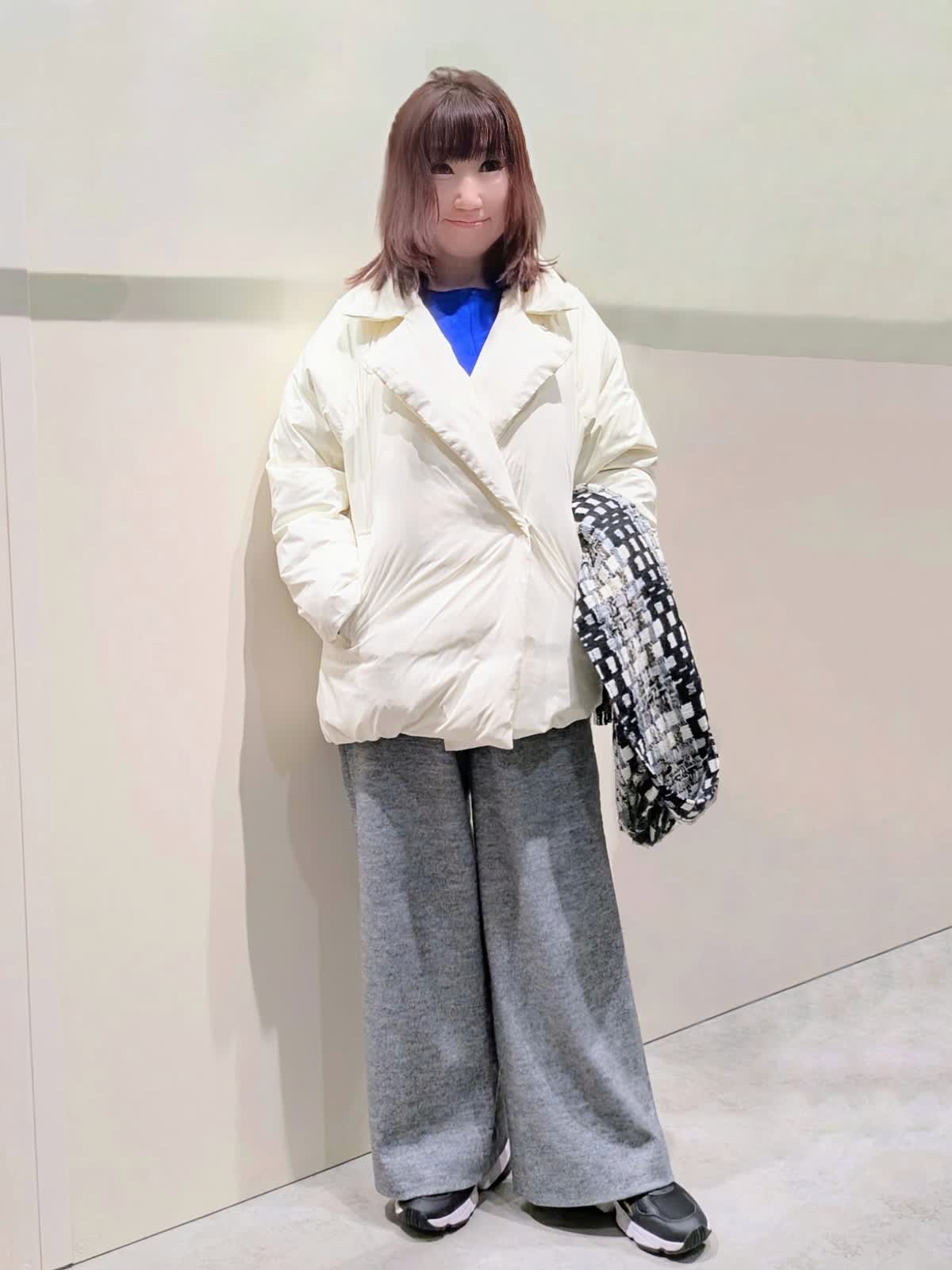 【着用サイズ】ダウンコート、パンツ:9号 プルオーバー:フリーサイズ【着用カラー】ダウンコート:オフホワイト プルオーバー:ブルー パンツ:グレー 冬のカジュアルコーディネート 軽くて、保温性・撥水防水効果もある暖かダウンコートは、上品なマット生地でピーコート風のデザインがポイントです。襟はフロントを開けてテーラード風と釦を留めてステンカラーにもなり、コーディネートの巾も広がりさらに温かく着て頂けます。ヒップの隠れる着丈でボトムを選びません。鮮やかなブルーのプルオーバーは、緩すぎない程良いサイズ感ながら身体のラインを拾わず、スッキリ見せてくれます。コートインナーの差し色にもなる綺麗なお色目です。暖かみにある圧縮ジャージのワイドパンツは、ウエスト総ゴムドロスト仕様でストレスフリーなはき心地です。広がり過ぎないワイドシルエットで幅広い場面で活用出来るアイテムです。