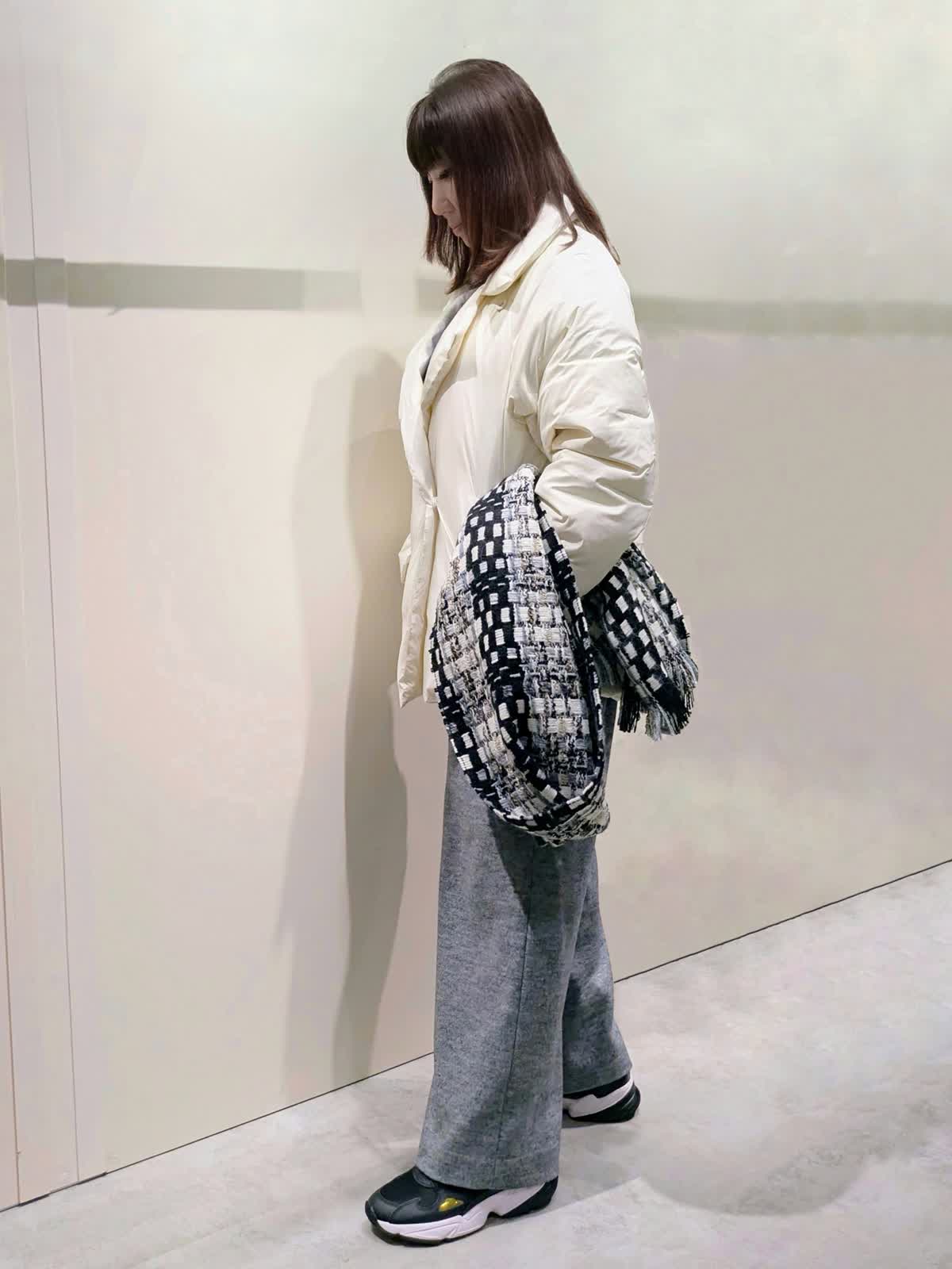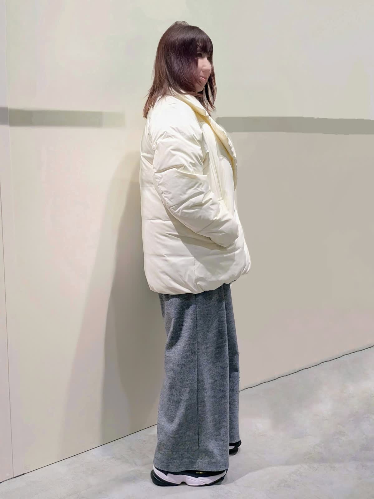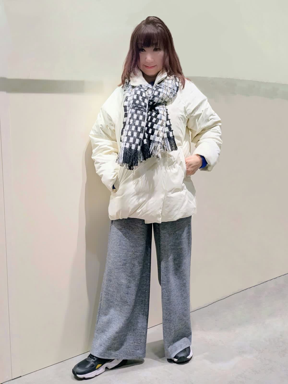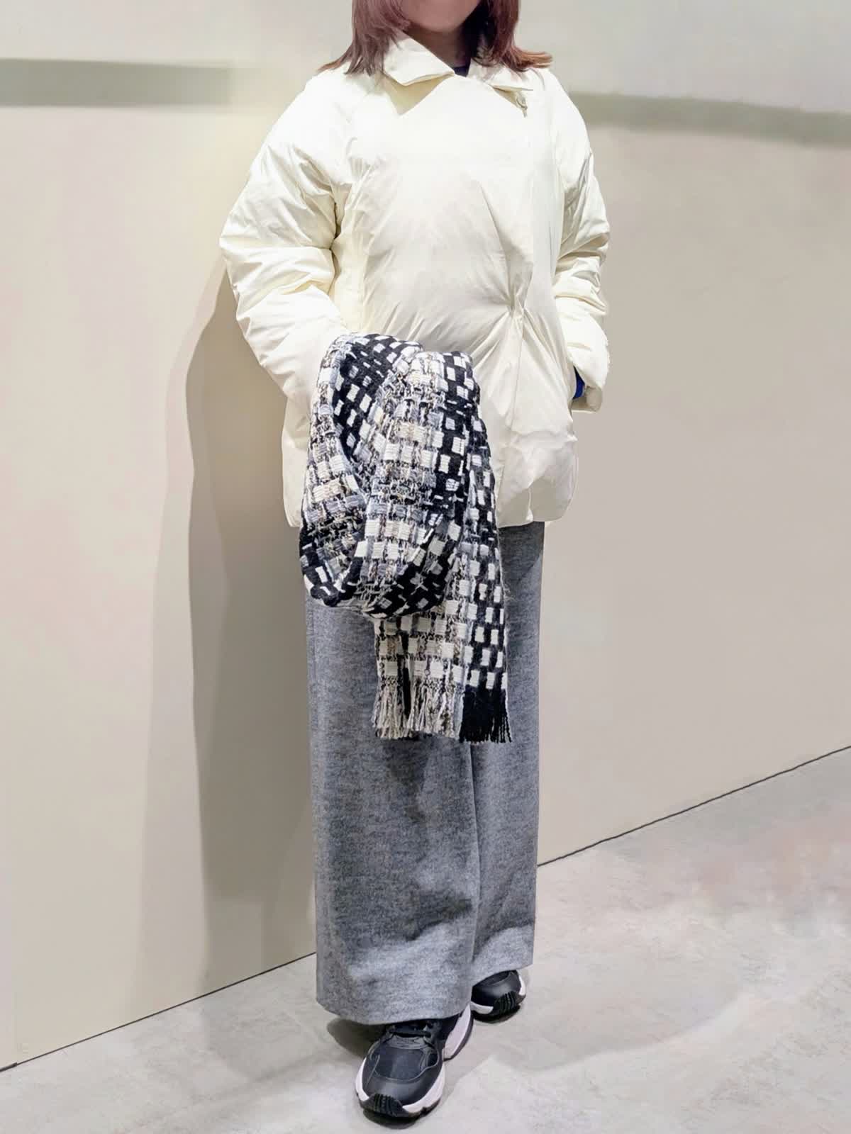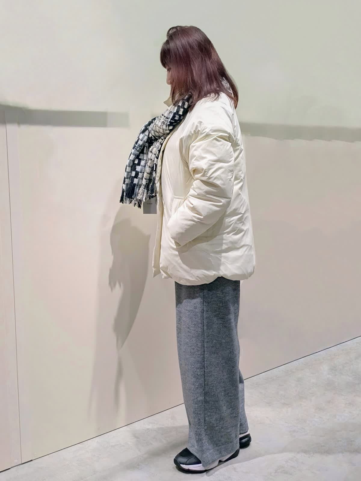 【着用サイズ】ダウンコート、パンツ:9号 プルオーバー:フリーサイズ【着用カラー】ダウンコート:オフホワイト プルオーバー:ブルー パンツ:グレー 冬のカジュアルコーディネート 軽くて、保温性・撥水防水効果もある暖かダウンコートは、上品なマット生地でピーコート風のデザインがポイントです。襟はフロントを開けてテーラード風と釦を留めてステンカラーにもなり、コーディネートの巾も広がりさらに温かく着て頂けます。ヒップの隠れる着丈でボトムを選びません。鮮やかなブルーのプルオーバーは、緩すぎない程良いサイズ感ながら身体のラインを拾わず、スッキリ見せてくれます。コートインナーの差し色にもなる綺麗なお色目です。暖かみにある圧縮ジャージのワイドパンツは、ウエスト総ゴムドロスト仕様でストレスフリーなはき心地です。広がり過ぎないワイドシルエットで幅広い場面で活用出来るアイテムです。