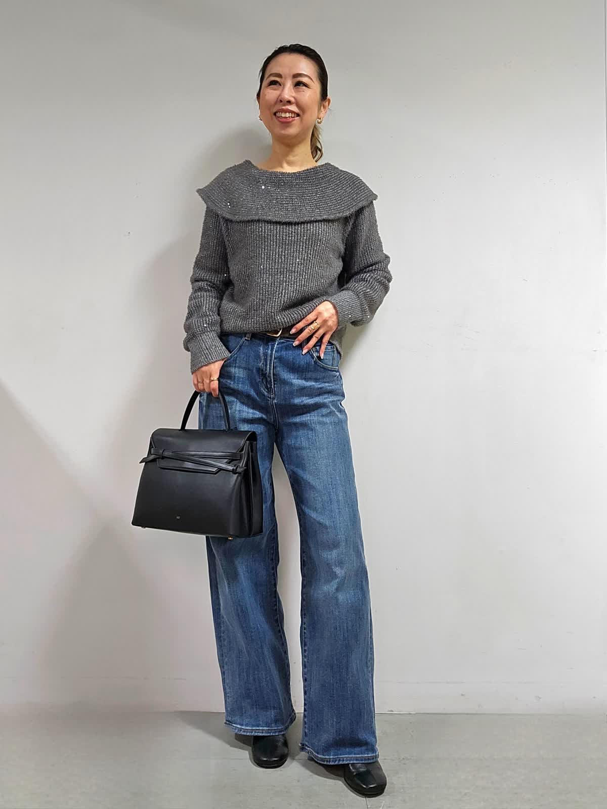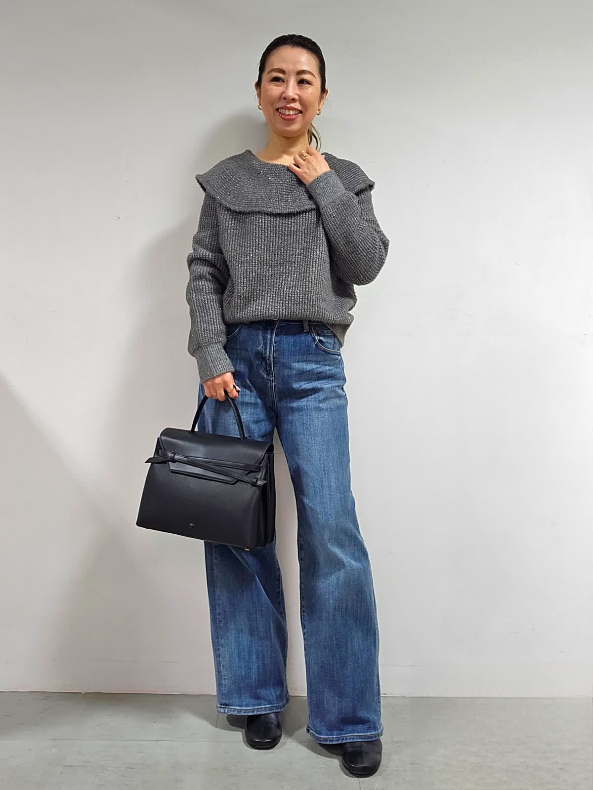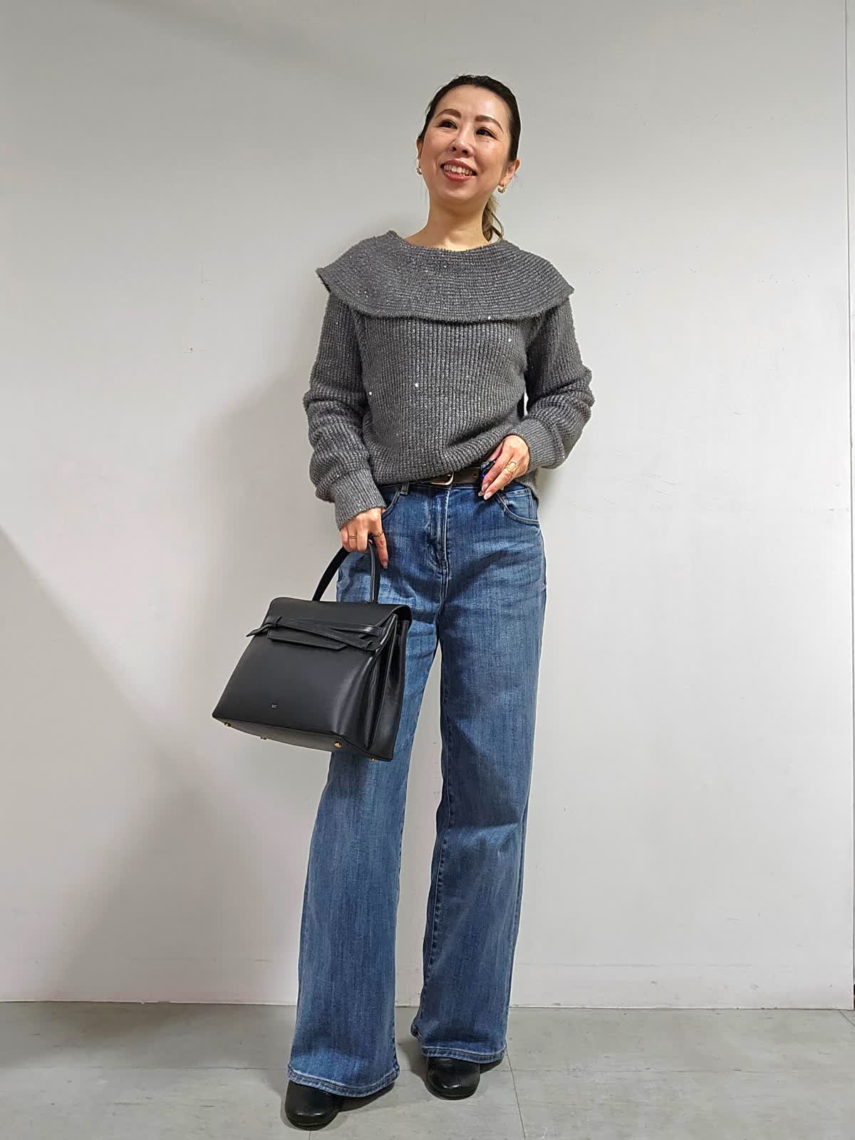 【着用カラー・サイズ】ニット:グレー・9号 パンツ:インディゴ・7号 バッグ:ブラック ふんわりした起毛感と上品なスパンコール使いが、やさしい雰囲気を後押しするオフショルダー風ニット☆ 程よく開いたネックラインが、首筋やデコルテをきれいに見せてくれて、色っぽく華奢な印象を与えてくれます。