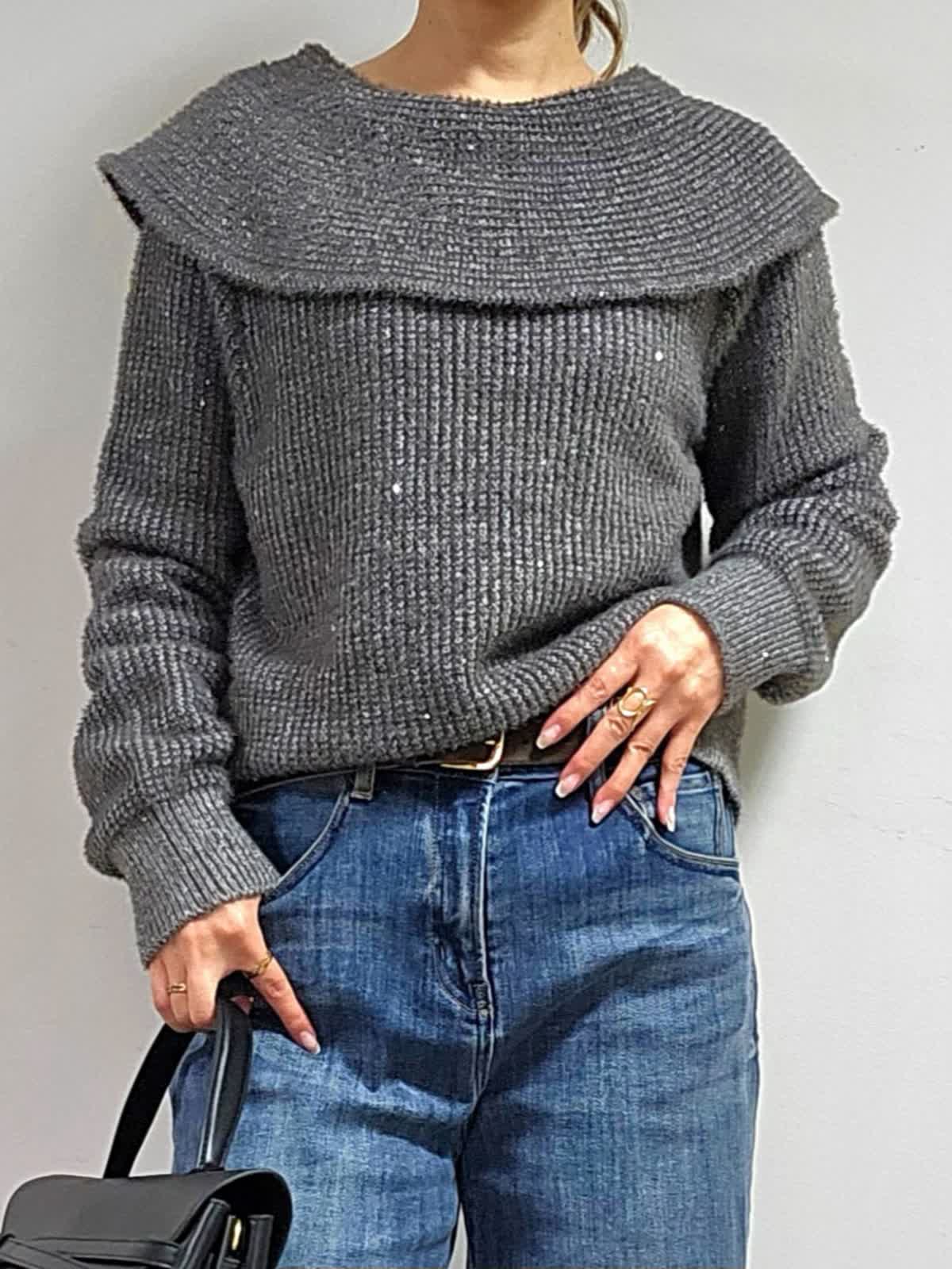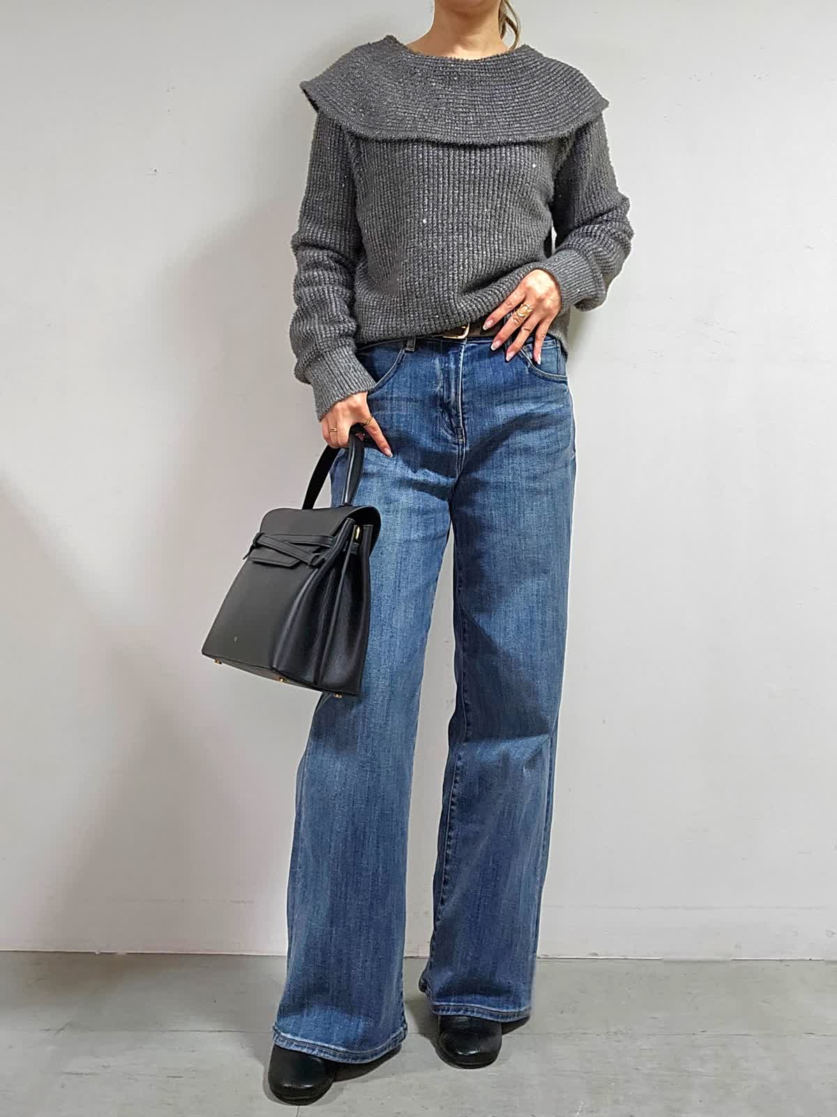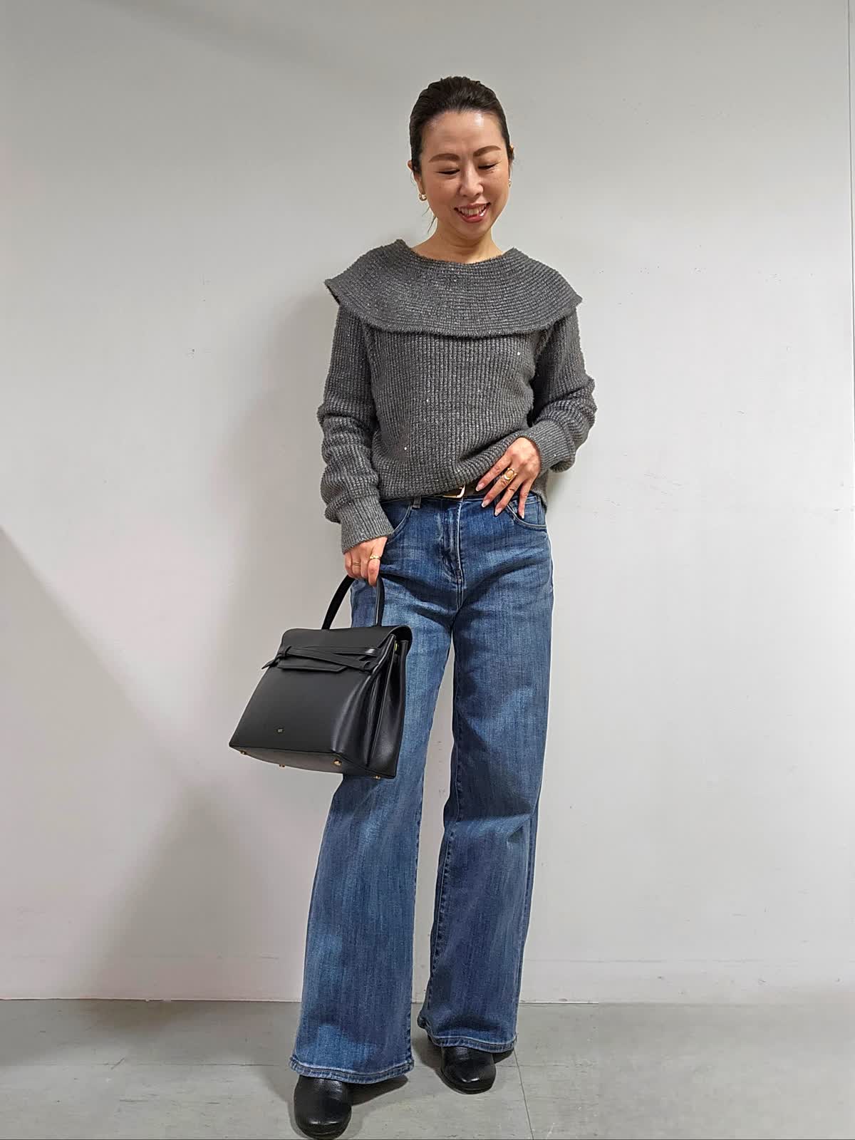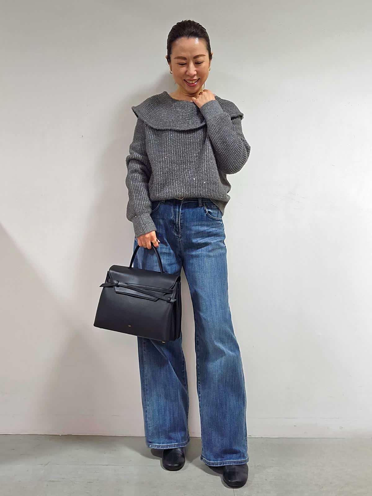 【着用カラー・サイズ】ニット:グレー・9号 パンツ:インディゴ・7号 バッグ:ブラック ふんわりした起毛感と上品なスパンコール使いが、やさしい雰囲気を後押しするオフショルダー風ニット☆ 程よく開いたネックラインが、首筋やデコルテをきれいに見せてくれて、色っぽく華奢な印象を与えてくれます。
