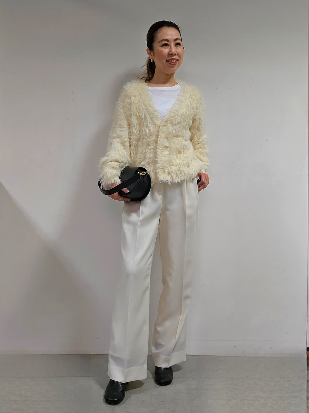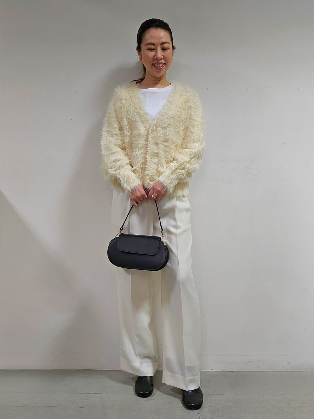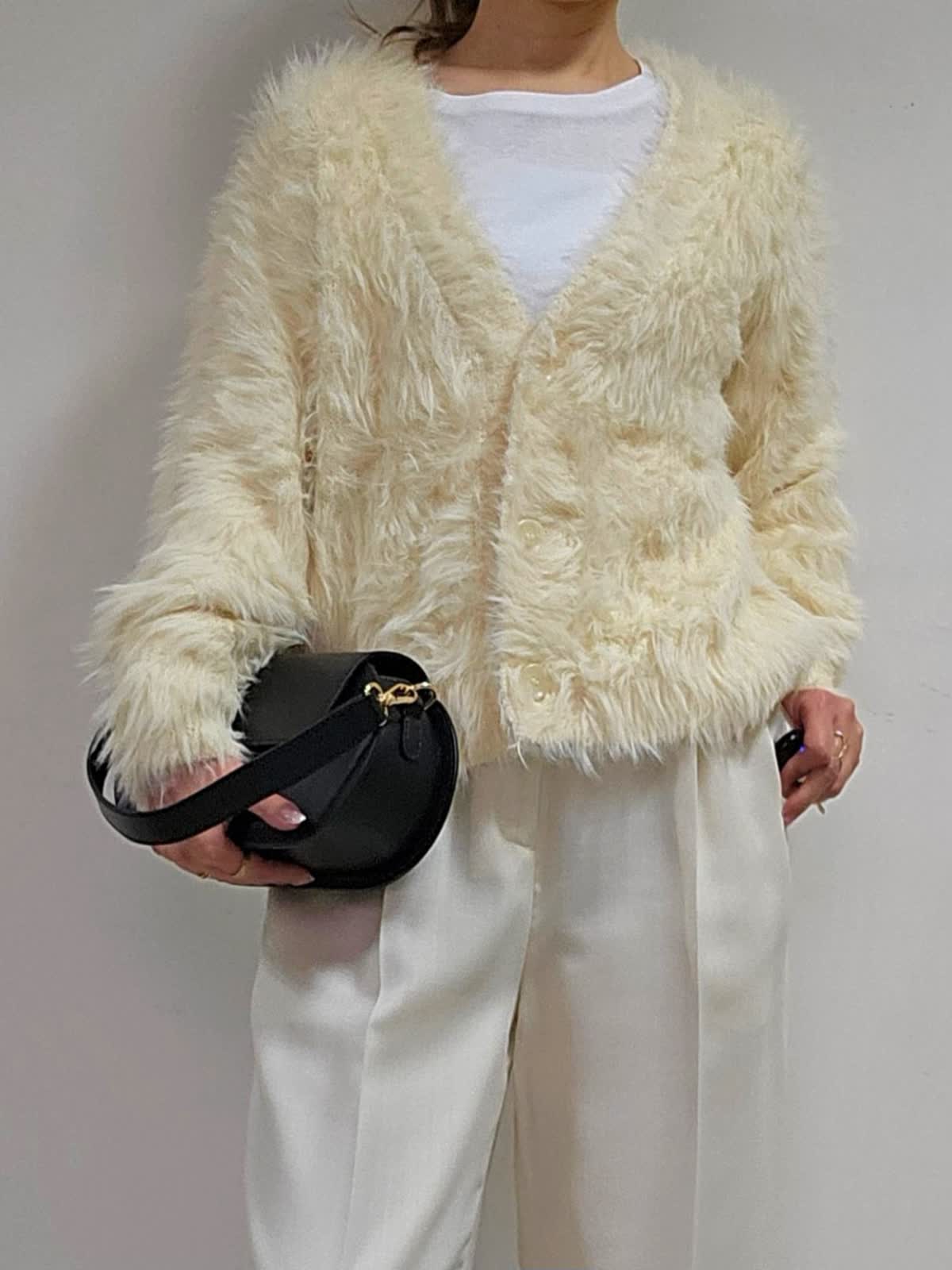 【着用カラー・サイズ】 カーディガン:アイボリー・9号 カットソー:ホワイト・9号 パンツ:オフホワイト・5号 バッグ:ブラック 存在感あるファーニットカーディガン☆肌触りは格別。柔らかさにプラスして軽くて暖かい着心地なので、寒い冬には機能性としても嬉しいポイント! 大人可愛いが叶うニットです☆