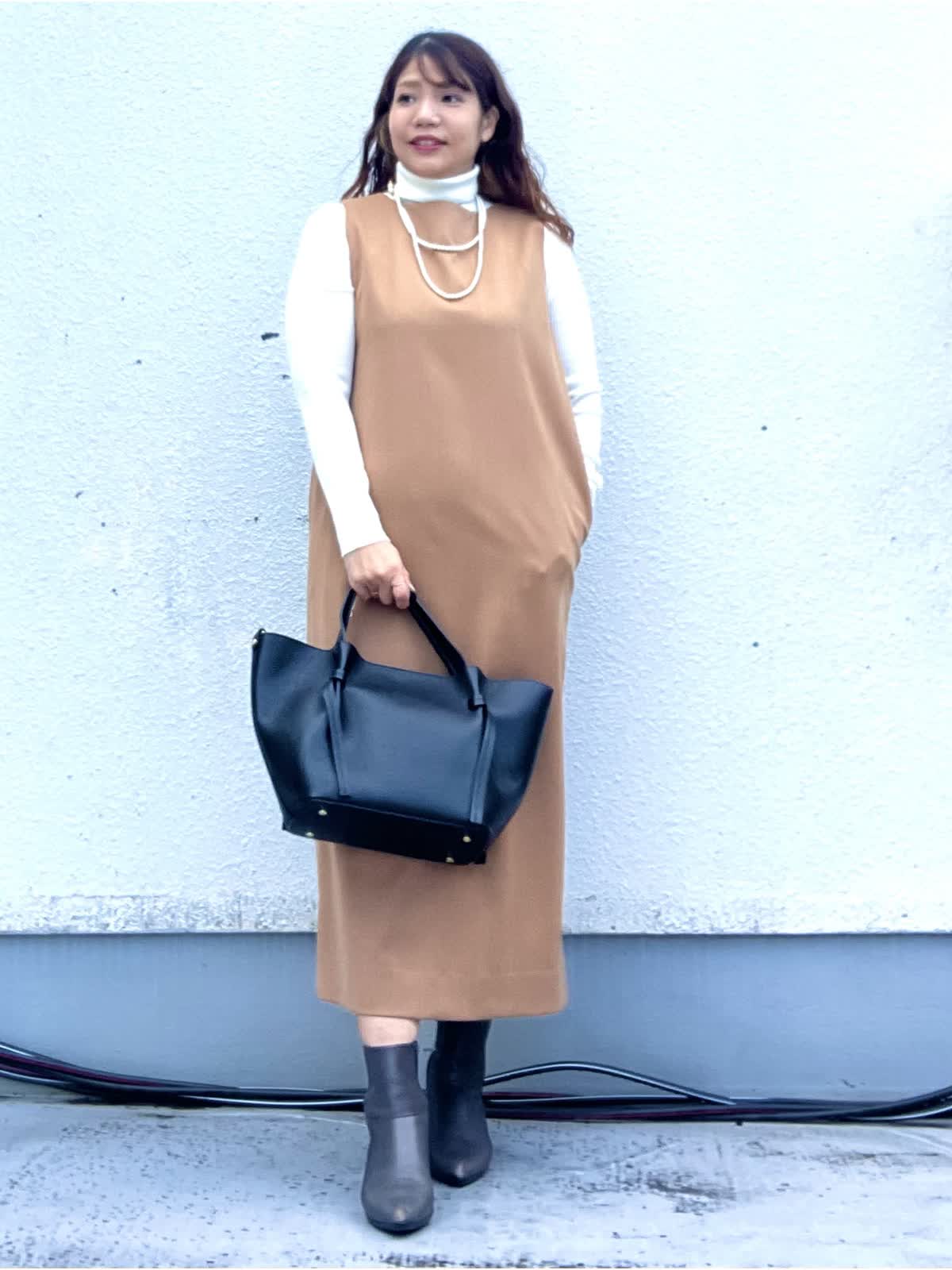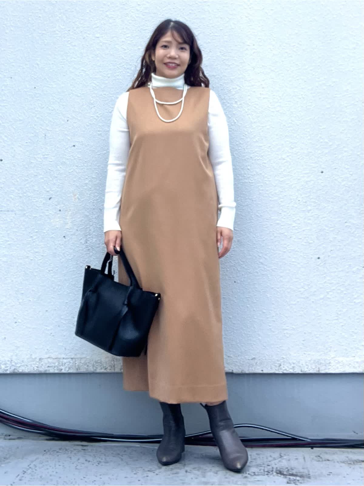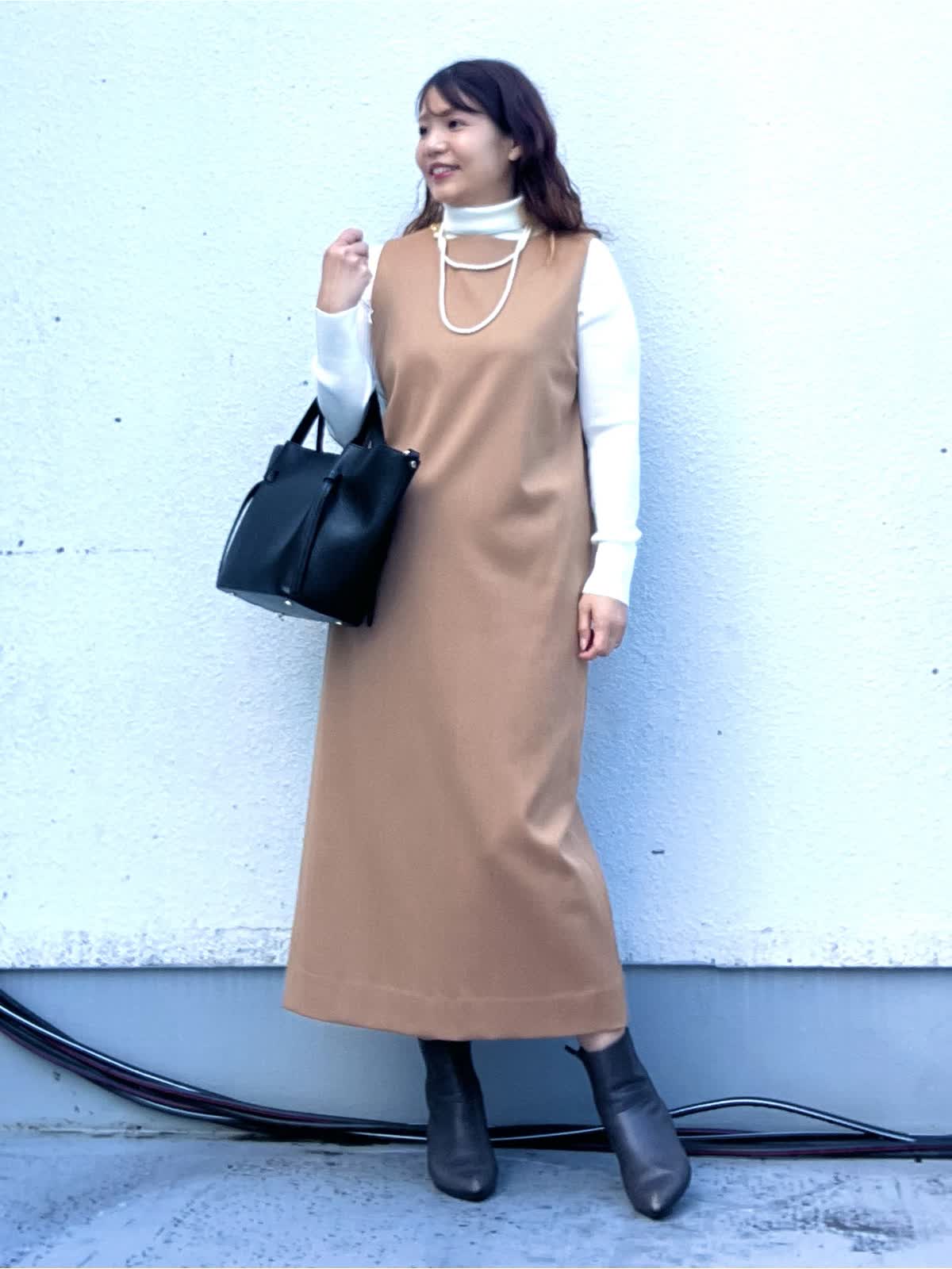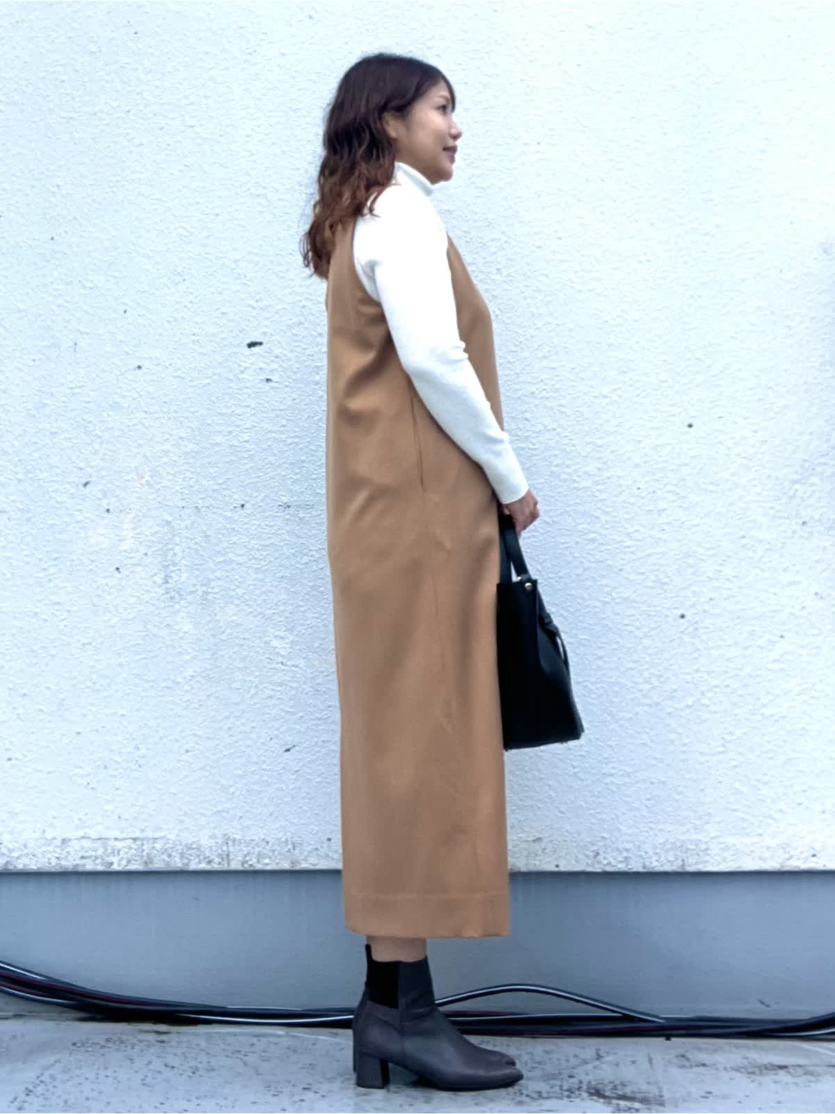 【着用アイテム:カラー/サイズ】 ワンピース:キャメル/9号 ニット:オフホワイト/11号 上品なキャメルカラーのジャンパースカートに、白のハイネックニットをレイヤードしたきれいめカジュアルコーデ。 縦のラインを強調するIラインシルエットで、体のラインを拾いにくく、すっきりとした印象に仕上がります。 ジャンパースカートは程よくハリのある素材感で、カジュアルすぎずお仕事やお出かけにも◎ インナー次第でロングシーズン着回しができるのも嬉しいポイントです。