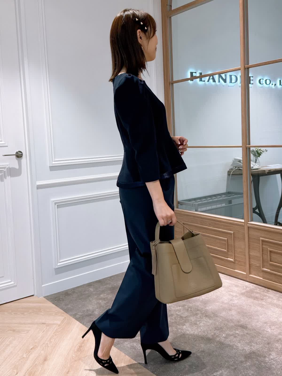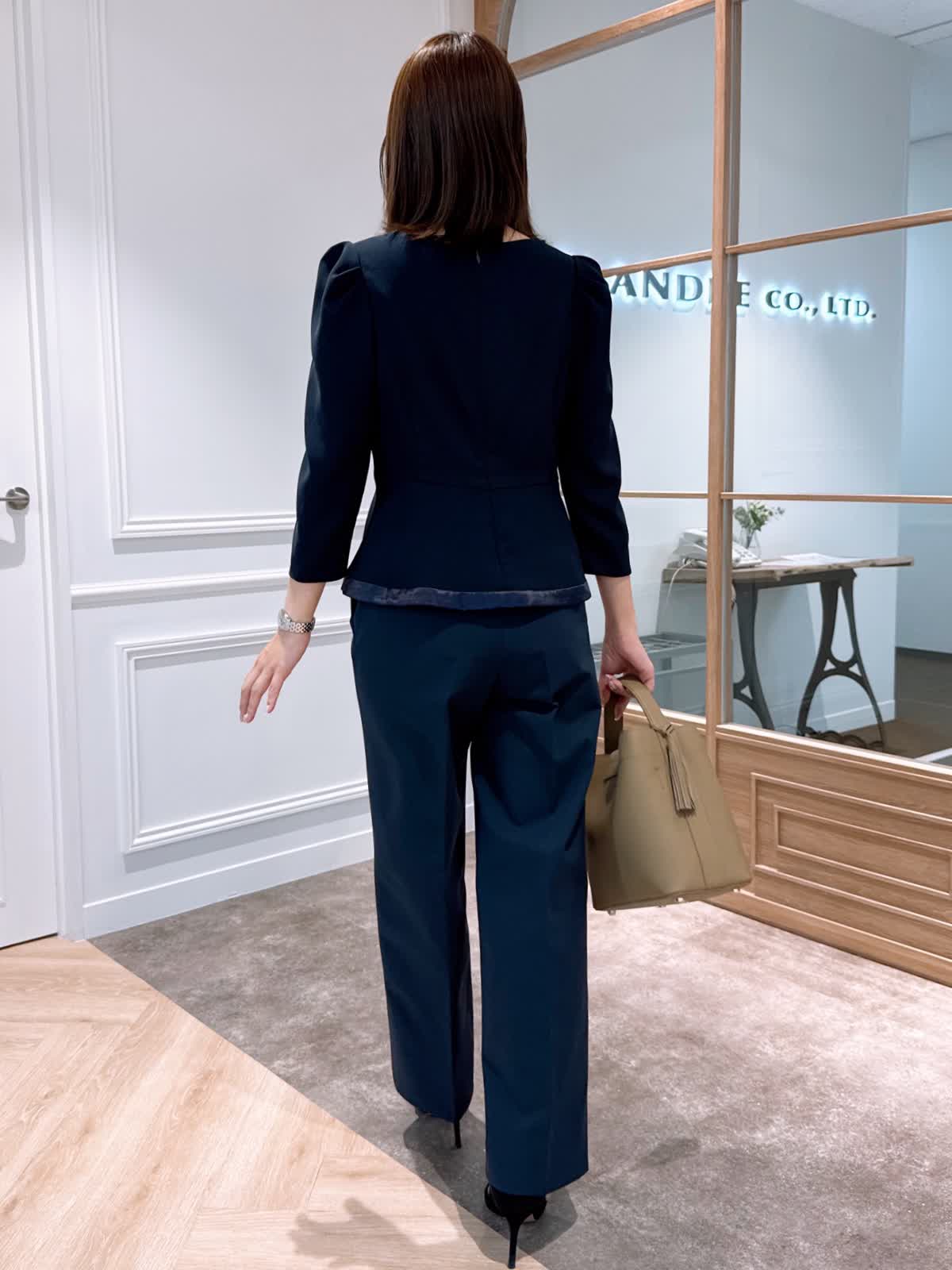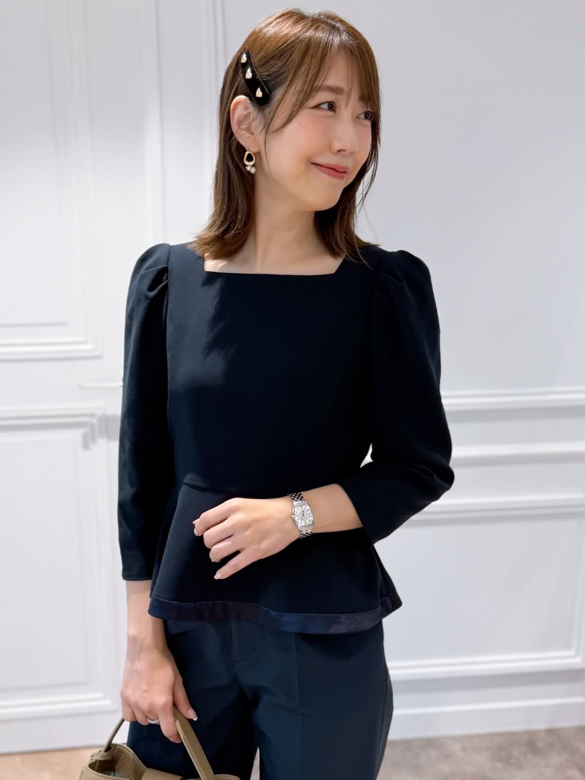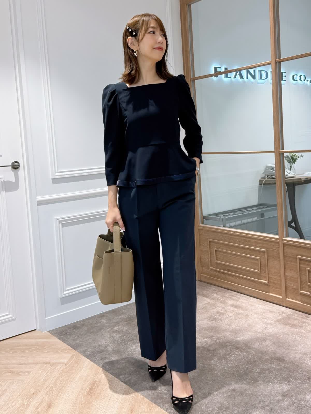 【着用サイズ】ブラウス:7号 パンツ:7号 吉田理紗さんコラボのブラウスとパンツ。ブラウスは程よい落ち感のある着やすい素材で一枚でもジャケットのインナーでも華やかになります。 上品なスクエアネックと肩に少し 入ったタック、裾のペプラムのサテン切替がポイント。パンツは太すぎないセミワイドでセンタープレスが足長効果。撥水加工のある素材でお仕事からセレモニーまで幅広く 使えます。