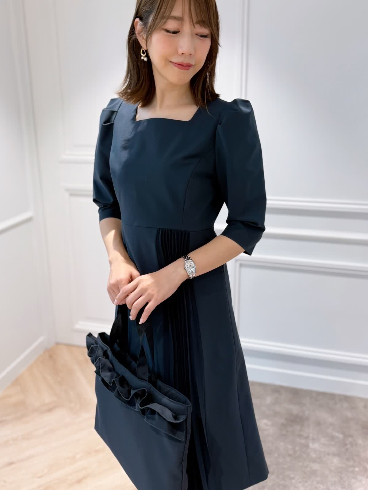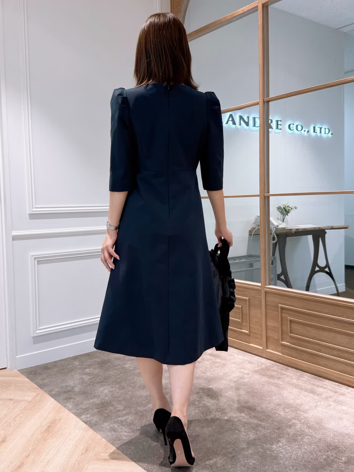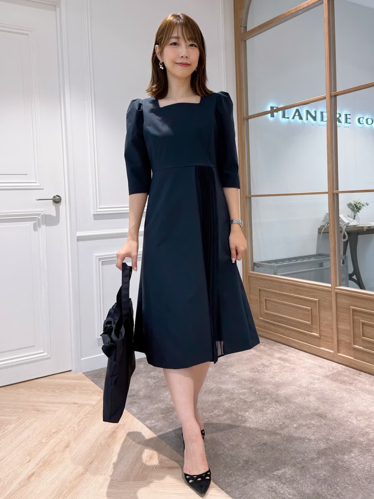 【着用サイズ】ワンピース:7号 吉田理紗さんコラボのワンピース。一枚で華やかな印象になるワンピースは、肩に入ったタックとスクエアネック、スカート部分に入ったシフォンのプリーツがポイント。歩くたびに揺れるプリーツが上品な印象になります。広がりすぎないフィット&フレアシルエットとストレッチと撥水加工、UV加工の生地で色んなシーンで着用いただけます。