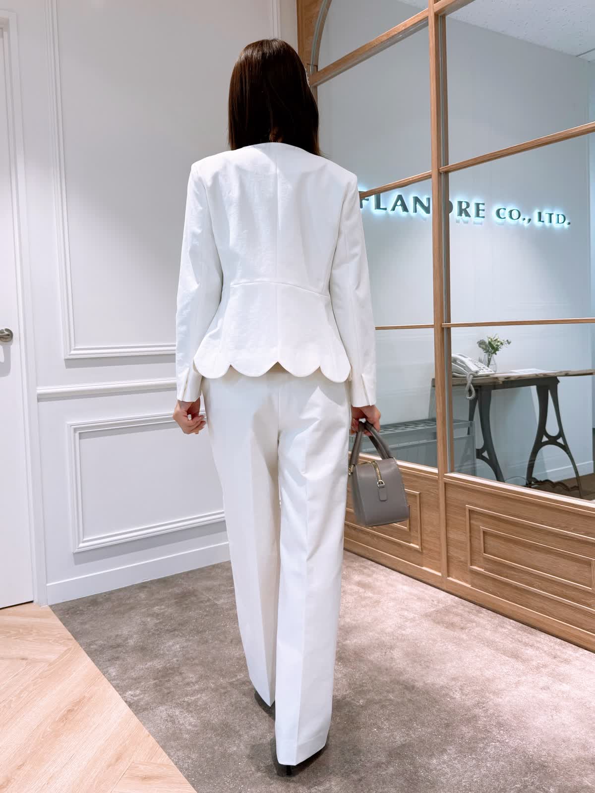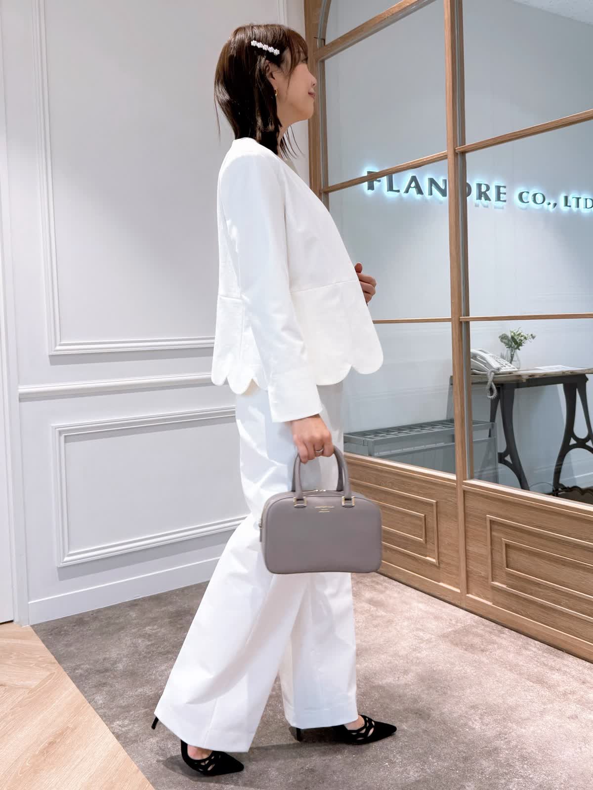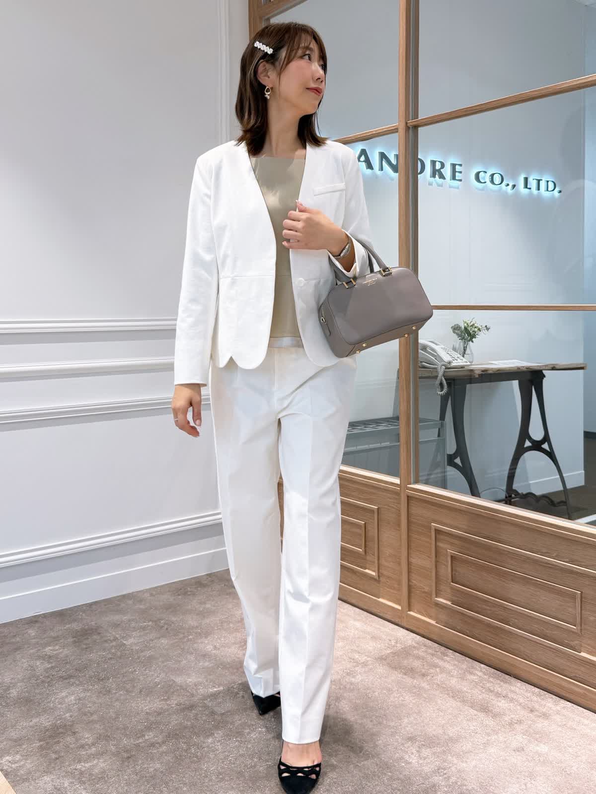 【着用サイズ】ジャケット:7号 ブラウス:7号 パンツ:7号 吉田理紗さんコラボのセットアップ。綺麗なオフシロカラーがとっても目を引くセットアップです。撥水加工とUVカットの素材でストレッチも効いているので華やかなシーンにぜひきたいただきたいお色です。 インナーに着ているブラウスの大人ベージュカラーとも相性抜群。