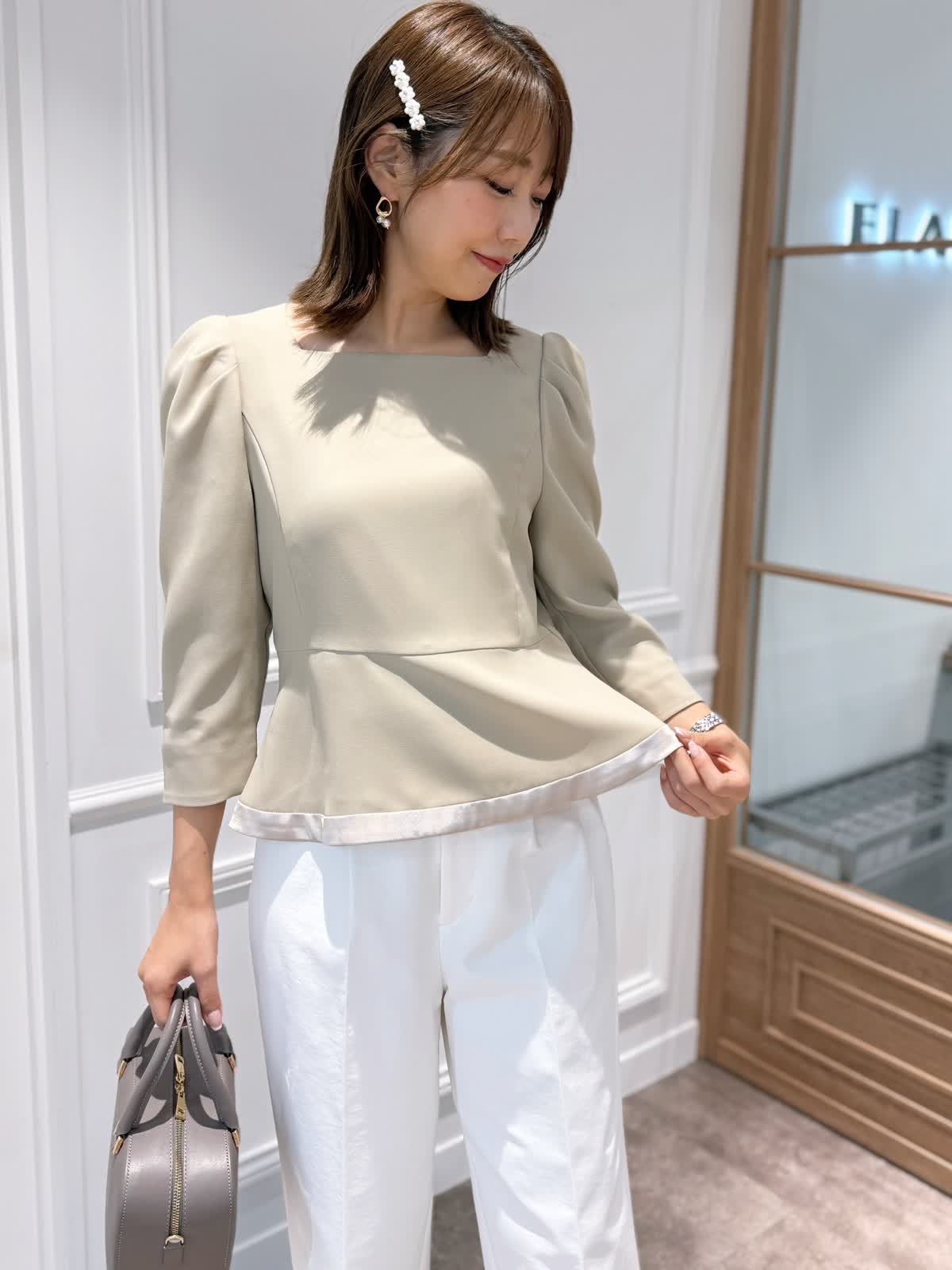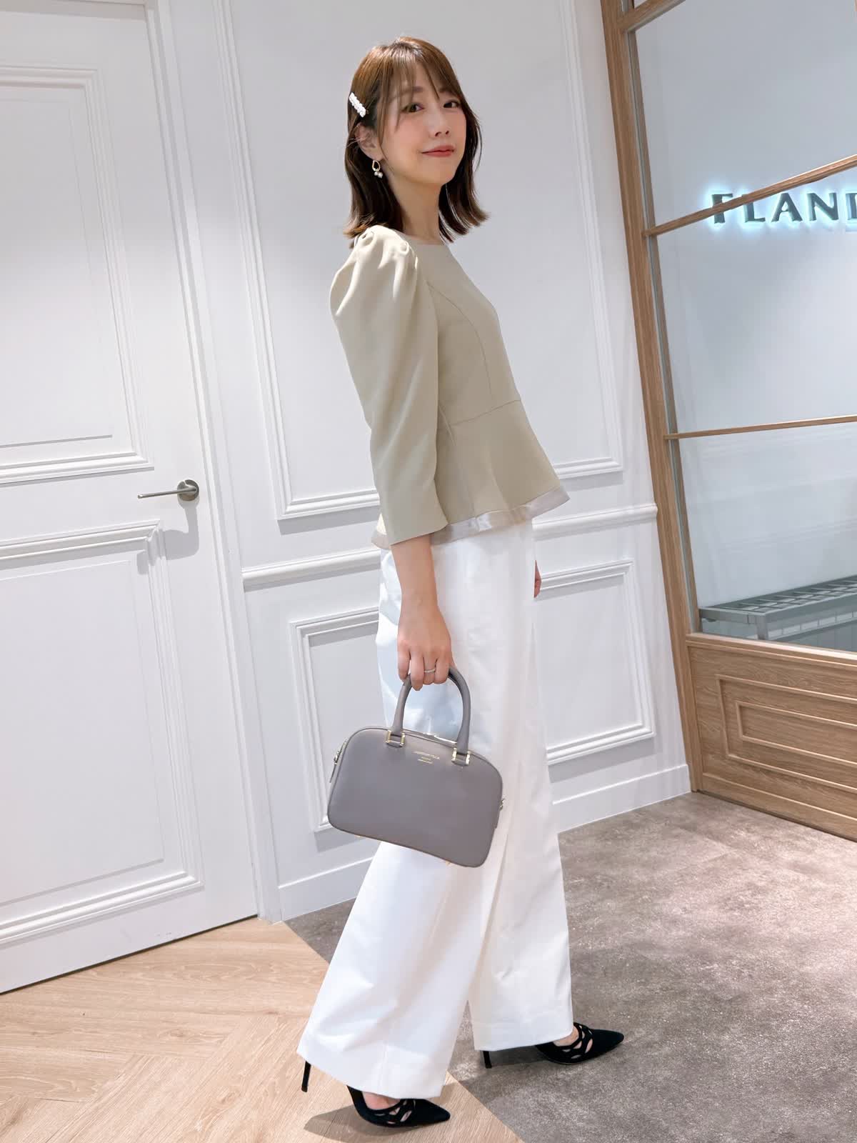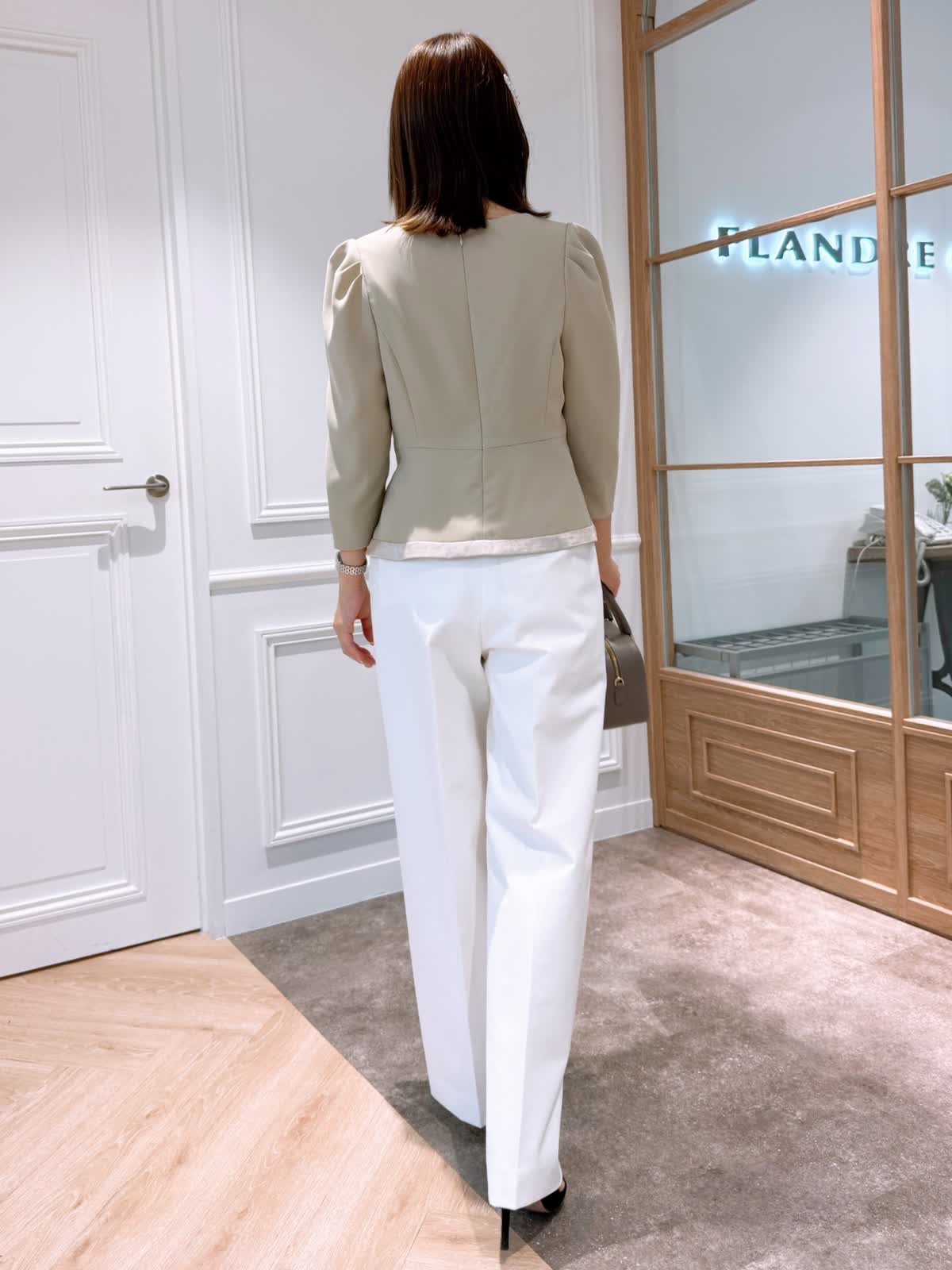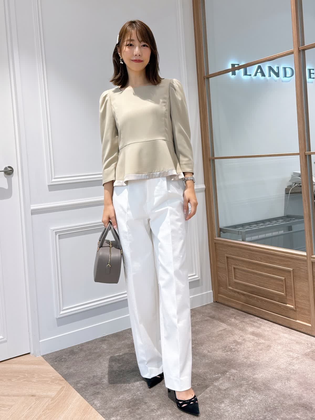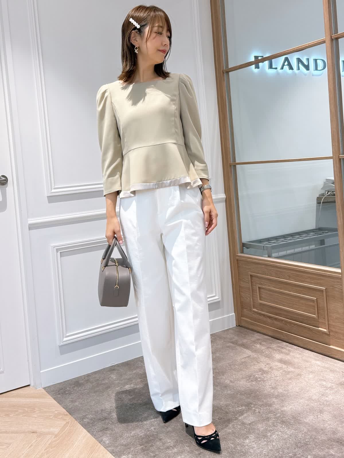 【着用サイズ】ブラウス:7号 パンツ:7号 吉田理紗さんコラボのブラウスとパンツ。ブラウスはハイウエストな切替のペプラムがポイントでよりスタイルアップで裾のサテン切替がアクセントに。動きやすく透けにくい素材で長い期間着用いただけます。 セミワイドパンツは、ウエストにタックを入れて腰回りにらゆとりをもたせたデザイン。楽ちんに着れるのにすっきり見える太すぎないシルエットでオフシロでも履きやすいです。