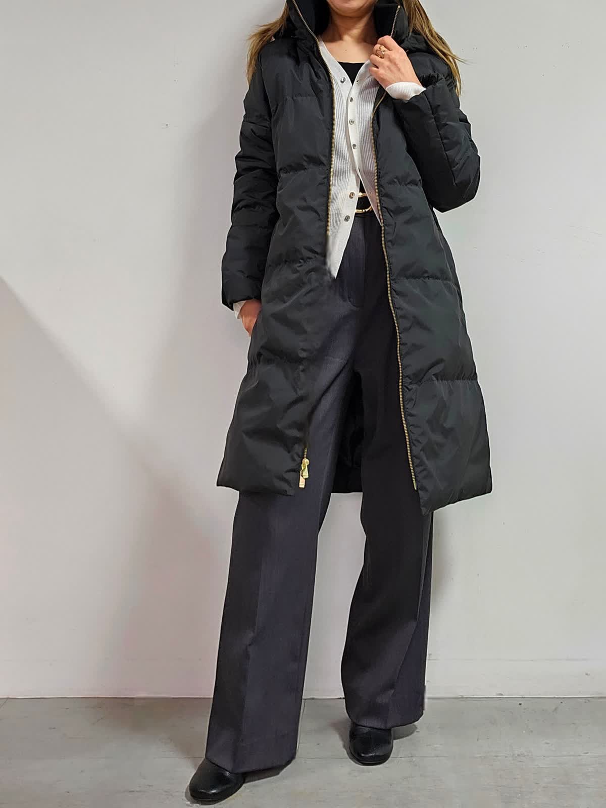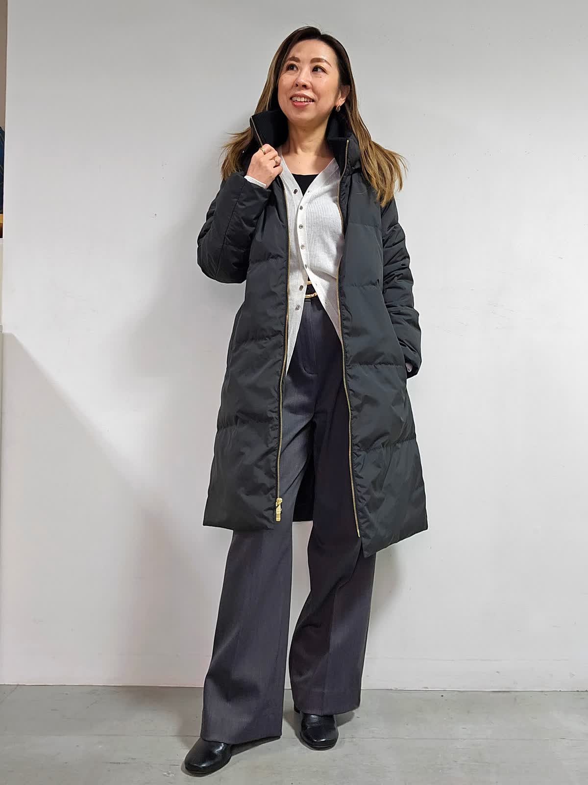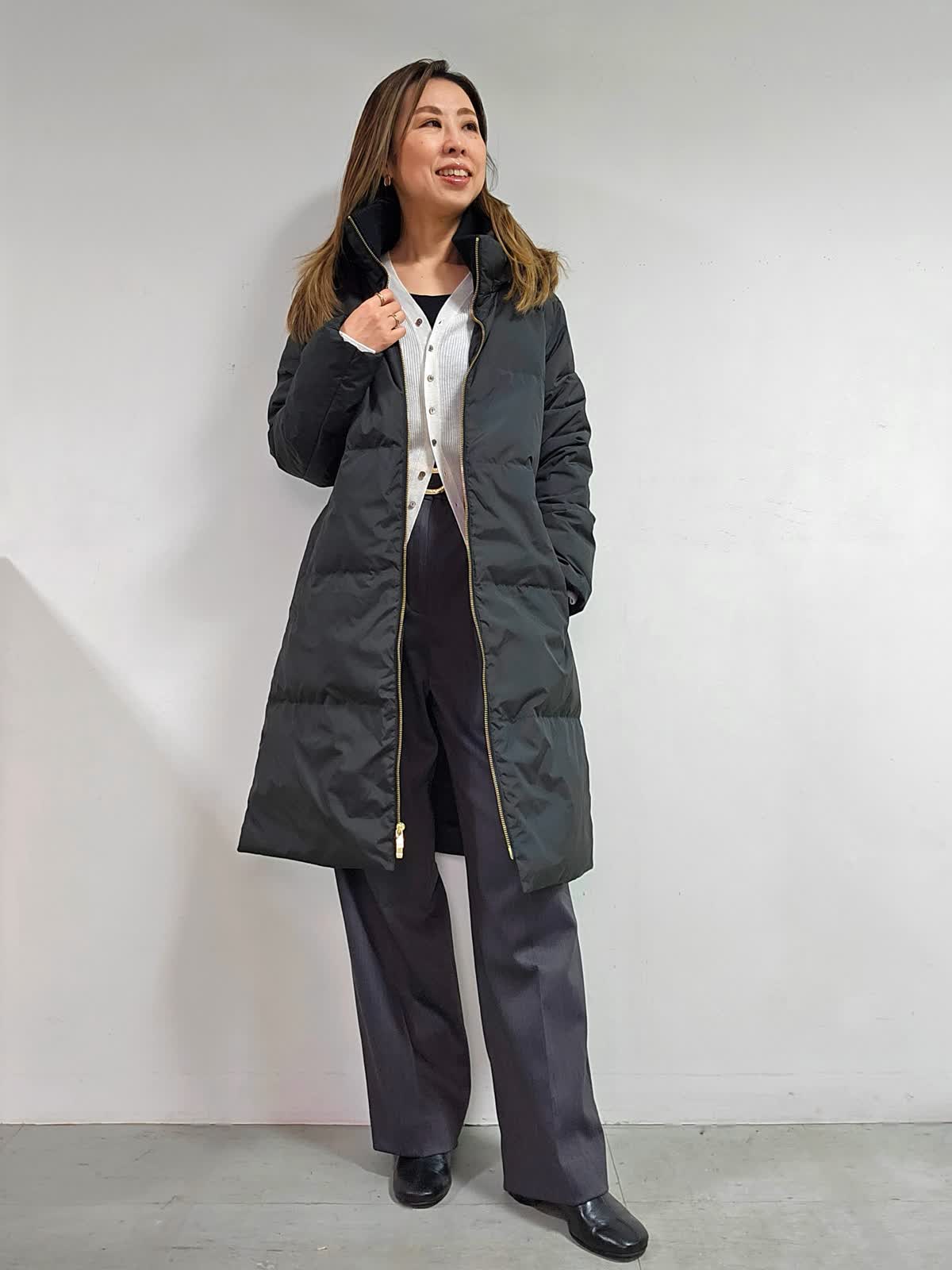 【着用カラー・サイズ】コート:ブラック・7号 ニット:オフホワイト・フリー パンツ:チャコールグレー・7号 冬に大活躍のダウンコート☆ 一枚で暖かく、冬の防寒対策に適したアイテム。 「太って見える」「野暮ったくなりそう」と気になる点も多いと思いますが、すっきり見えが叶うシルエットなので、今っぽいバランスのきれい目コーデが完成しやすいですよ!