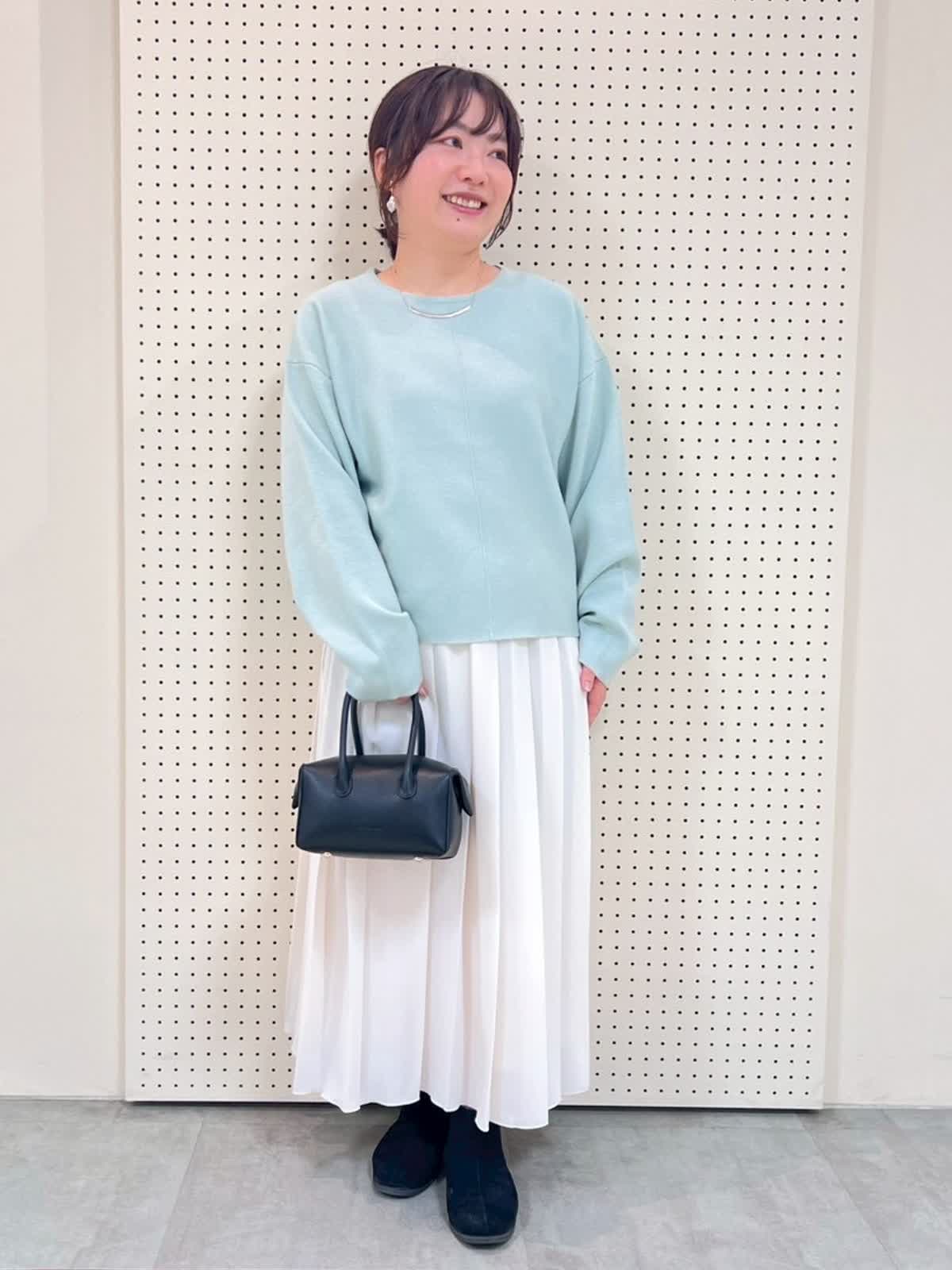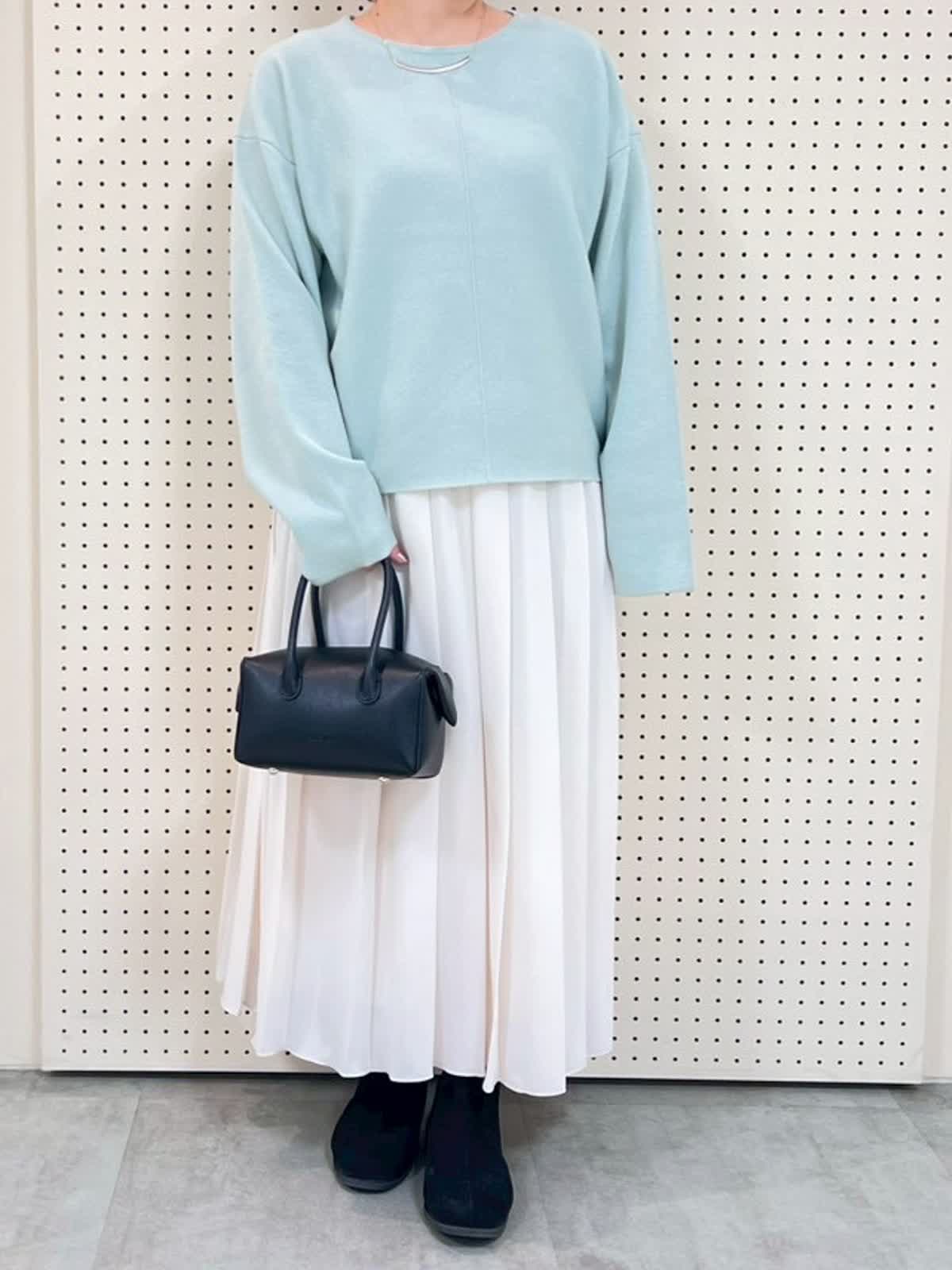 【着用サイズ】全て9号、フリー 【着用カラー】ニット:ペパーミント スカート:オフホワイト 綺麗色ニットコーディネート。明るいカラーのニットは春を先取りできるのでおすすめです。袖周りはゆったりなので、寒い日はインナーを重ね着しても◎スカートもウエストがゴムで履き心地抜群。しわにもなりにくくお仕事にもおすすめです。