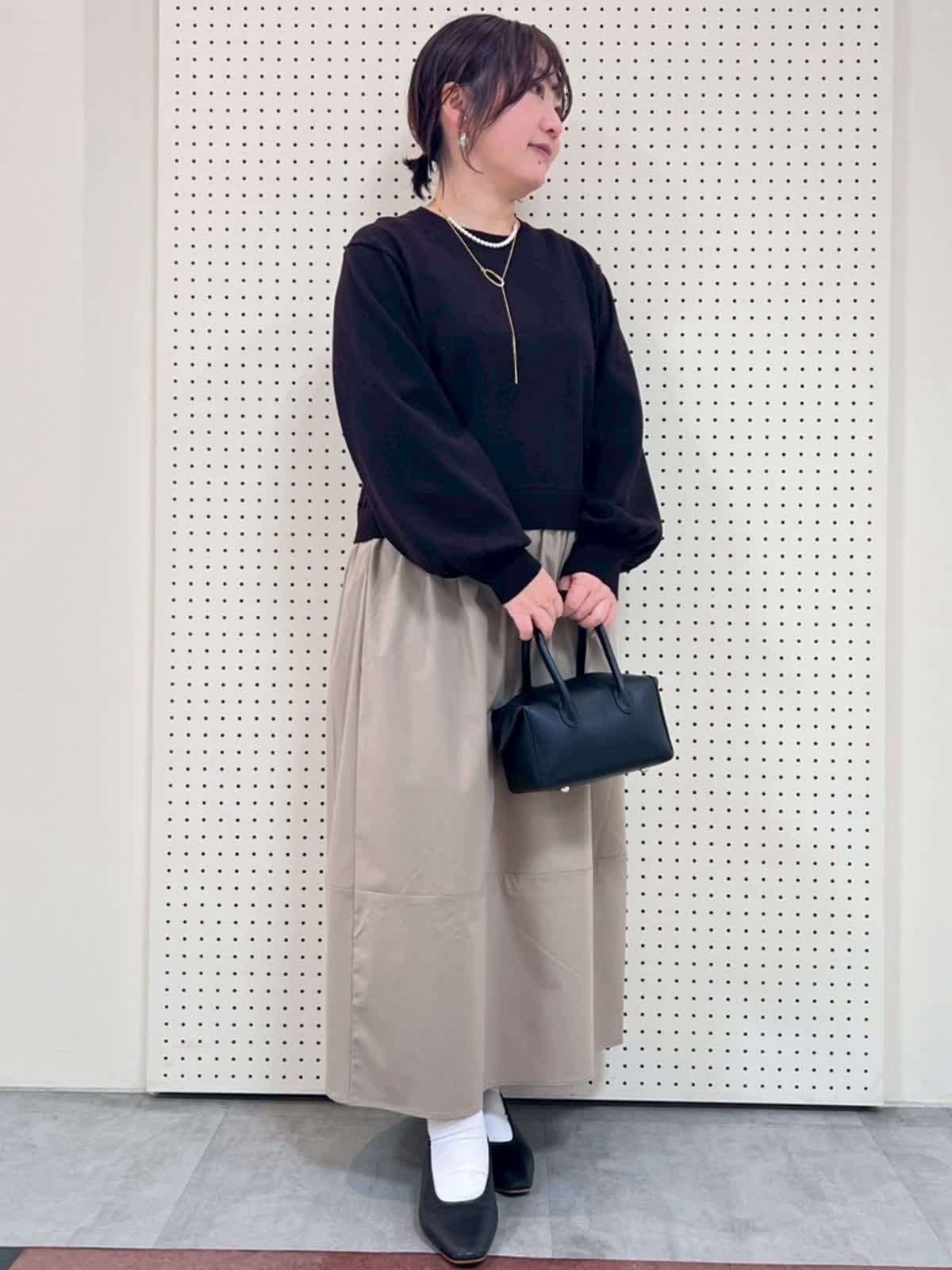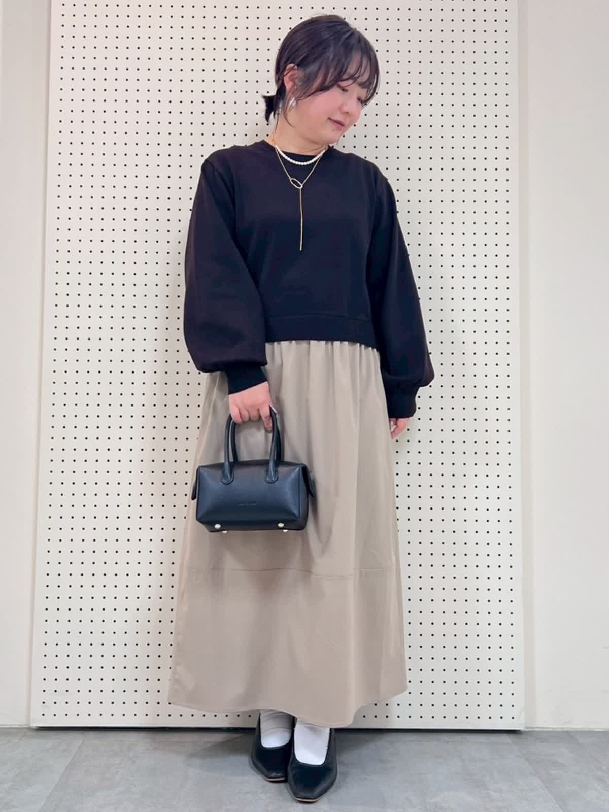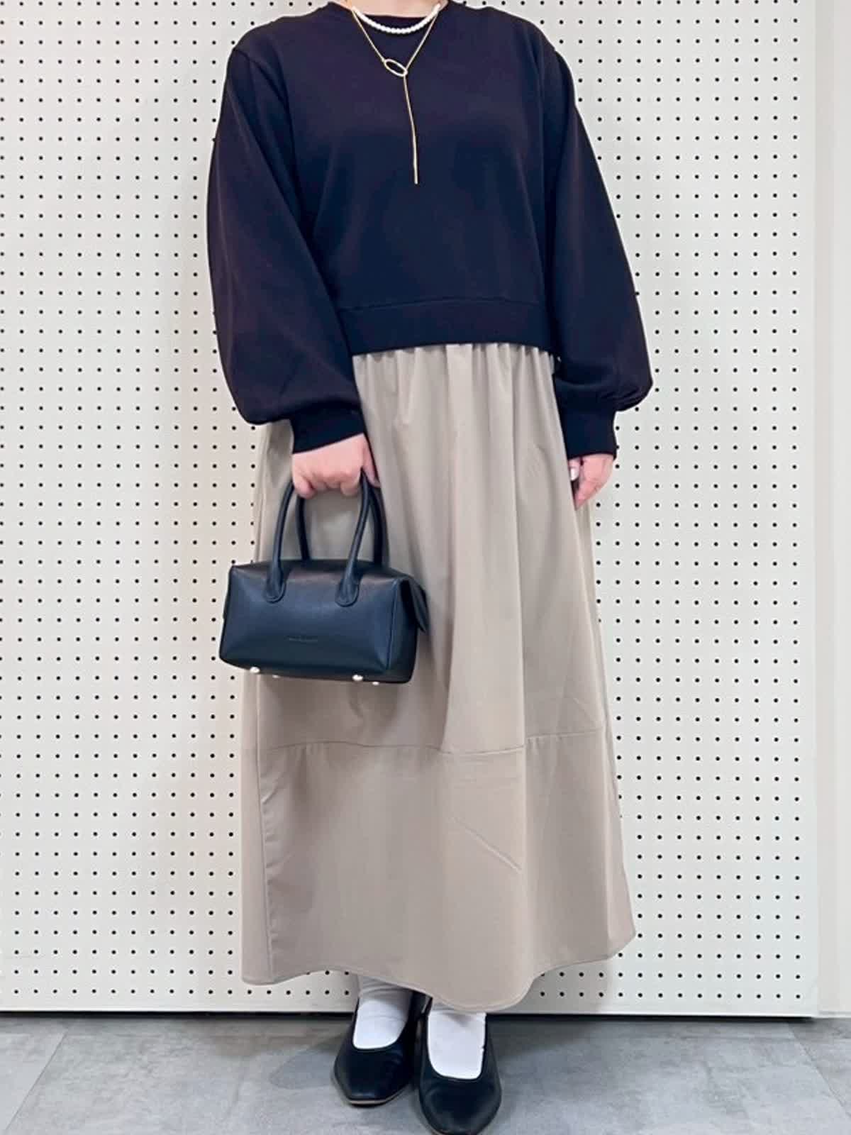 【着用サイズ】9号【着用カラー】ワンピース:キャメル ワンピースコーディネート。ワンピースは身長149pで9号だと、くるぶし丈の長さ。肌触りの良い素材で着心地抜群です。スカート部分はさらっとしていて、しわにもなりにくいです。1枚でさまになり、お出かけにもおすすめです。