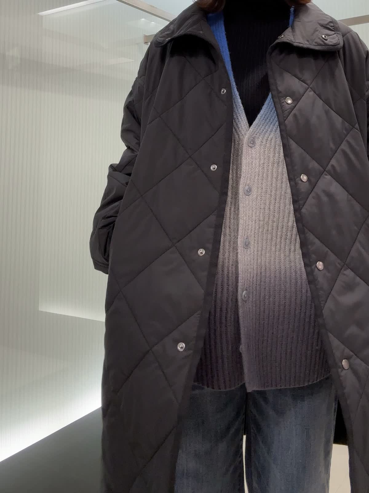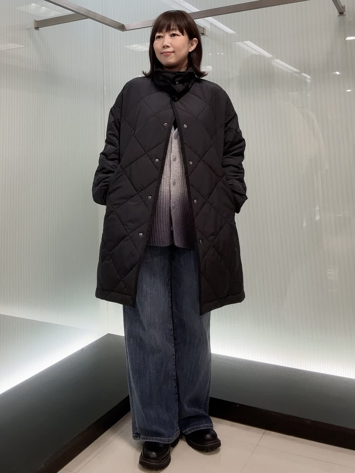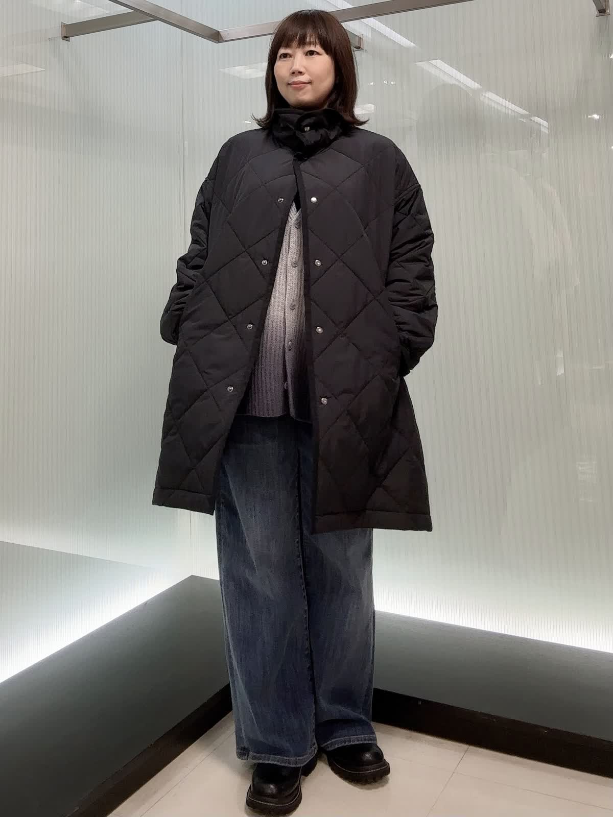 【着用サイズ】コート フリー ニット、パンツ9号 【着用カラー】コート ブラック ニット ブルー コートは、軽くて保温性があり、シルエットがゆったりしているためインナーを選ばず羽織っていただけます。寒い日や気分によってスタンドカラーにすることも可能です