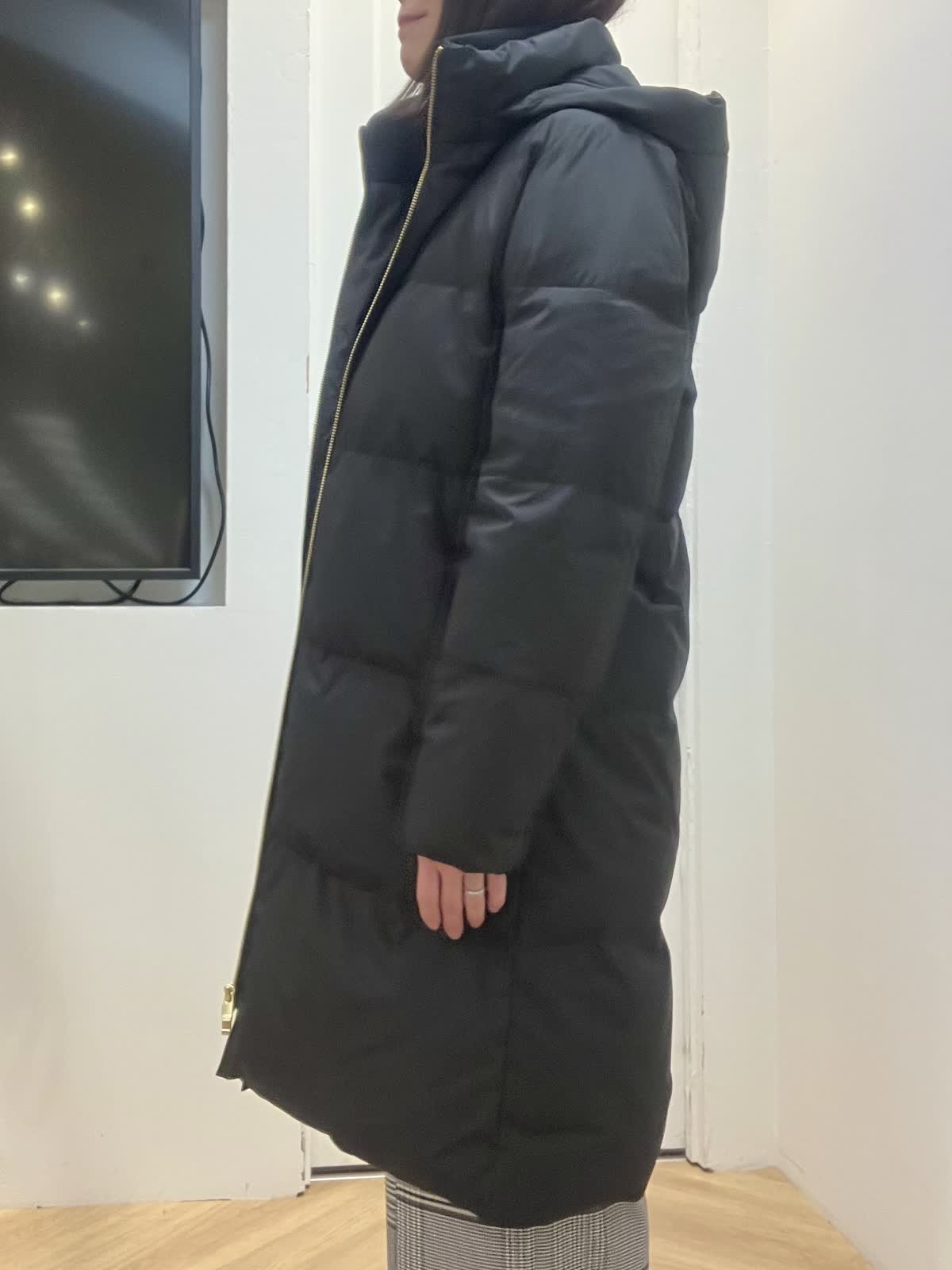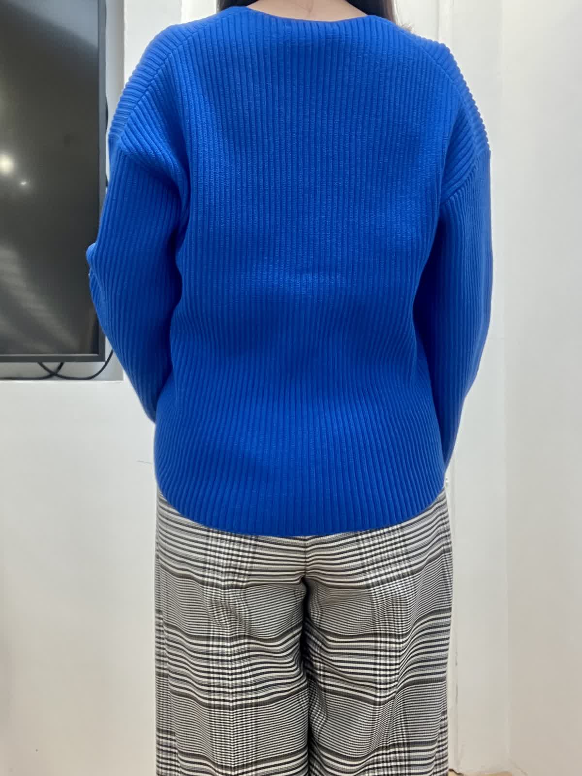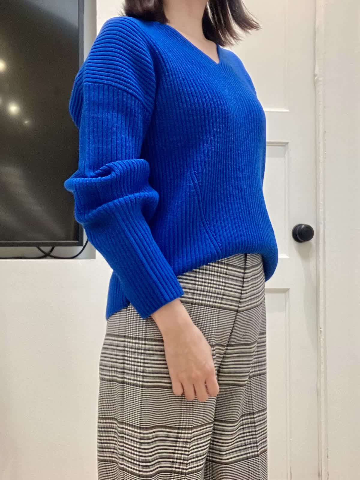 【着用サイズ】全て9号 【着用カラー】ニット:ブルー パンツ:柄大 ダウン:ブラック 開きすぎないVネックとほどよくゆとりがあるサイズ感の畦編みニット。軽くて柔らかく、毛のチクチク感が苦手な方でも大丈夫です。 大きめのチェック柄パンツはトップスに何色をもってきても映える万能パンツ!すっきりシルエットでスニーカー合わせも◎ ダウンはとにかく細見え効果抜群の美シルエット。モダンカラーで合わせてみました。