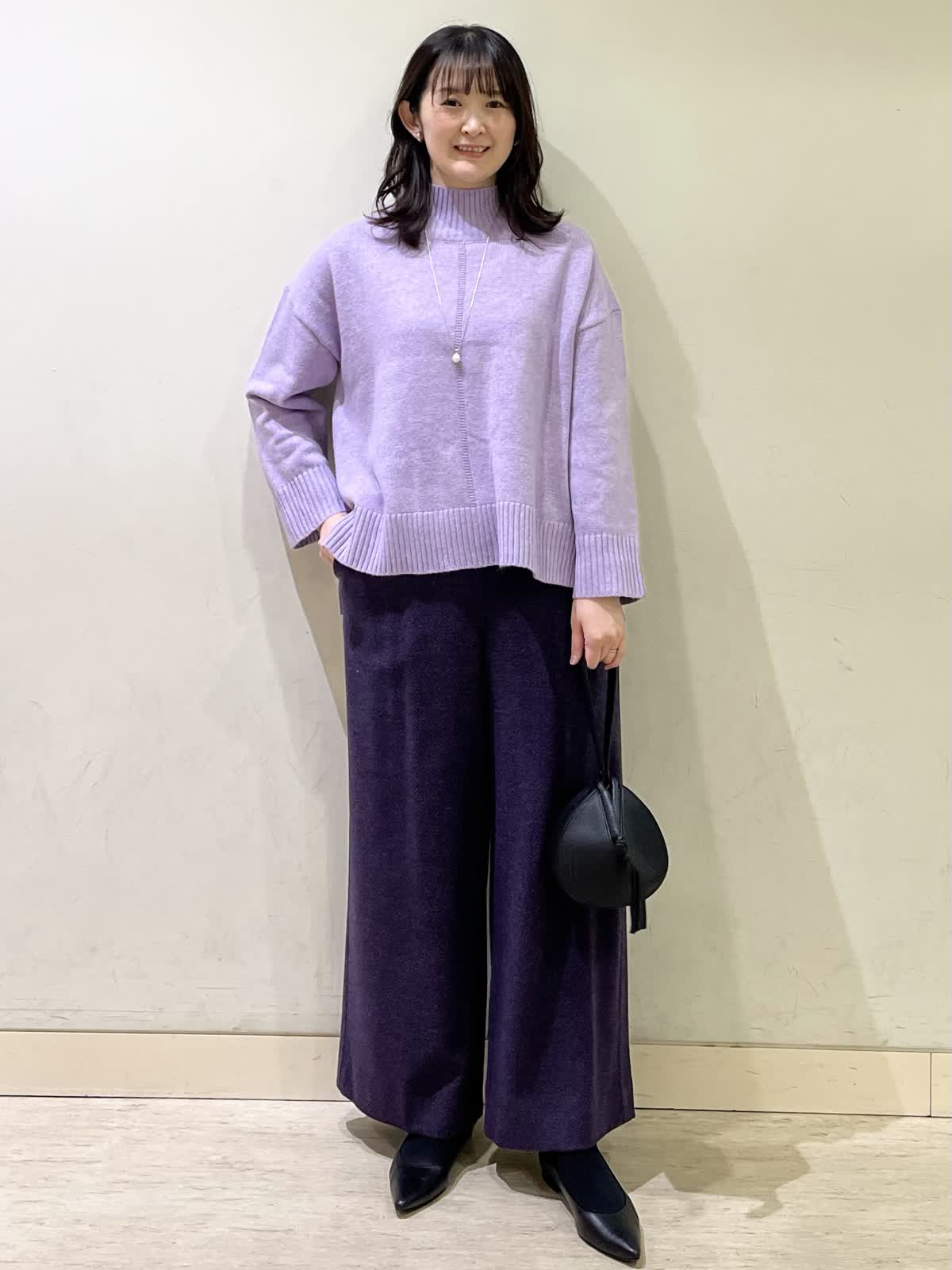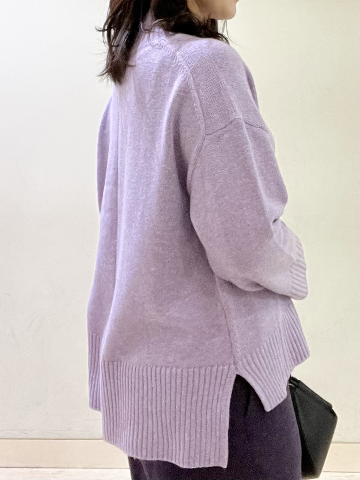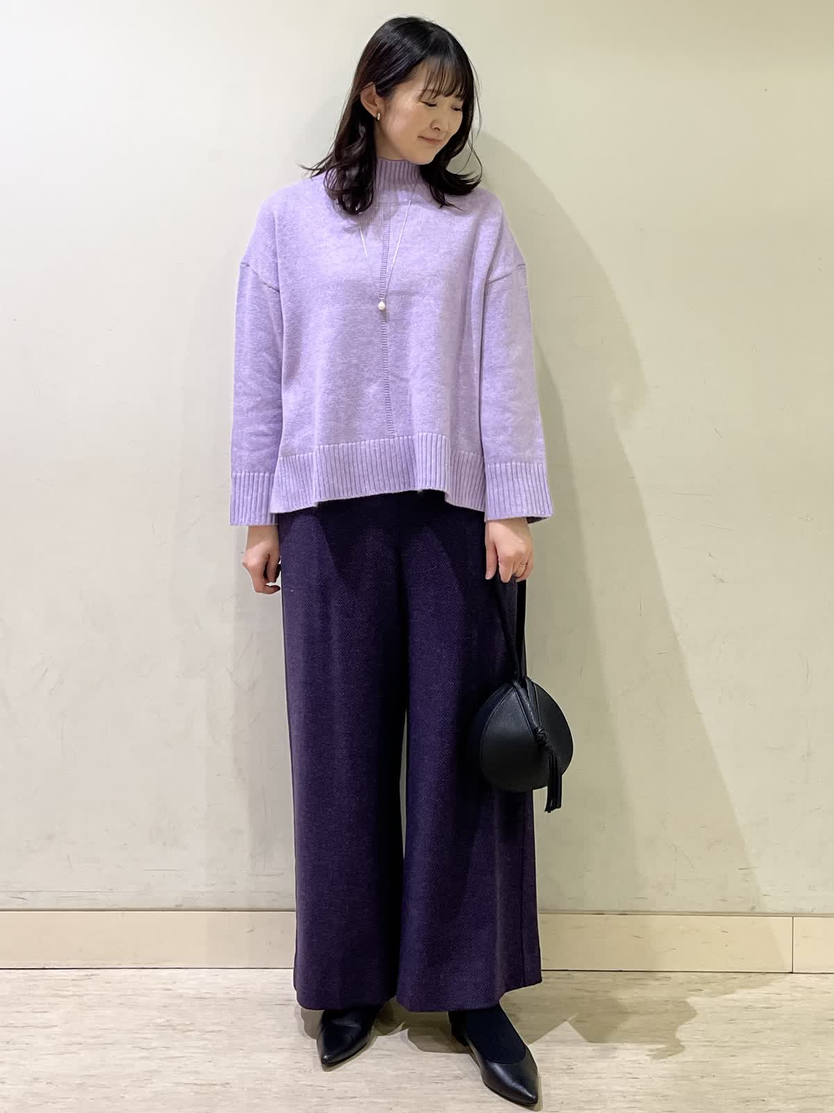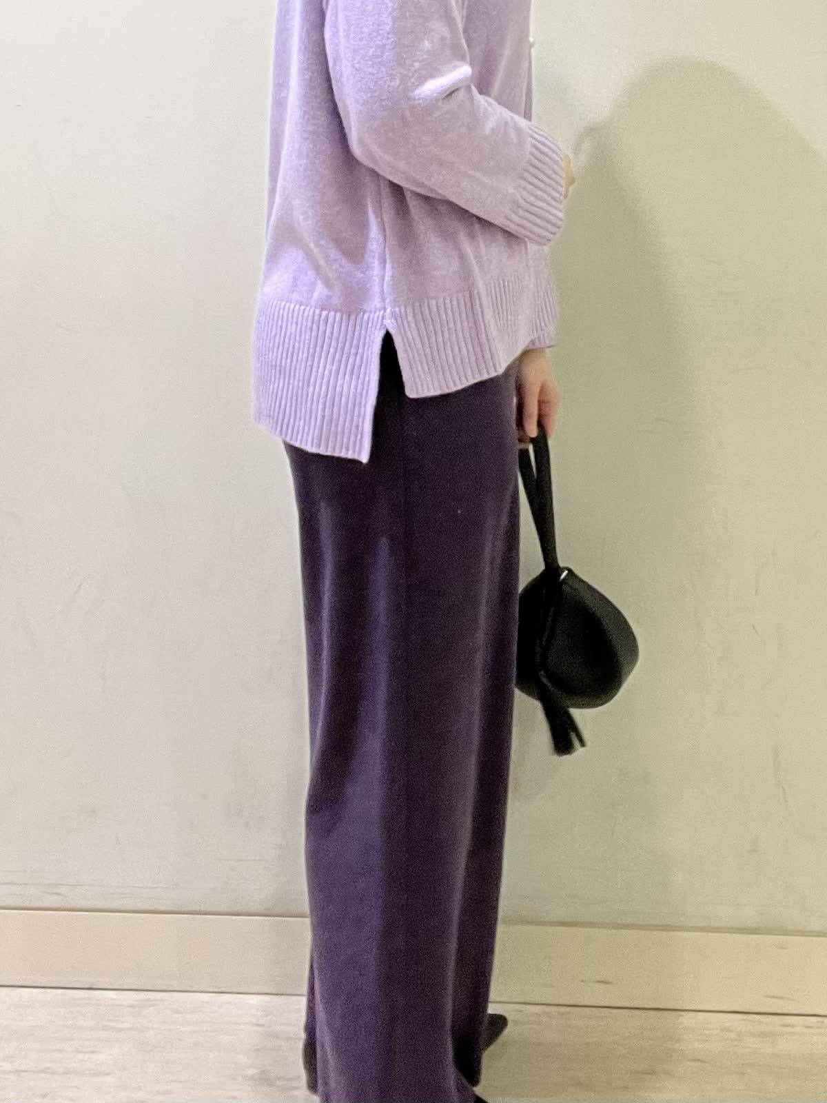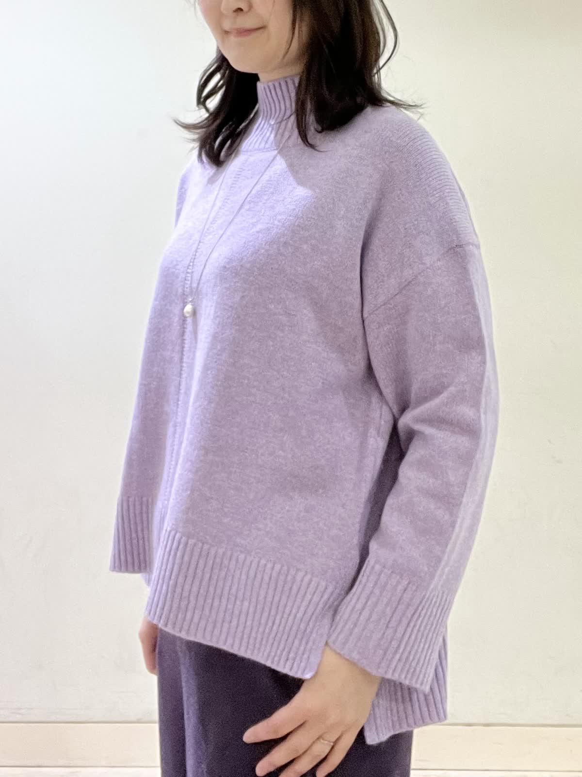 【着用カラー/サイズ】セーター:ラベンダー/フリー パンツ:パープル/9号 休日お出かけコーデ。ゆったりとしたサイズなので、休日のリラックスモードにおすすめのコーデです。セーターは、ふわっと柔らかい肌触りでチクチクしない素材です。首に添うハイネックで暖かさも◎ ヘリンボーン柄のパンツは、厚手で暖かいです。総ゴムで、楽な履き心地です。