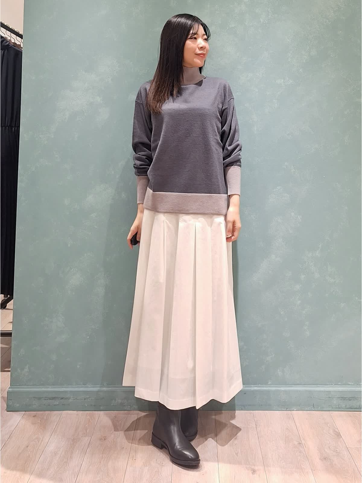 【着用サイズ、カラー】ニット:9号、チャコールグレー スカート:7号、オフホワイト アレンジ要らず!着るだけで決まる配色ハイネックニット。ウール100%のニットで程よく厚みもあるので暖かく着ていただけます。洗えるのも嬉しいポイントです。袖口はしっかりとしたリブ仕様で袖丈調節も可能です。裾サイドはスリット入りで落ち感があり、スッキリ着ていただけます。ボトムは白のタックプリーツスカートを合わせて春先まで着たい爽やかなコーディネートにしました。ぜひお試し下さい♪