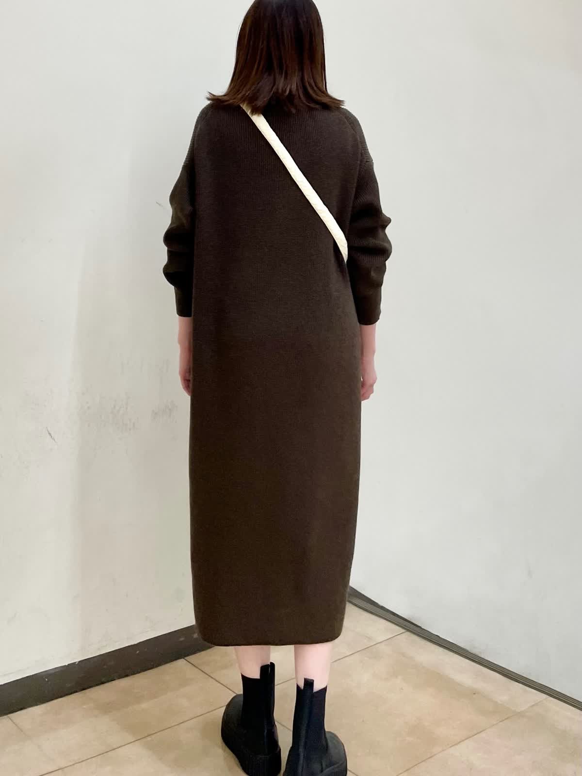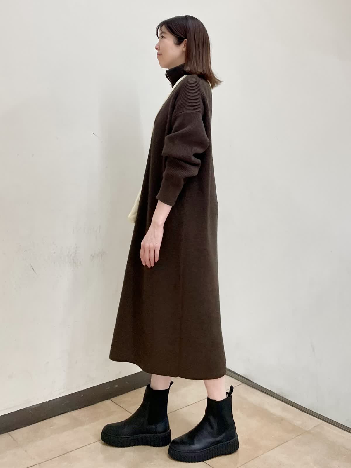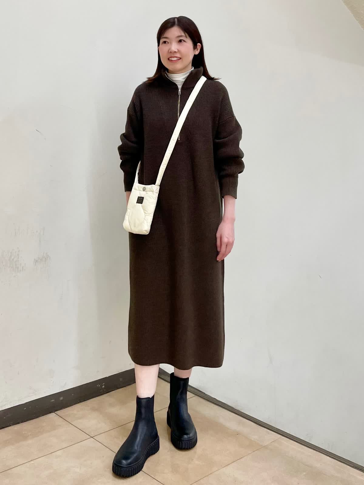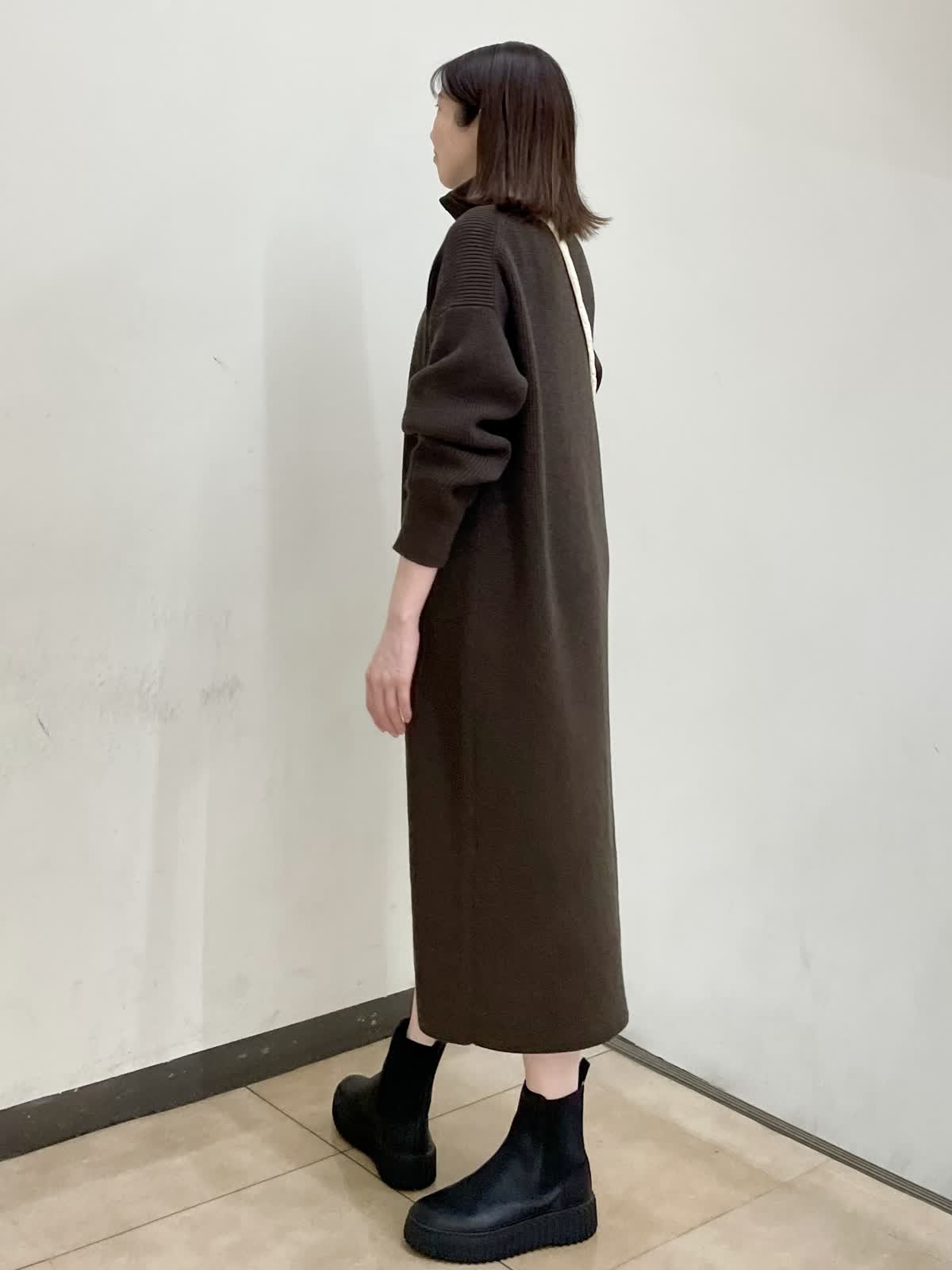【着用サイズ】ワンピース:フリー カットソー:9号 ゆったりとしたサイズ感のニットワンピース。体のラインを拾いにくい、ふくらみ感のある編地です。ハーフジップを開けて着るのもおすすめです。
