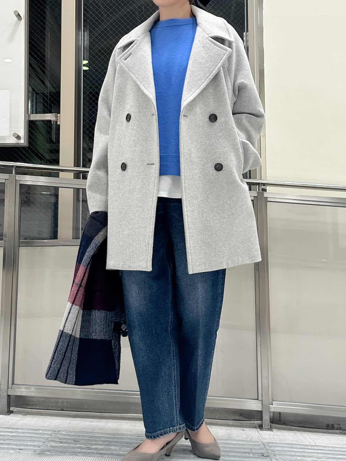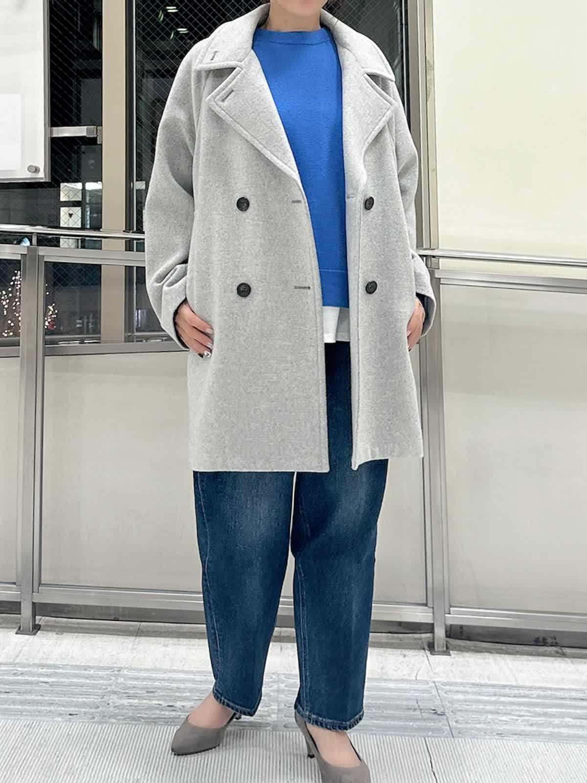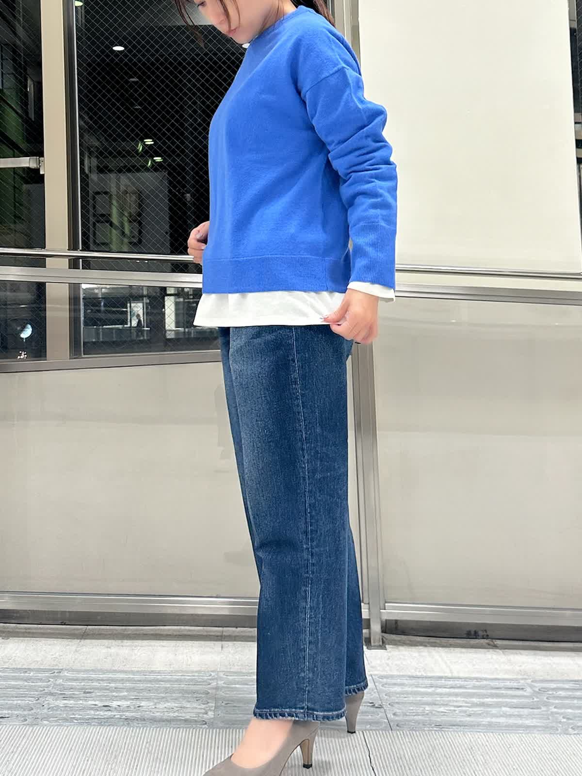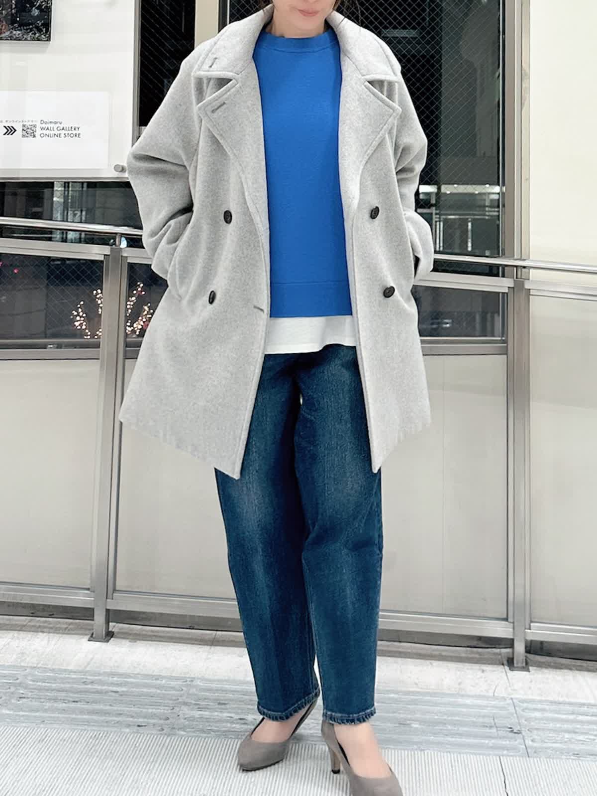 【着用サイズ/カラー】 コート:フリー/グレー ニット:9号/ブルー パンツ:9号/インディゴ カットソー:フリー/ホワイト 暗い色になりがちな冬のコーデを、鮮やかなブルーニットで華やかに。キレイ色のニットは春先まで重宝します。 ニットの裾から白をのぞかせて、抜け感をプラス。白ロンTを一枚インするだけで洗練された印象に。