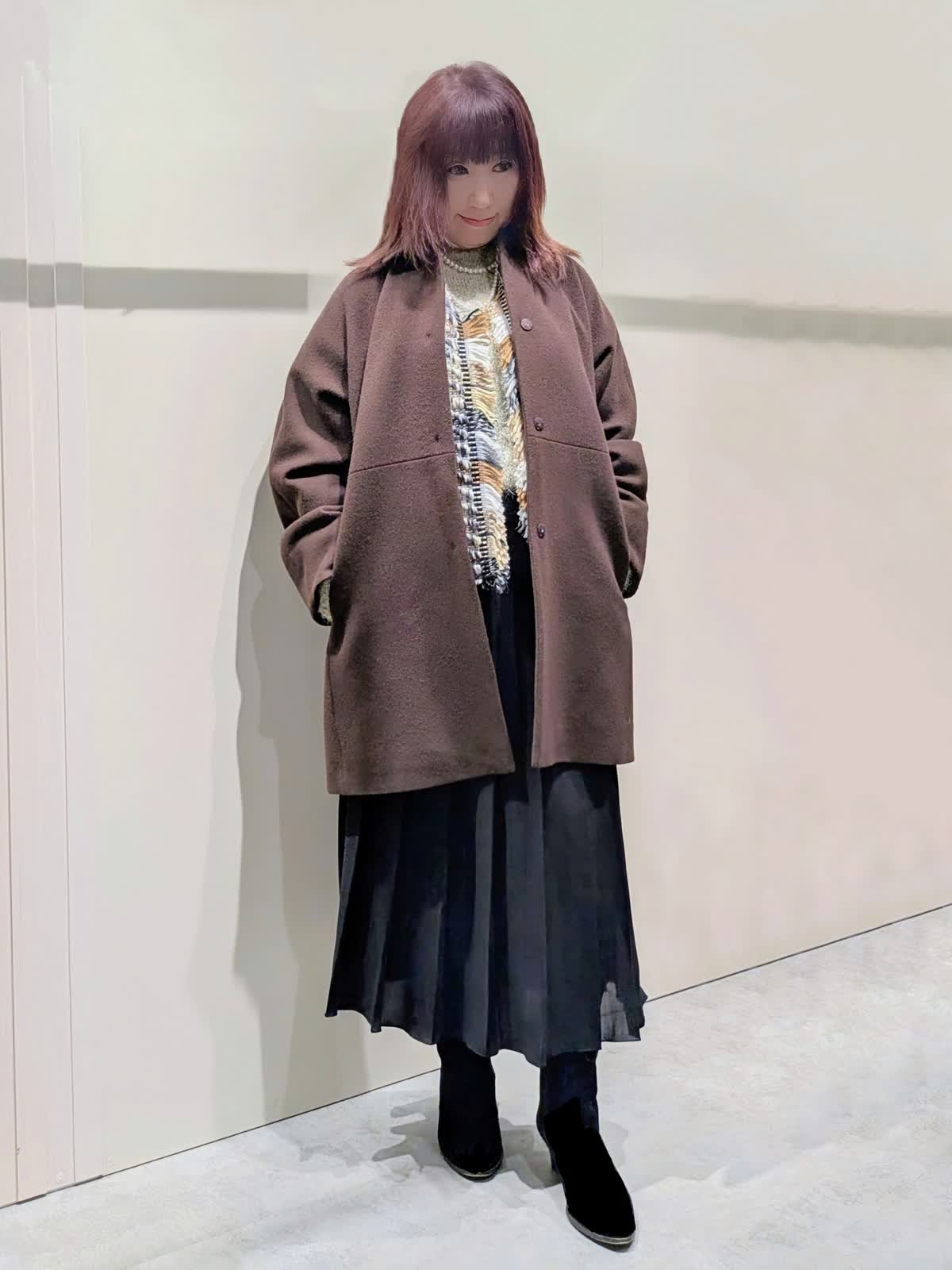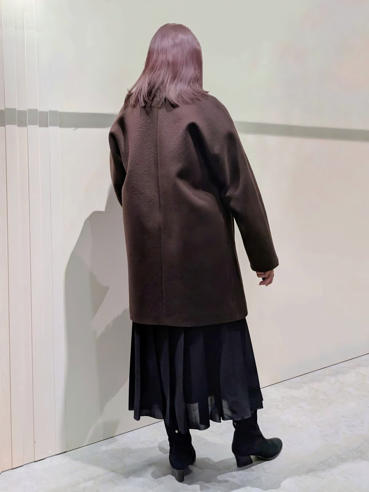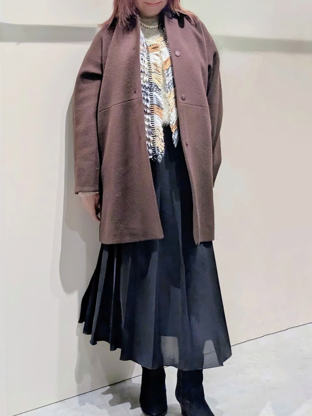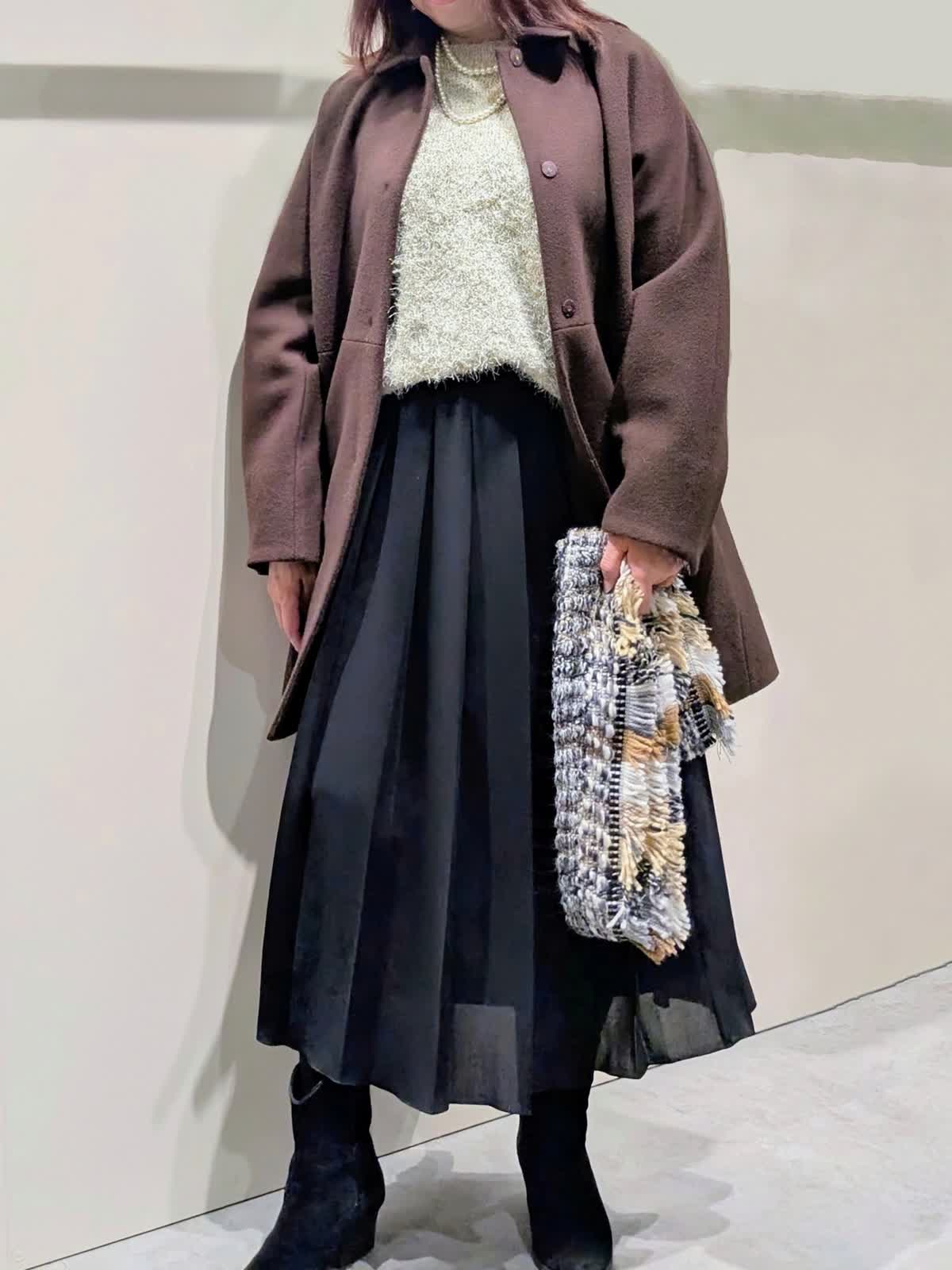 【着用サイズ】コート、プルオーバー、スカート:フリーサイズ【着用カラー】コート:ブラウン プルオーバー:オフホワイト スカート:ブラック 冬のお出掛けコーディネート 飽きのこないステンカラーのコートは、ややゆったり目のコクーンシルエットで着丈はやや短めでボトムを選ばず着ていただけます。上品な光沢感と軽くてなめらかな肌触りです。ラメ入りのフェザーヤーンニットプルオーバーは、華やかさのあるトレンド感漂う魅力ある1枚です。やや短めの着丈でゆったり着て頂けます。広め巾のプリーツスカートは、落ち感のあるスッキリとしたシルエットで、ウエストゴム仕様で快適な着心地です。