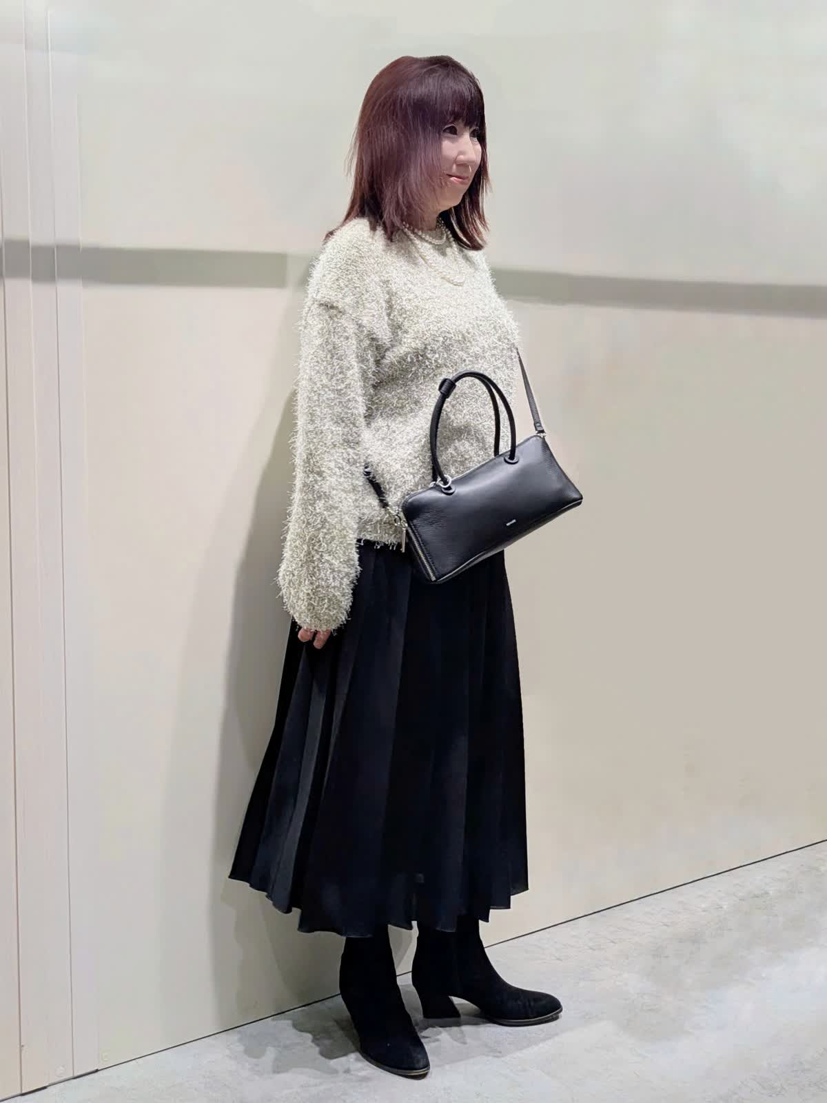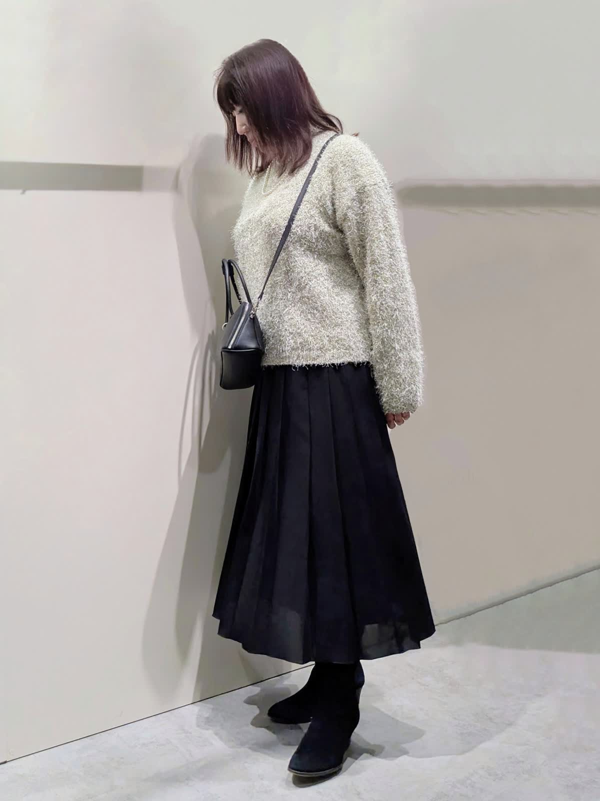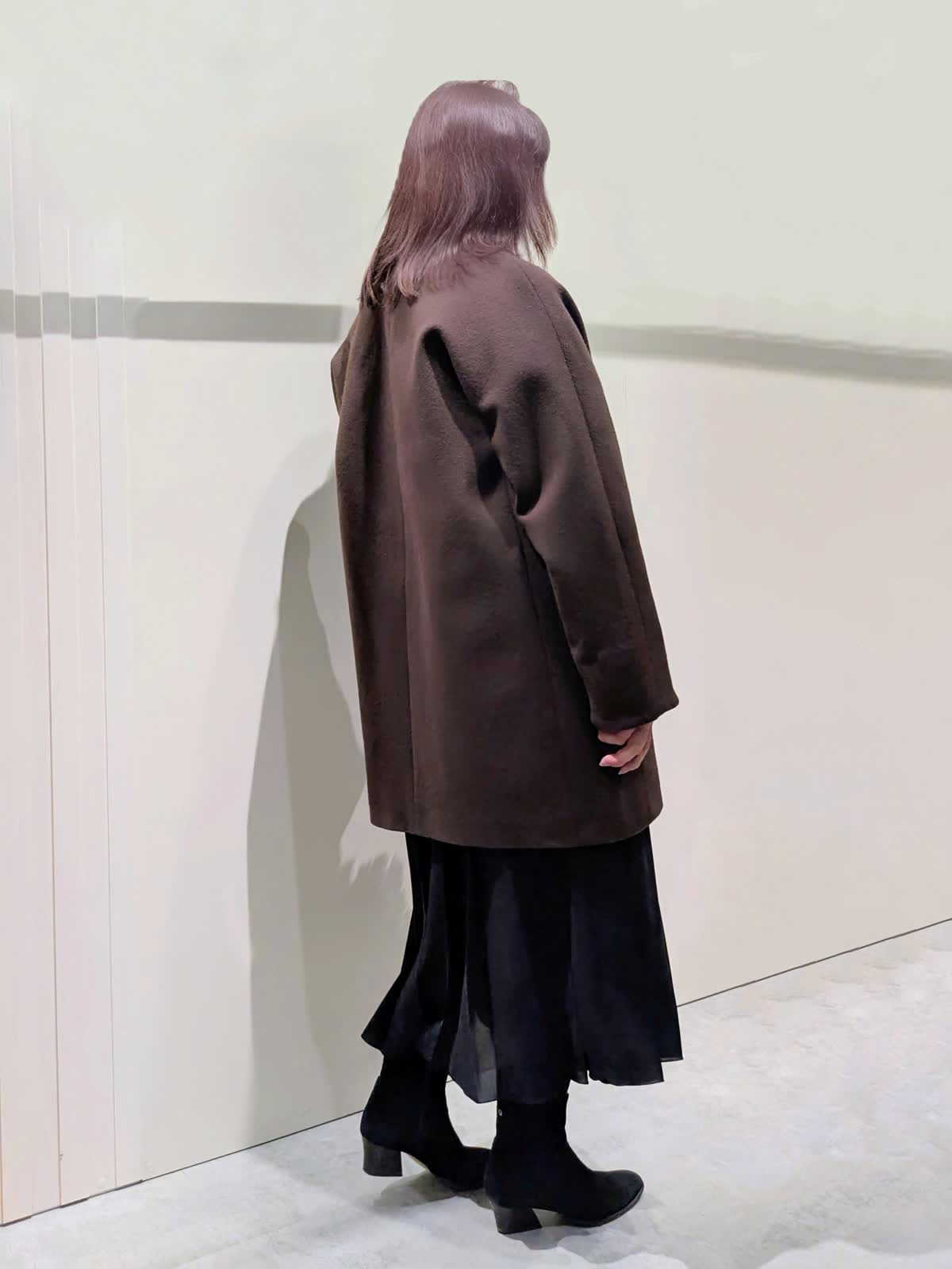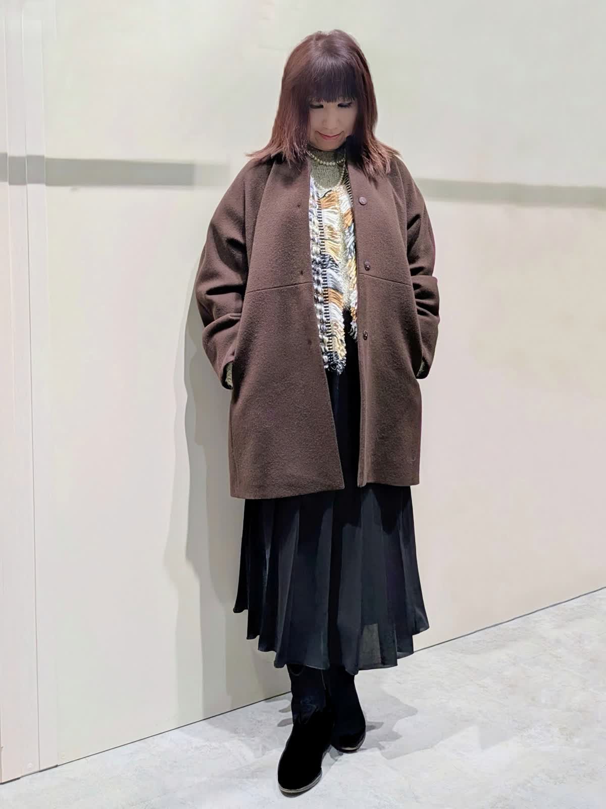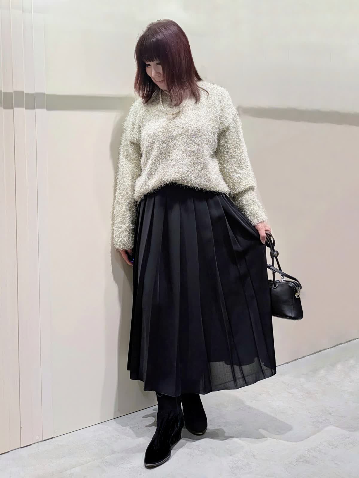 【着用サイズ】コート、プルオーバー、スカート:フリーサイズ【着用カラー】コート:ブラウン プルオーバー:オフホワイト スカート:ブラック 冬のお出掛けコーディネート 飽きのこないステンカラーのコートは、ややゆったり目のコクーンシルエットで着丈はやや短めでボトムを選ばず着ていただけます。上品な光沢感と軽くてなめらかな肌触りです。ラメ入りのフェザーヤーンニットプルオーバーは、華やかさのあるトレンド感漂う魅力ある1枚です。やや短めの着丈でゆったり着て頂けます。広め巾のプリーツスカートは、落ち感のあるスッキリとしたシルエットで、ウエストゴム仕様で快適な着心地です。
